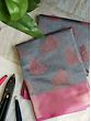 A soft drape of Swiss cotton is made even more delicate with the lovely grey and pink pairing on the body and the border. The field of the Banarasi saree has a unique collection of motifs created with golden threads.