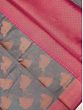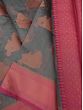 Huts with trees and floral butas add an artistic boldness to the grey fabric. On the border of the saree, the pink tone is ornamented with brocaded ethnic motifs to give it a rich appeal.