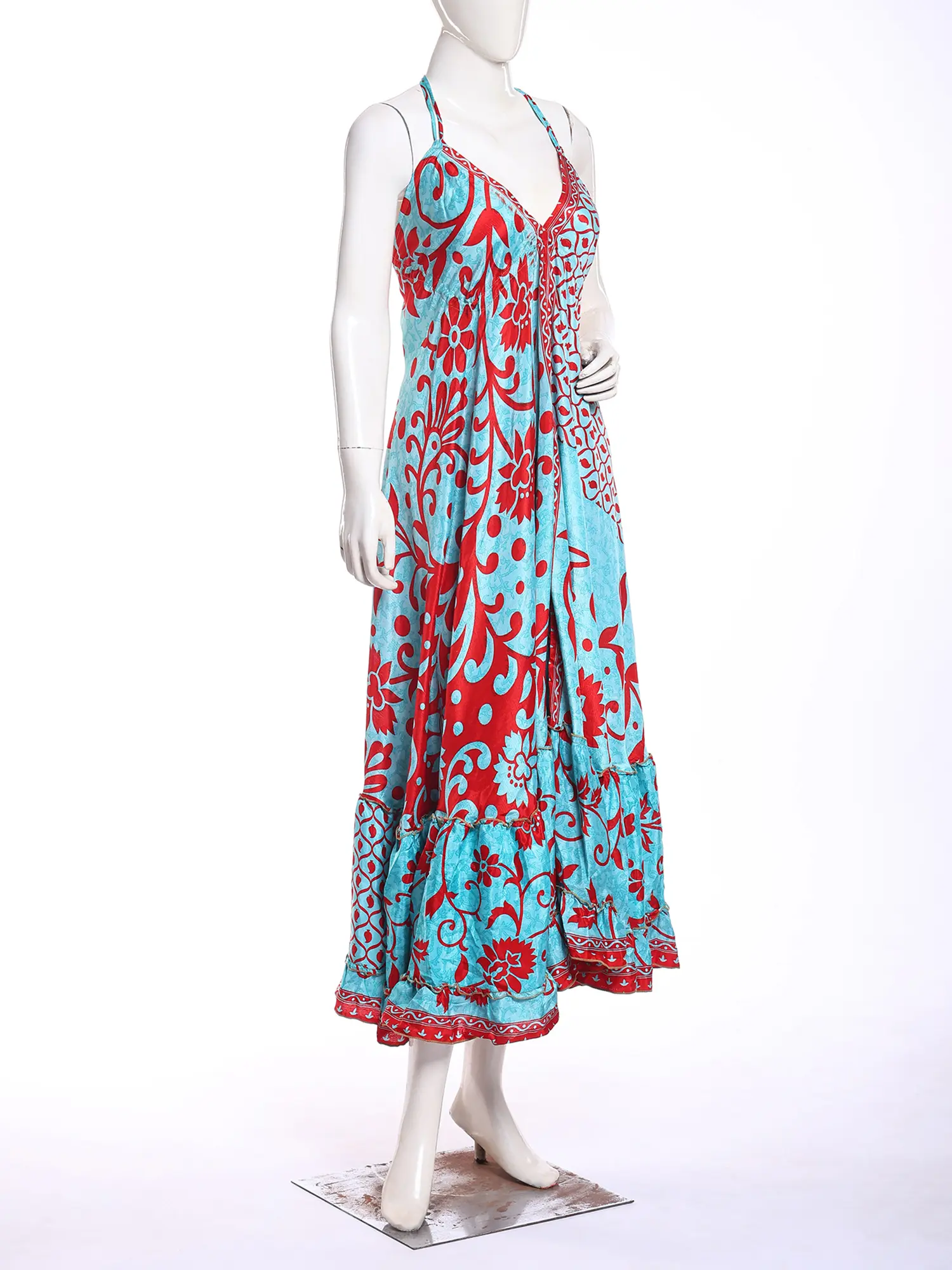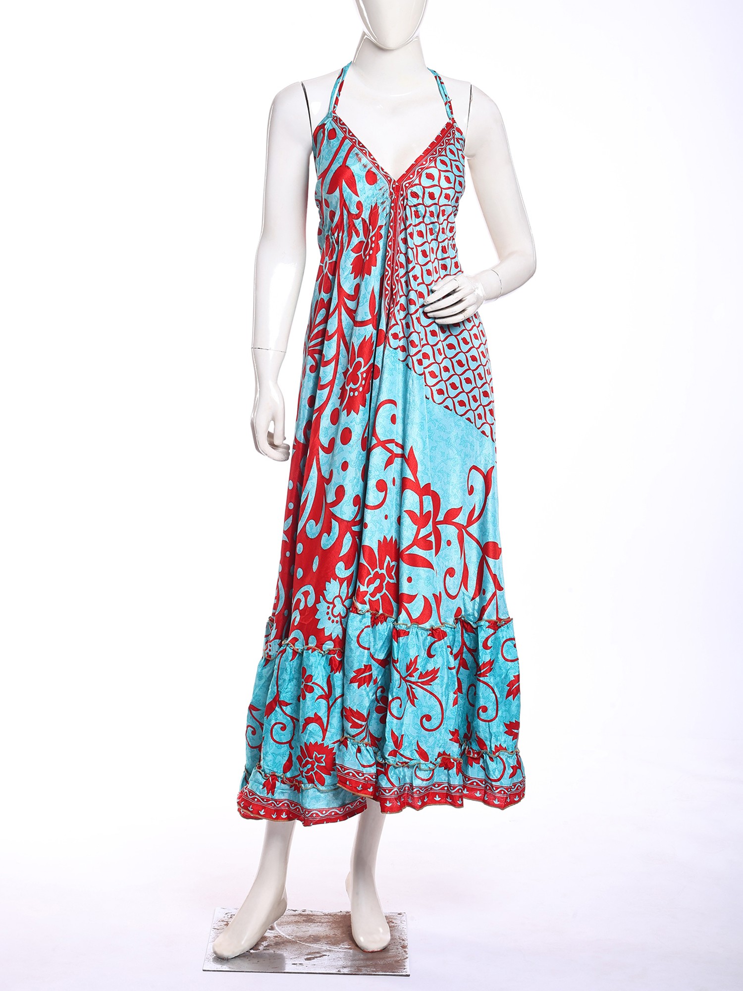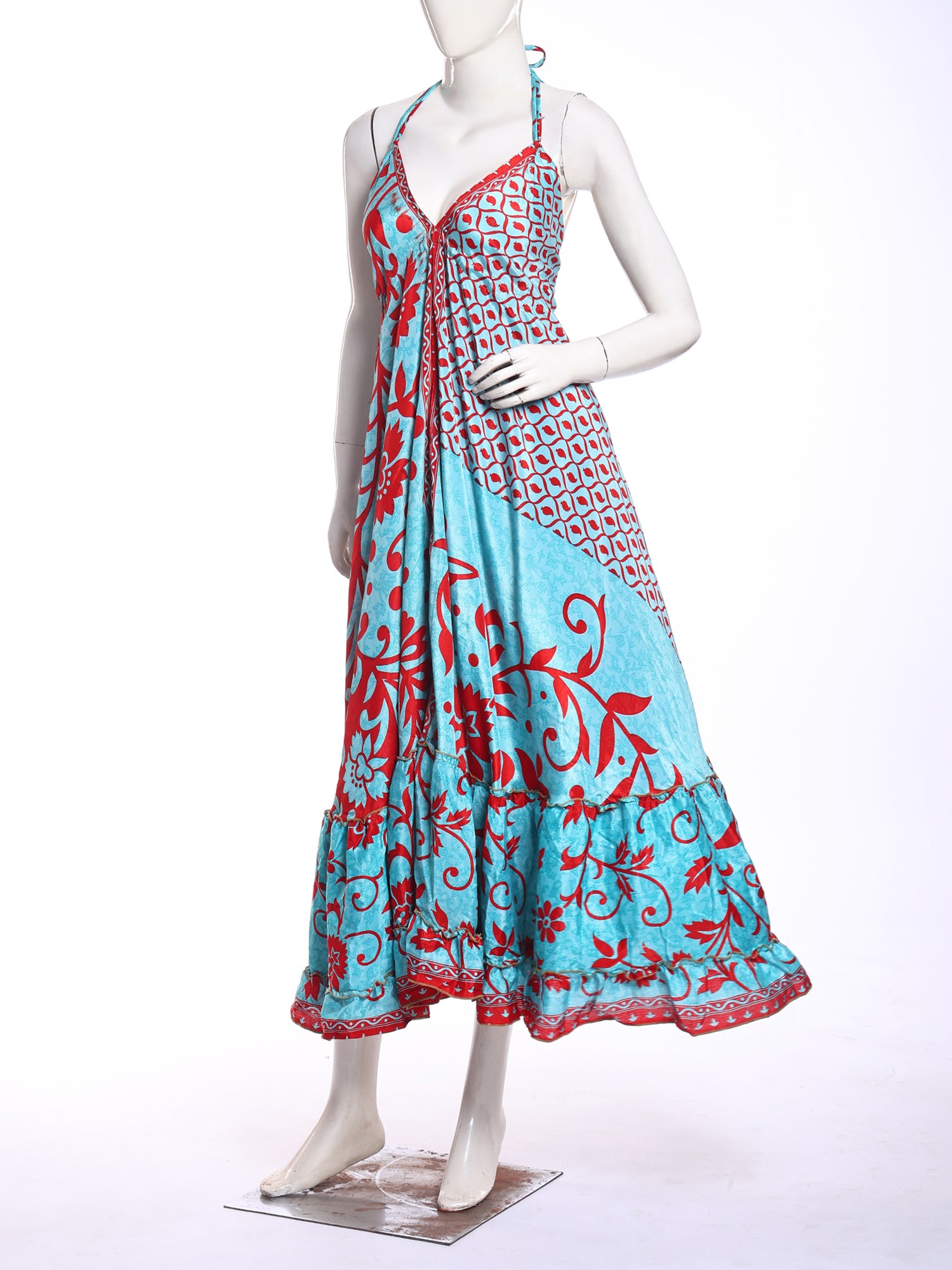 Adorned with a captivating print, this maxi-length creation is a testament to artisanal design. The eye-catching pattern, featuring a harmonious blend of sky blue and vivid red, flows seamlessly across the silk. Its halter neckline gracefully frames your décolletage, while the generous fifty-one inches of length create a dramatic, sweeping silhouette that elongates your form. The design ensures a comfortable fit, with a bust measuring thirty-six inches, designed to flatter.