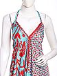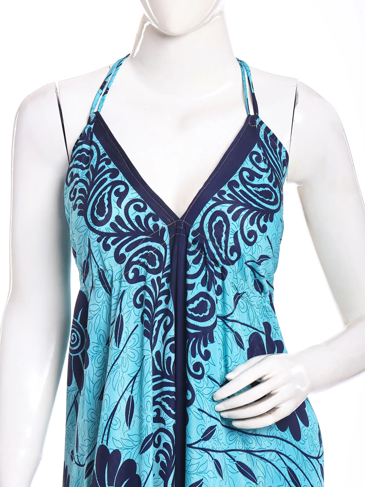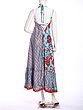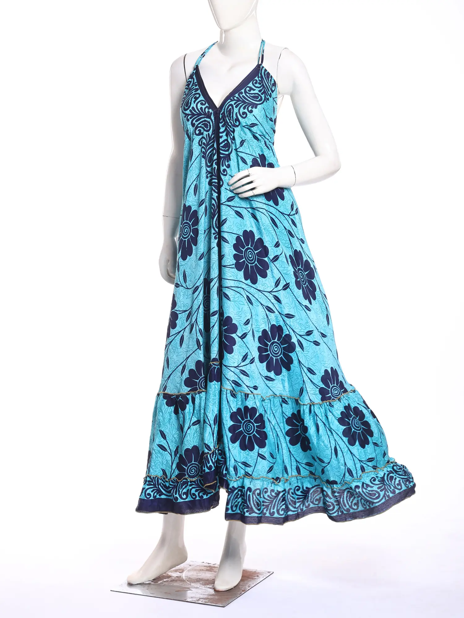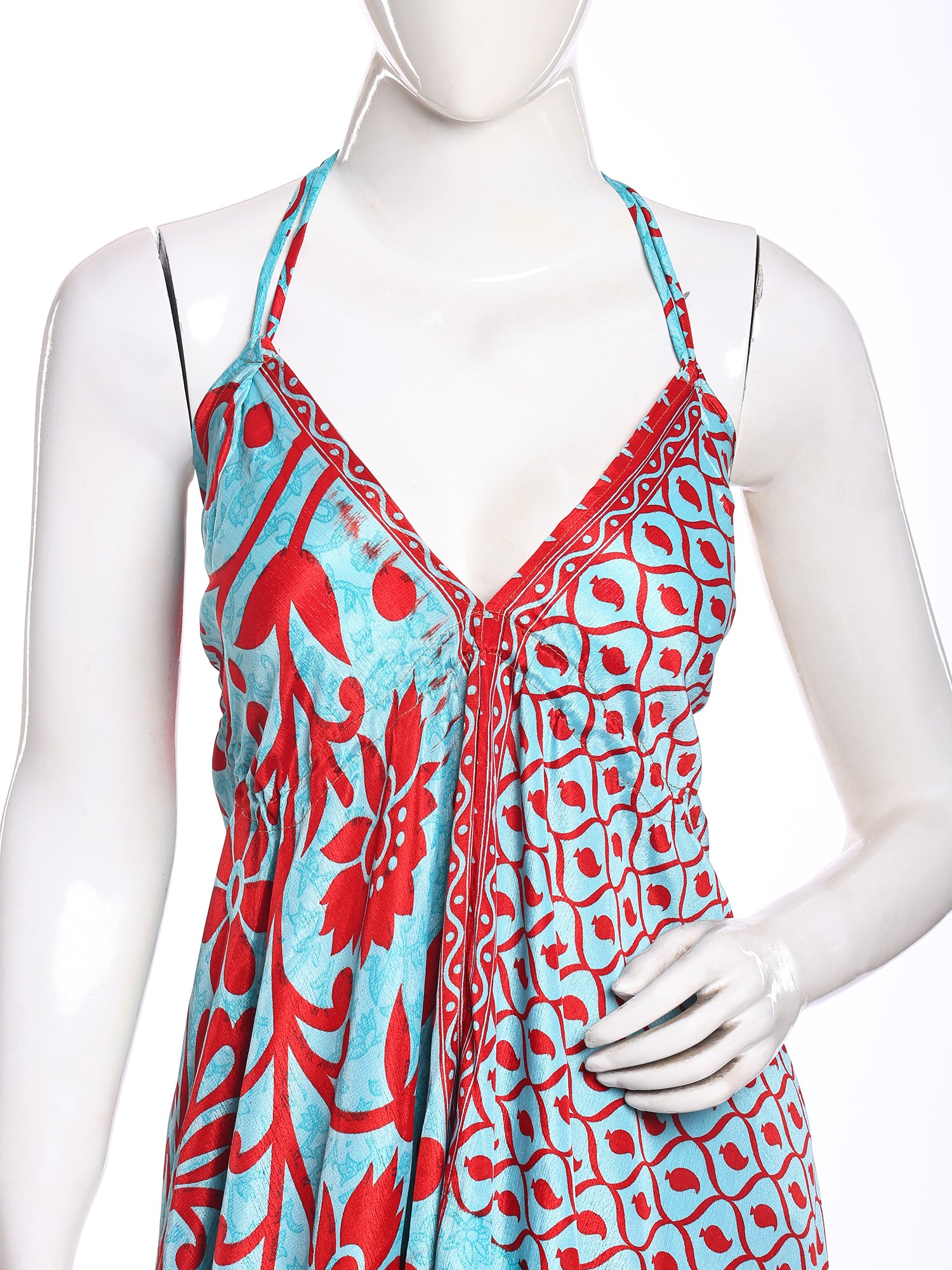 Adorned with a captivating print, this maxi-length creation is a testament to artisanal design. The eye-catching pattern, featuring a harmonious blend of sky blue and vivid red, flows seamlessly across the silk. Its halter neckline gracefully frames your décolletage, while the generous fifty-one inches of length create a dramatic, sweeping silhouette that elongates your form. The design ensures a comfortable fit, with a bust measuring thirty-six inches, designed to flatter.