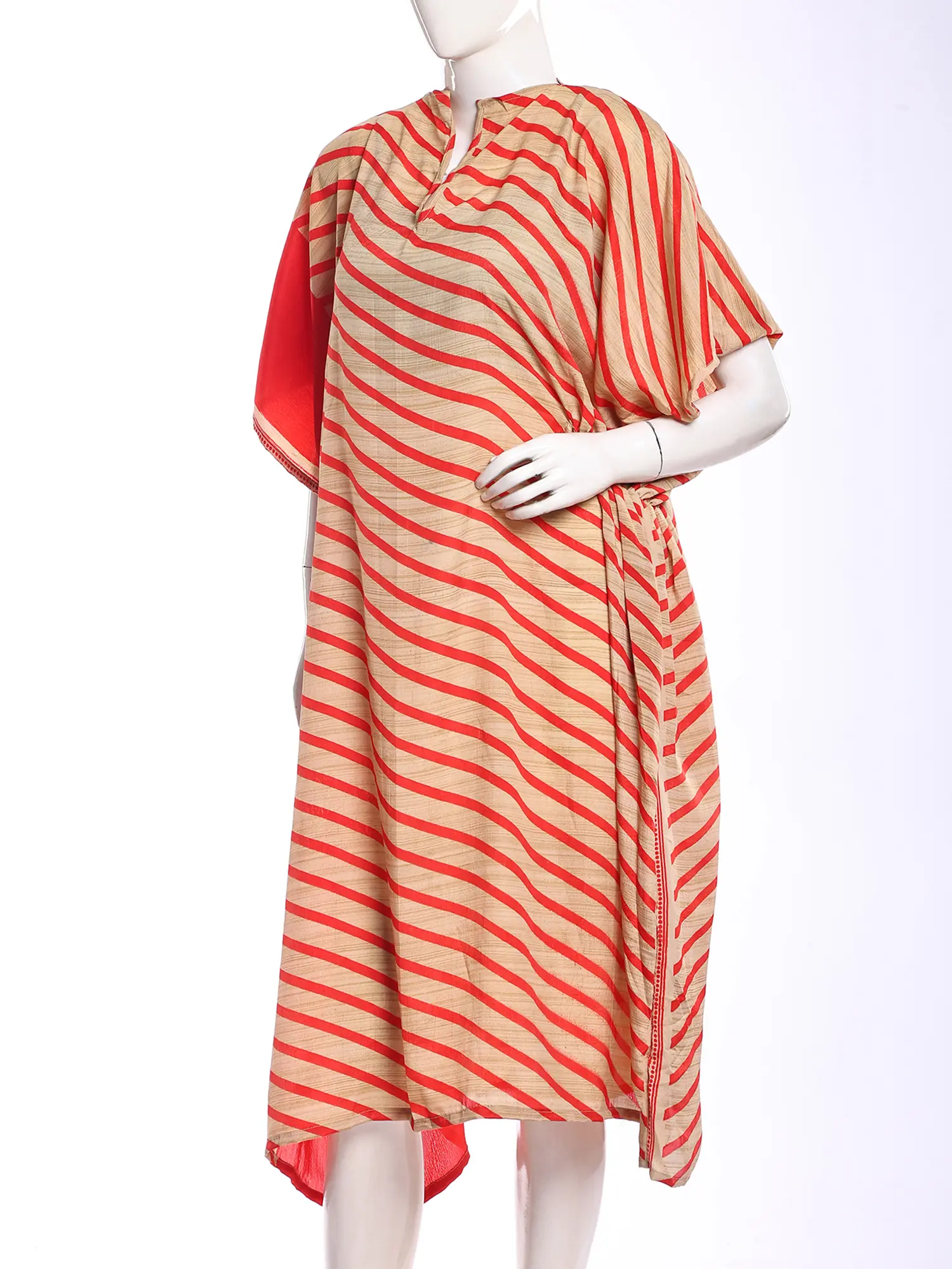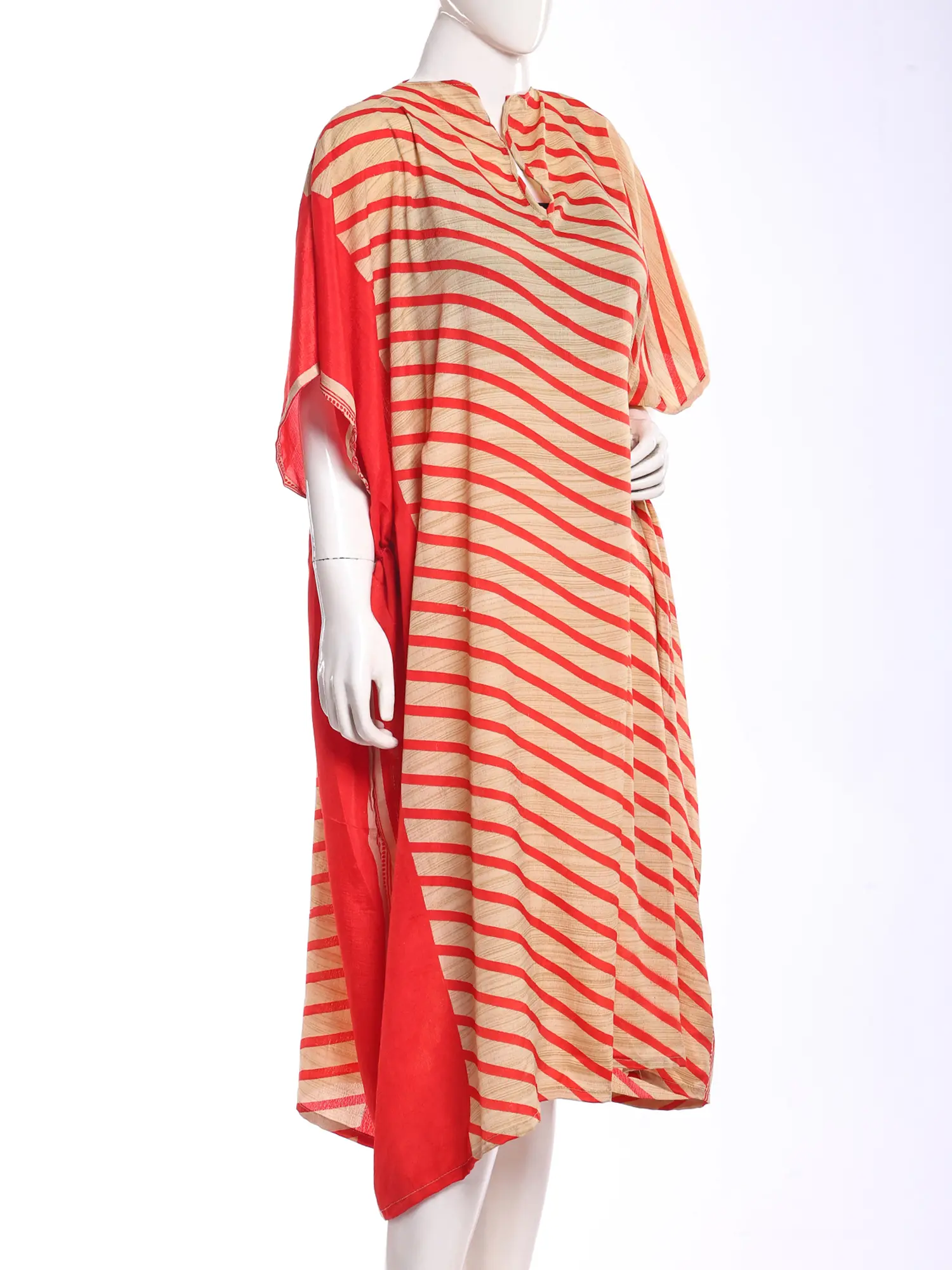 You'll be captivated by the interplay of colors and the graceful drape of the silk, which moves with an ethereal fluidity. The striking diagonal stripes create a dynamic visual effect, while the contrasting solid panels add depth and sophistication. Its thoughtfully designed silhouette offers a flattering, free-spirited appeal, ensuring you feel both comfortable and chic.