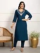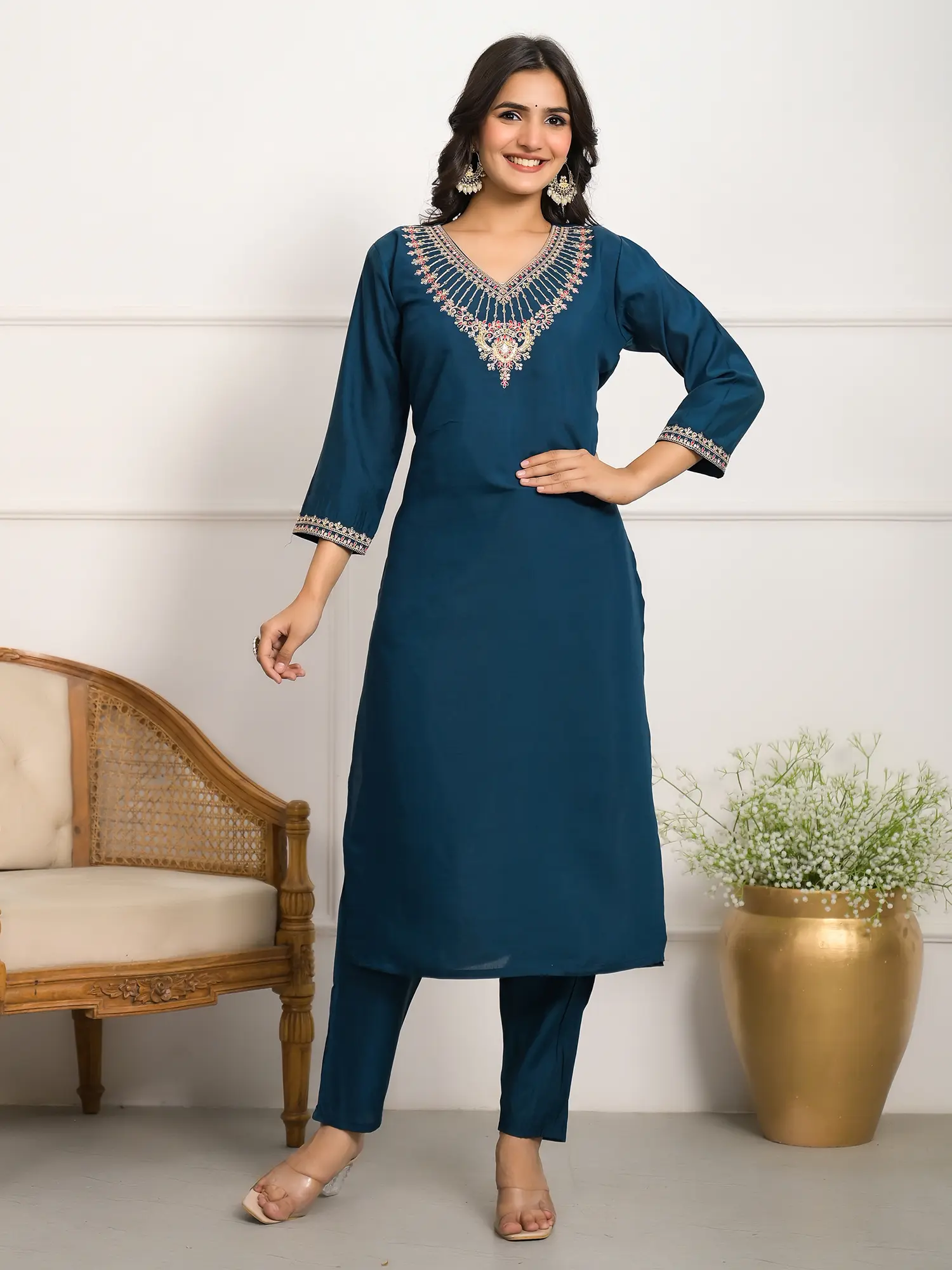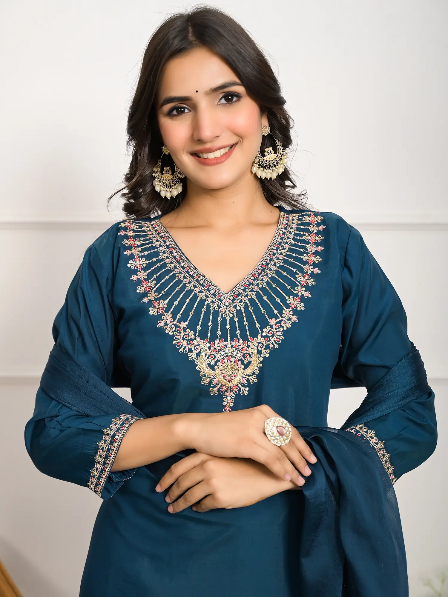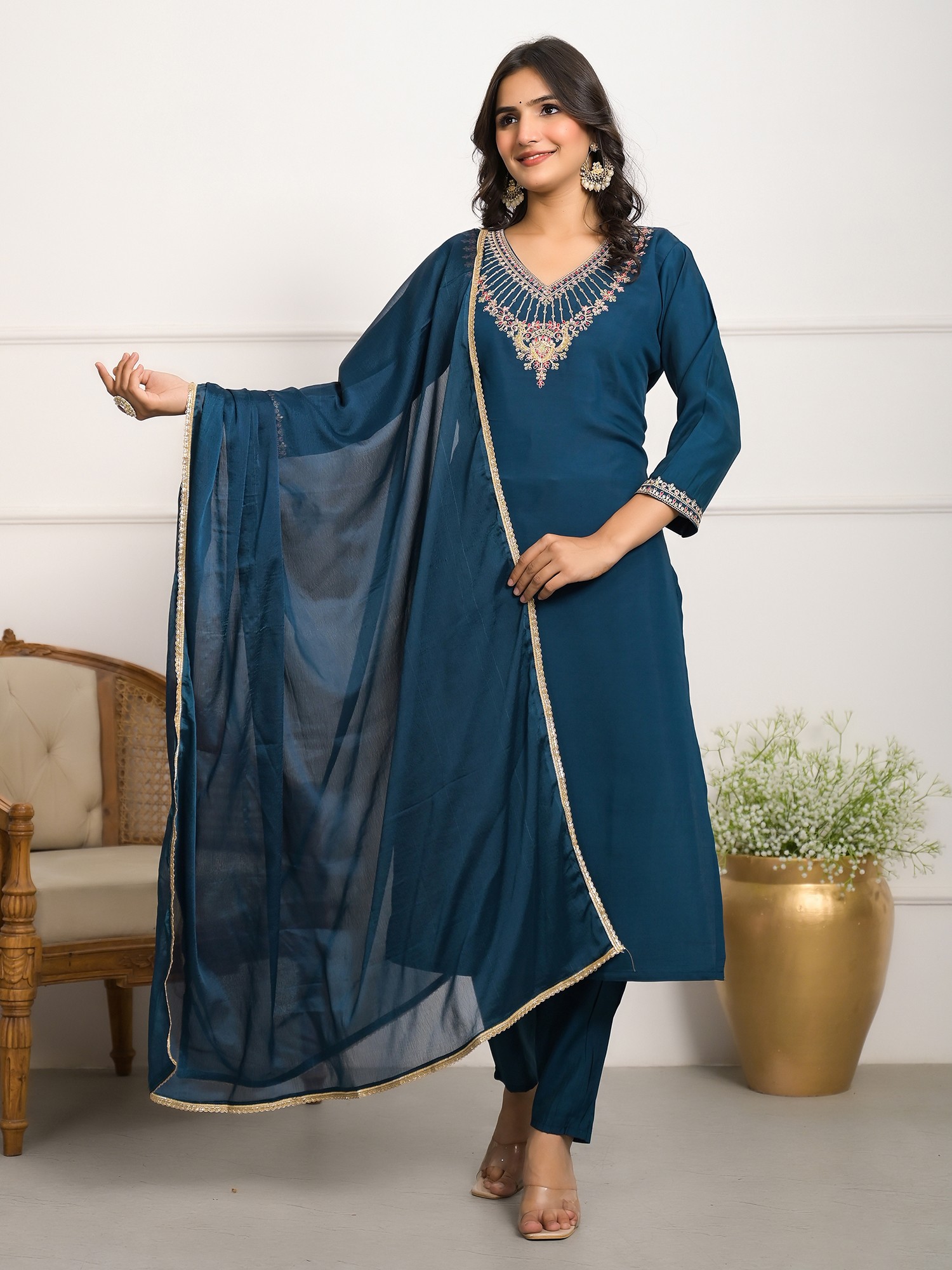 Viscose Chanderi Embroidery And Sequins Work Straight Kurta Set With Matching Dupatta