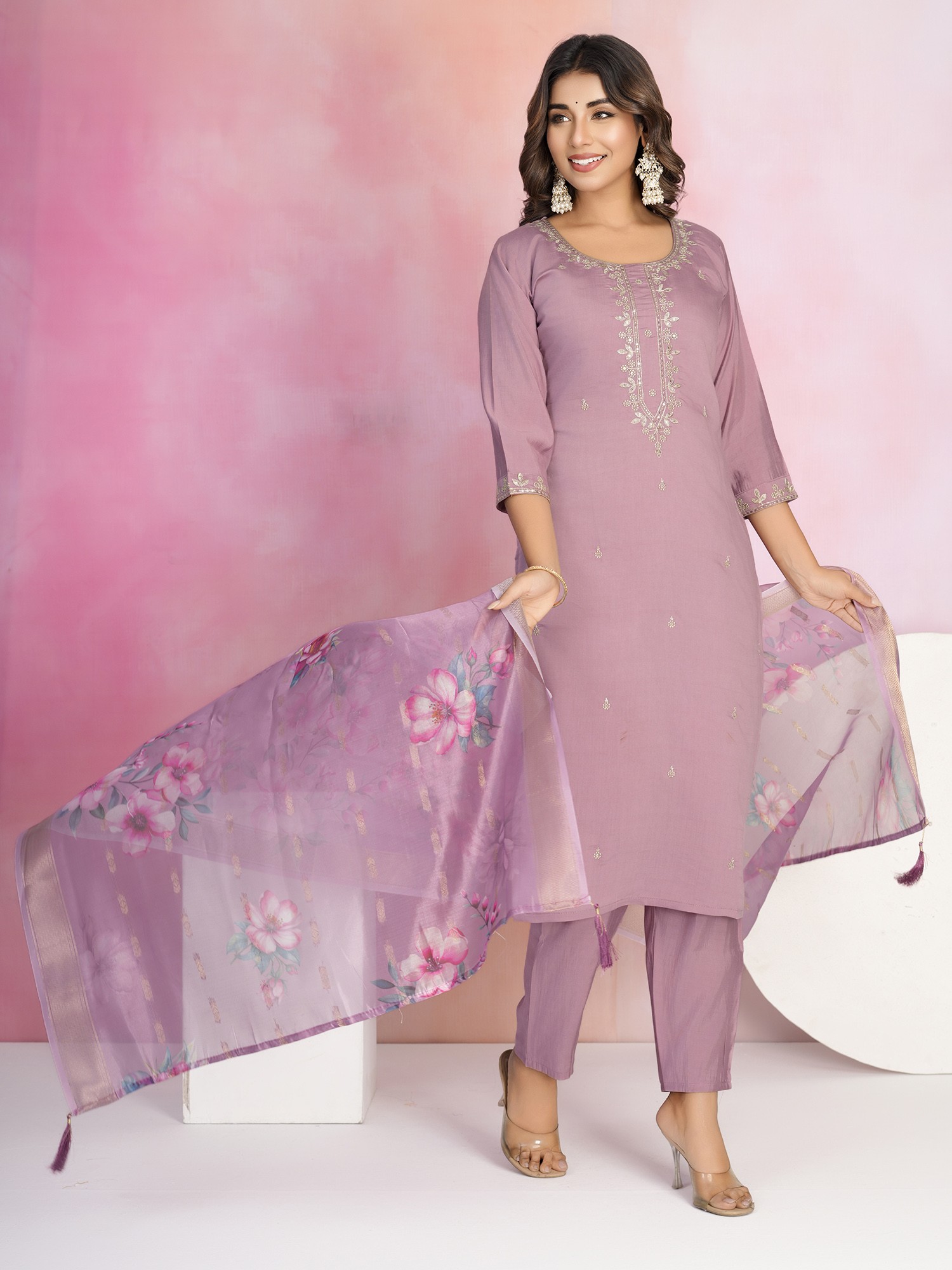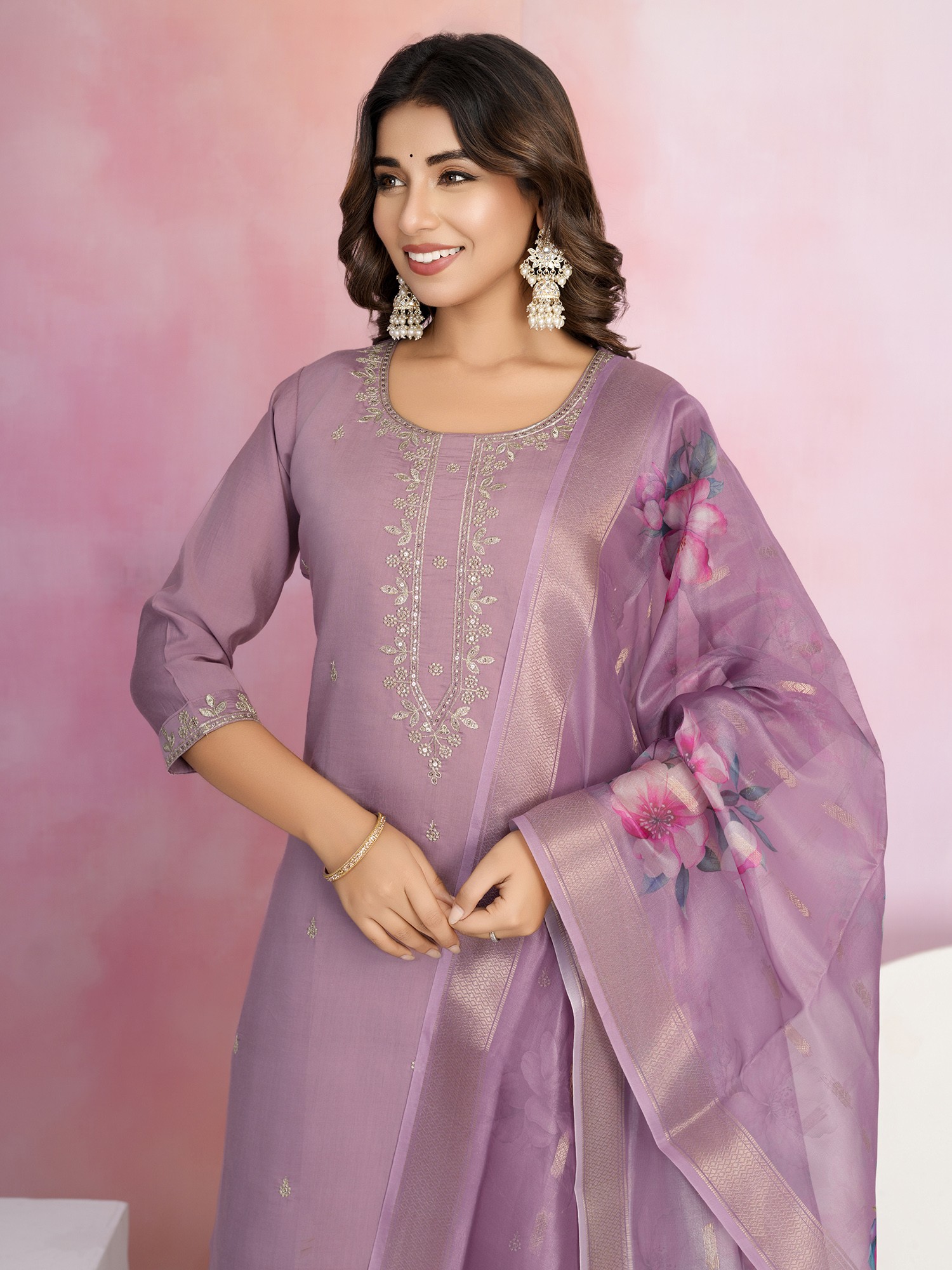 Thread Embroidery Work Viscose Chanderi Fancy Kurta Set With Dupatta For Festive Occasion