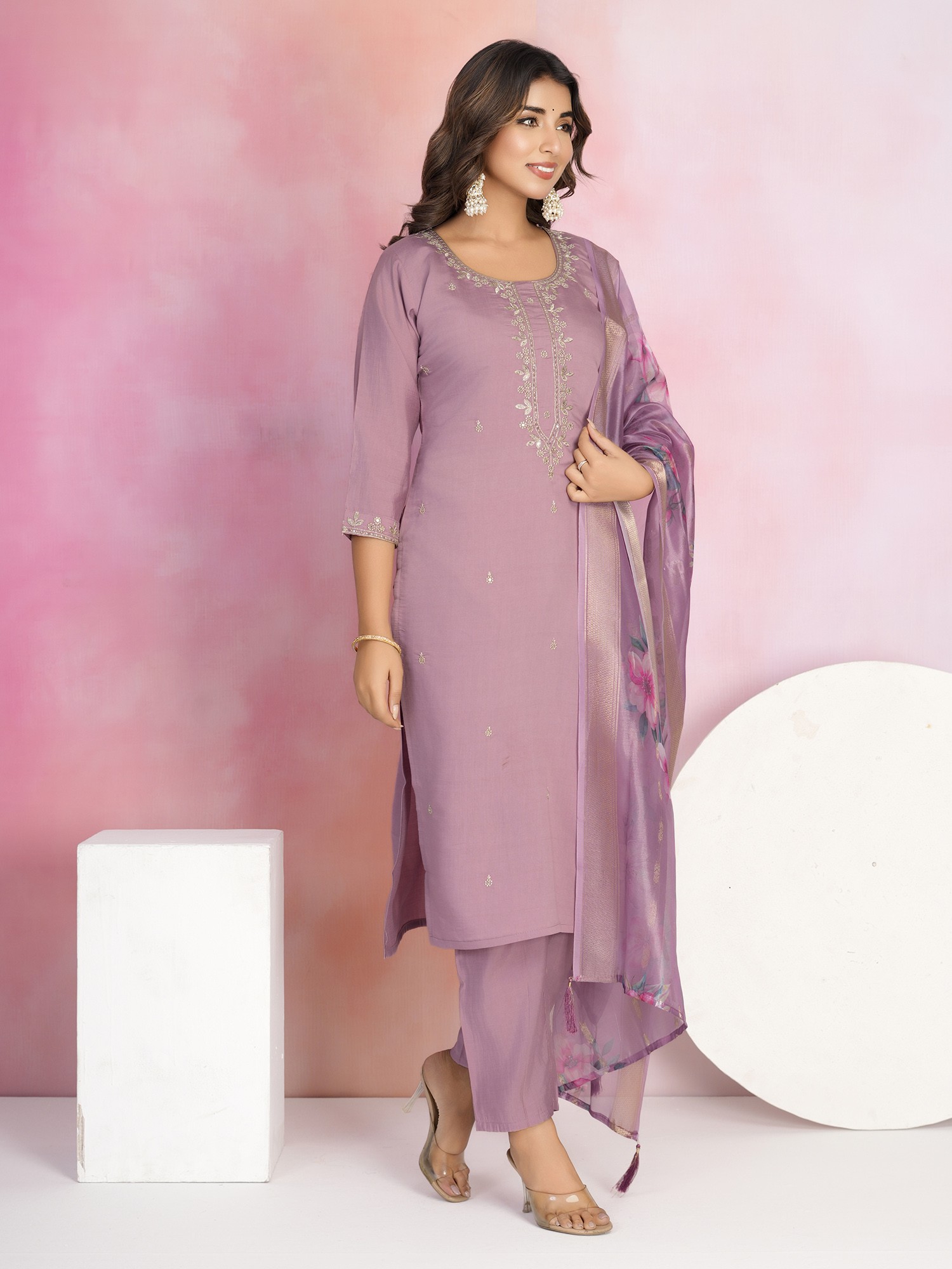 Sequins And Embroidery Work Fancy V-Neck Chanderi Kurta Set With Matching Dupatta