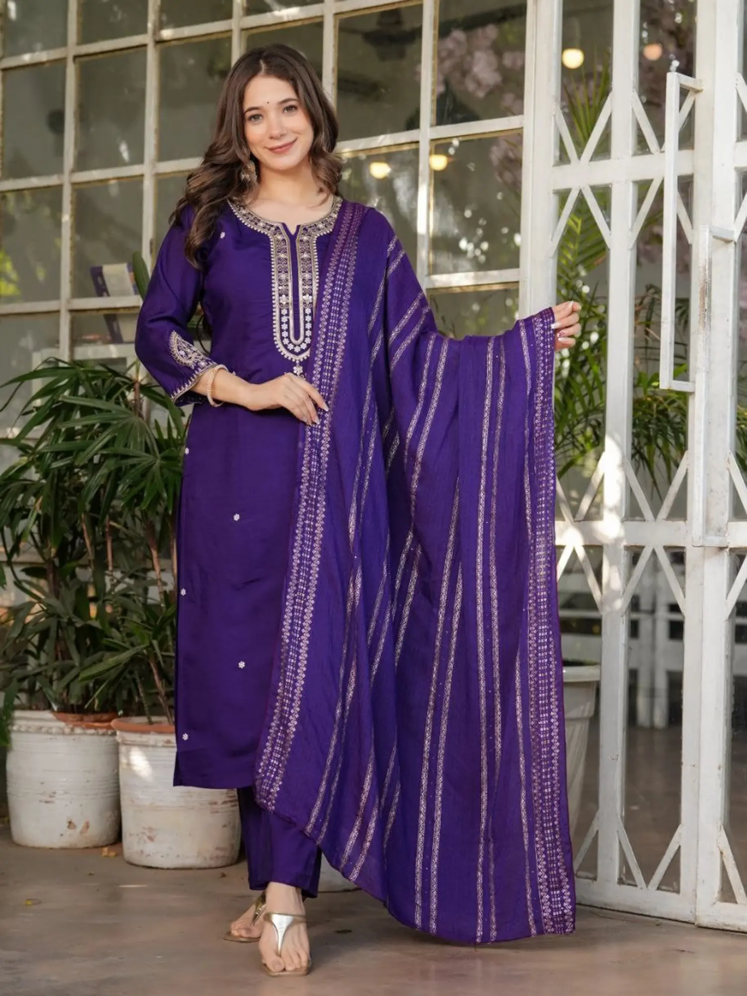 Medium-Violet-Red Heavy Embroidery And Sequins Work Kurta Set With Matching Dupatta