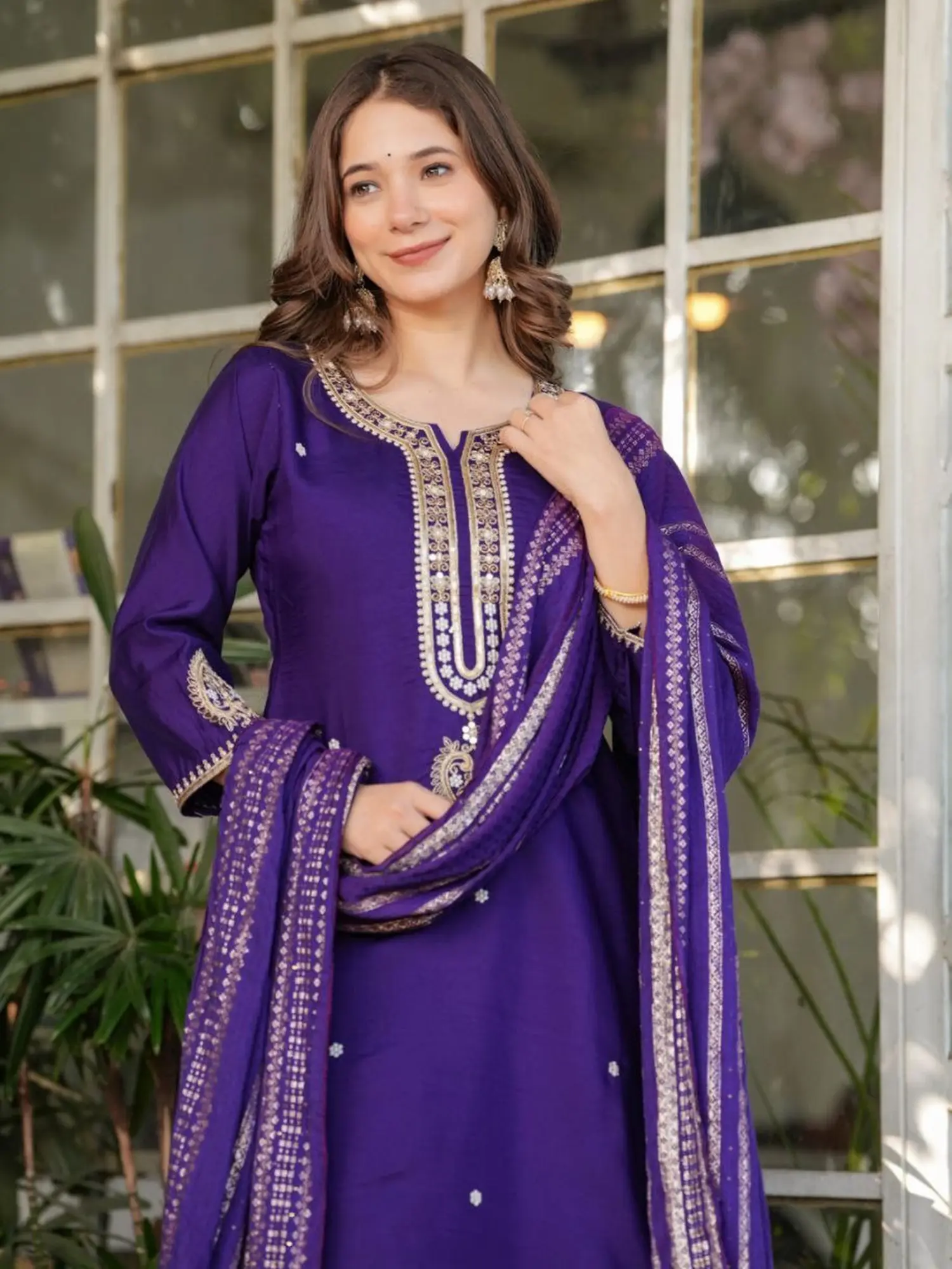 Elegant Chinon Embroidery And Sequins Work Kurta Palazzo Set For Festival Occasion