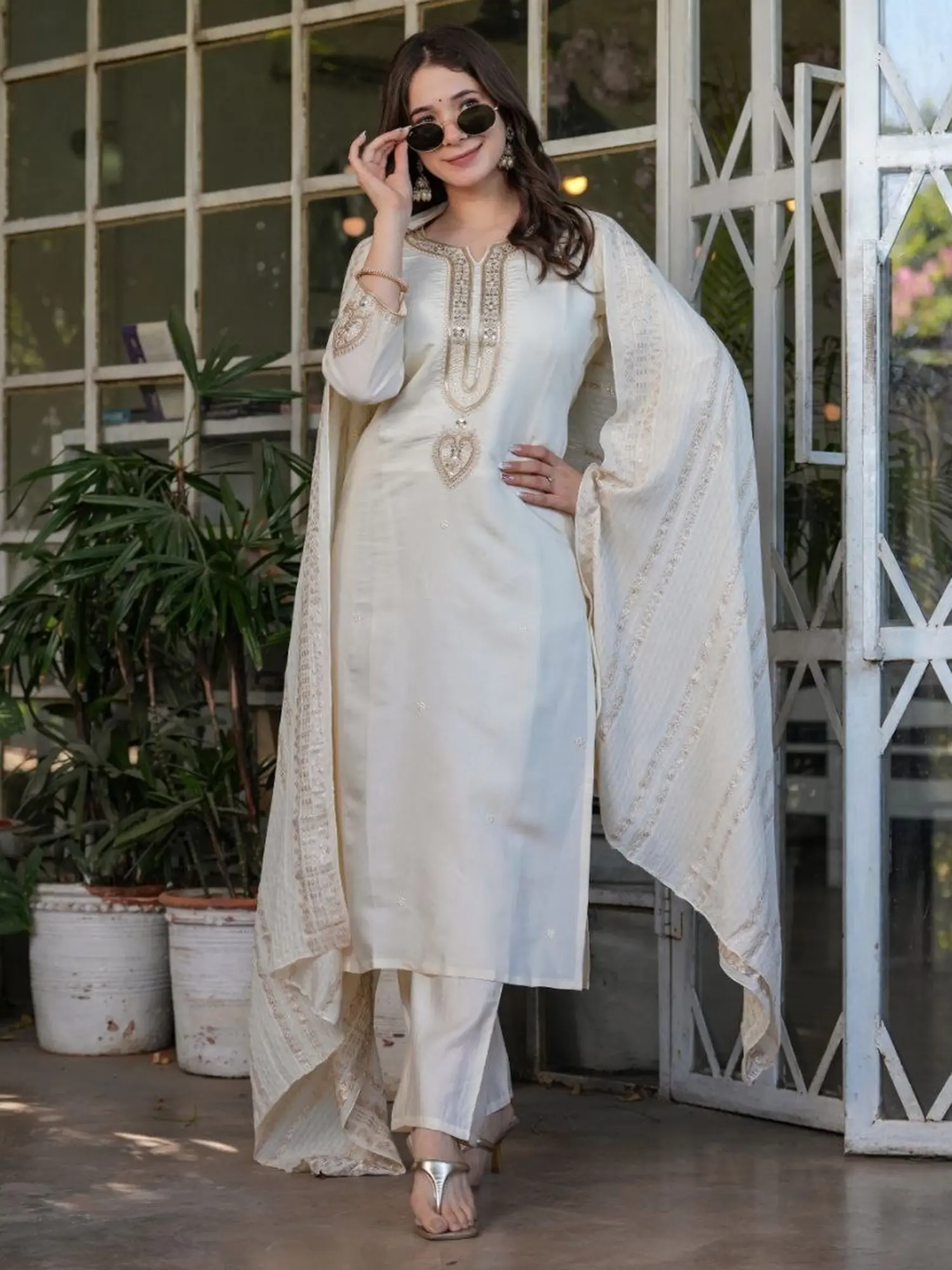 Silk Embroidery With Hand Work On Neck Fancy Kurta With Matching Bottom And Floral Printed Dupatta