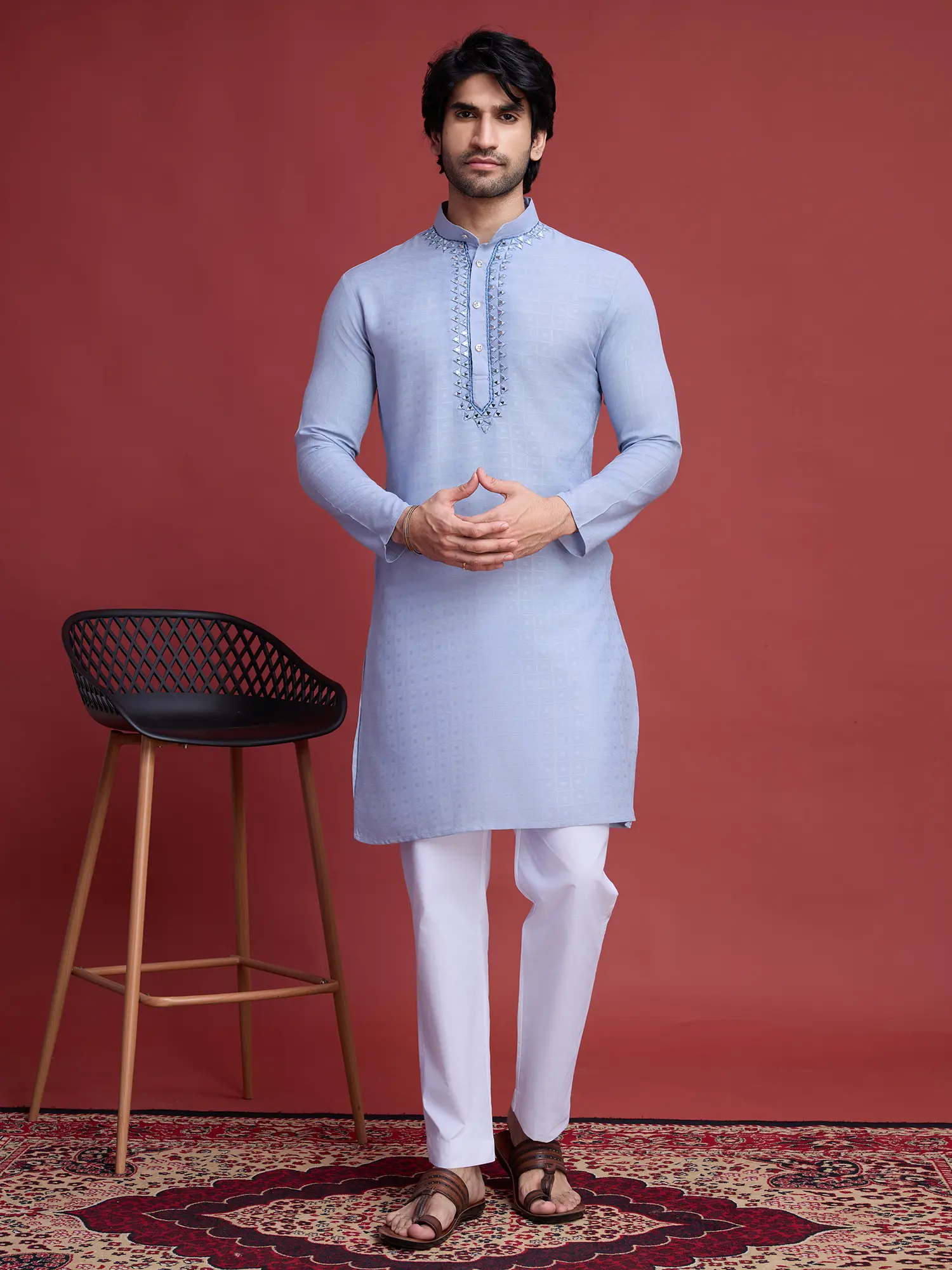 The kurta's self-weaving work adds a unique texture and depth, enhancing the overall aesthetic appeal. The meticulously placed mirror work on the front panel creates a mesmerizing visual effect that's both subtle and striking. Its classic collar and buttoned placket provide a timeless silhouette that transcends fleeting trends, ensuring you remain stylish season after season. The long sleeves add a touch of sophistication, enhancing the kurta's overall regal aura. This kurta effortlessly transitions from festive gatherings to more relaxed settings, making it a truly versatile addition to your wardrobe.