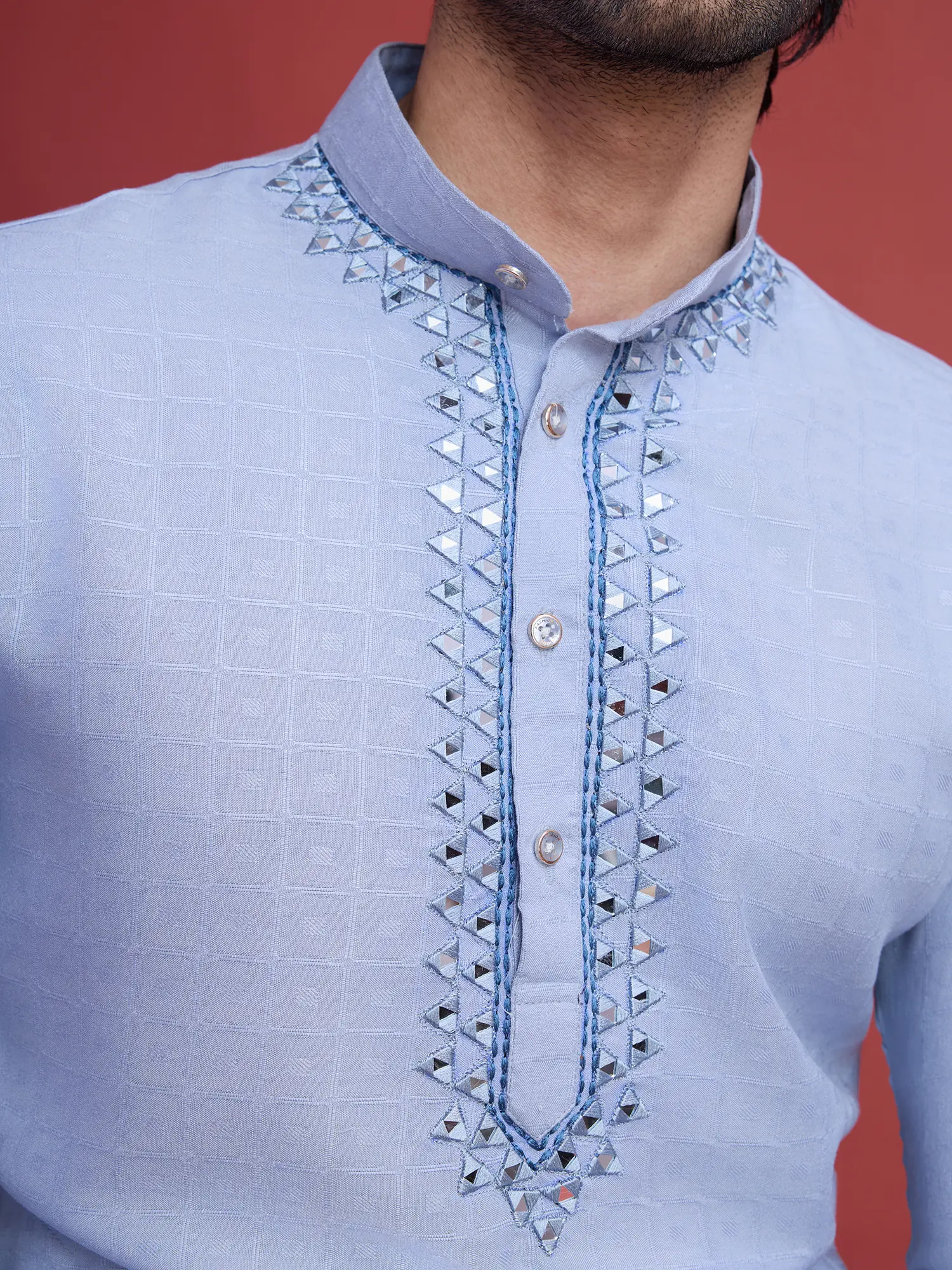 Make a statement this festive season with our exquisite Viscose Mirror Work Kurta. This stunning kurta, crafted from soft and breathable viscose fabric, offers unparalleled comfort while making you the center of attention. The intricate mirror work adds a touch of elegance and sophistication, perfect for any special occasion. The subtle blue hue complements a variety of skin tones and adds a touch of cool sophistication to your festive attire. This is the ideal choice for those looking to combine traditional craftsmanship with modern fashion sensibilities.