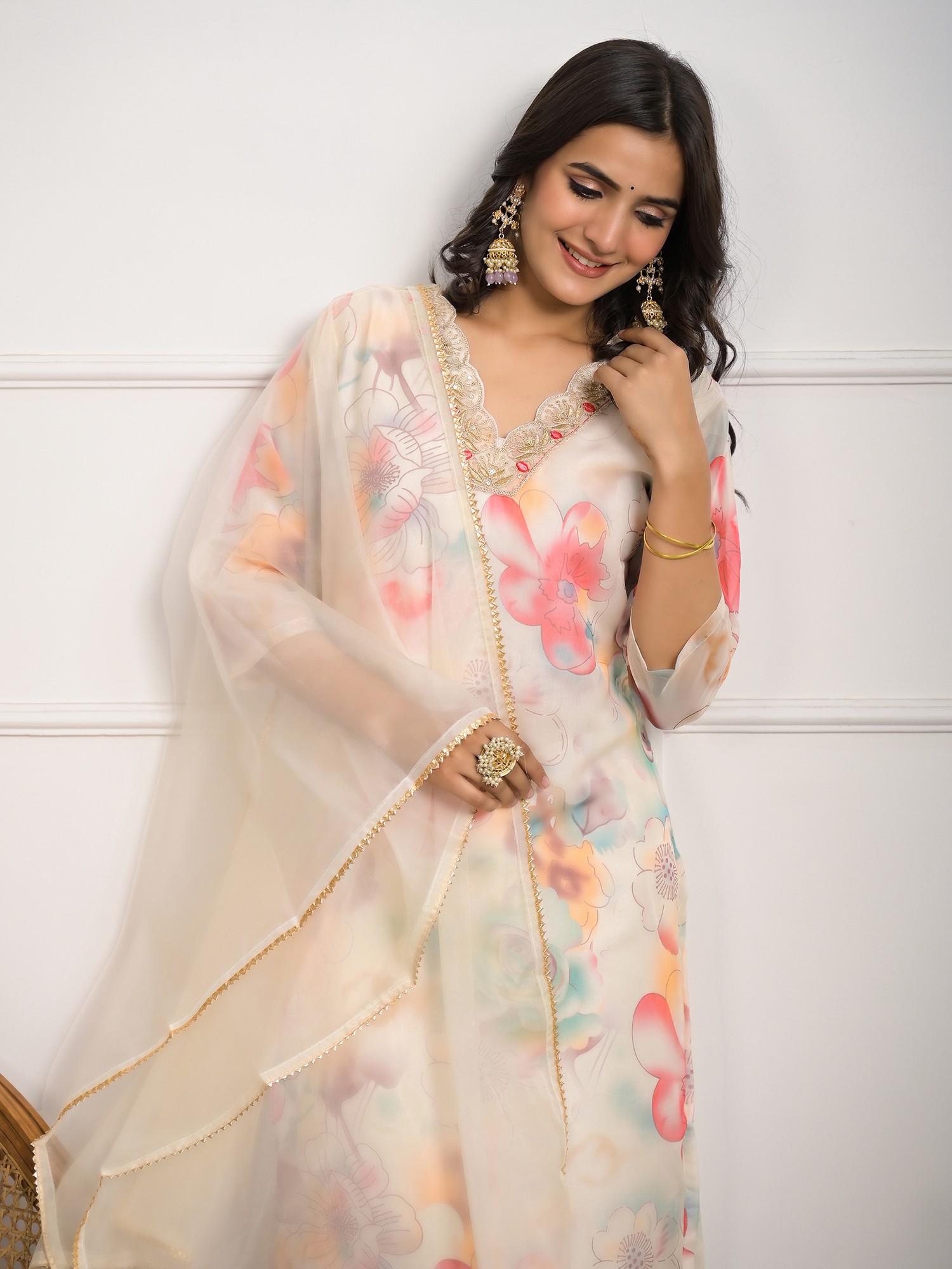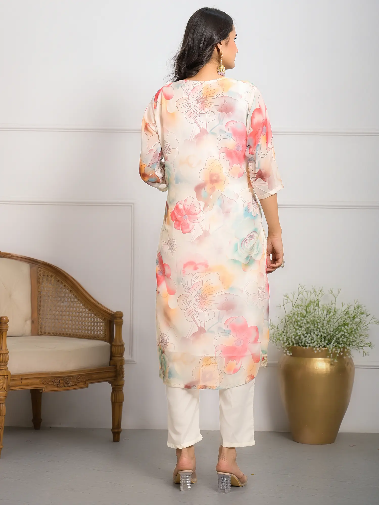 Embroidery Work On Neck Viscose Chanderi Attractive Straight Kurta Set With Floral Print