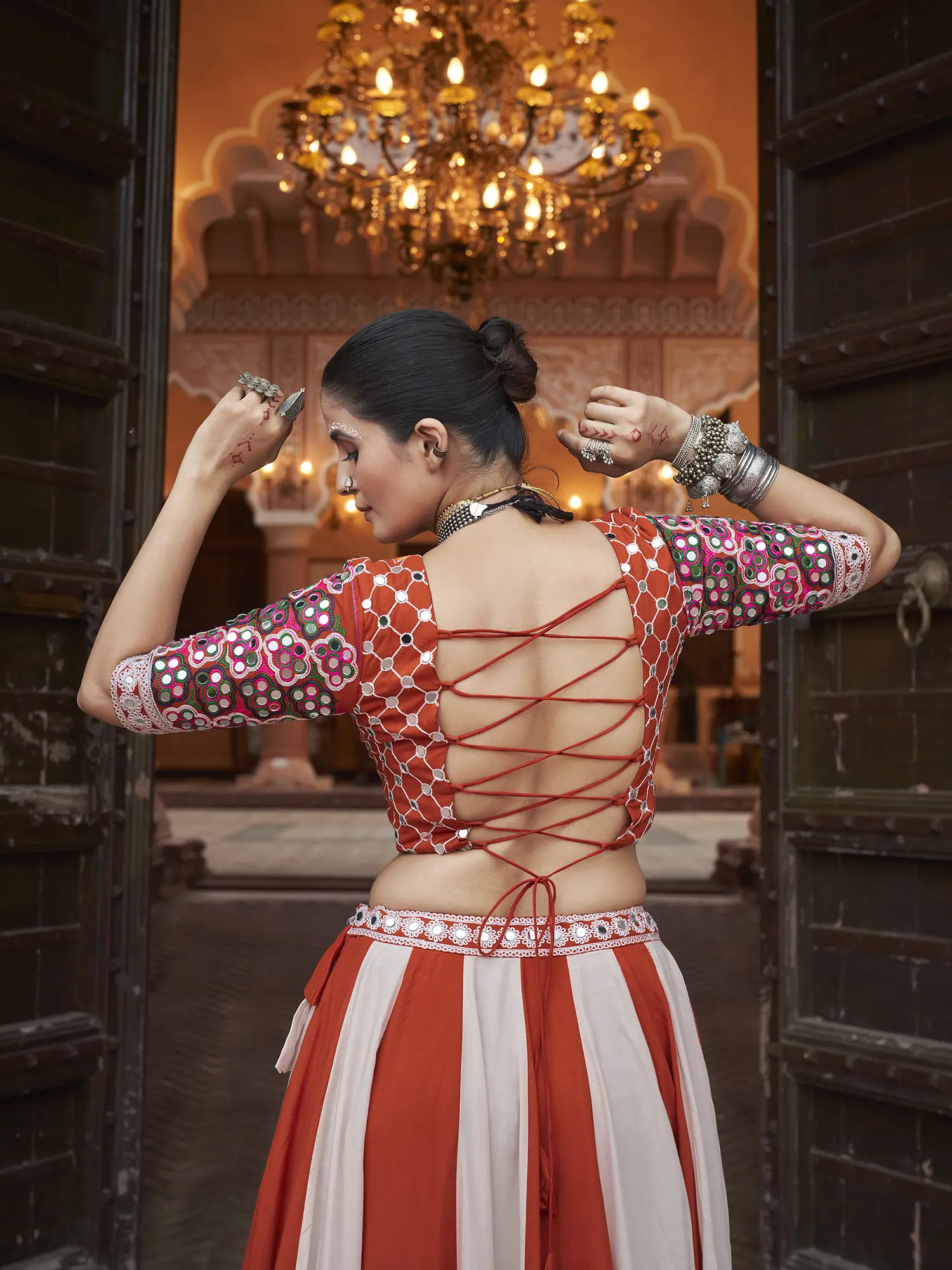 Complementing the ornate choli is a gracefully flowing lehenga. Its design features bold, vertical stripes in a harmonious blend of colors, creating a striking visual rhythm. The base of the lehenga is further enhanced with a beautiful embroidered border, mirroring the mirror work and intricate patterns seen on the choli. This thoughtful repetition of design elements creates a cohesive and sophisticated look, ensuring you are adorned in artistry from head to toe. The expansive flare of the lehenga allows for graceful movement, adding to its ethereal charm.
