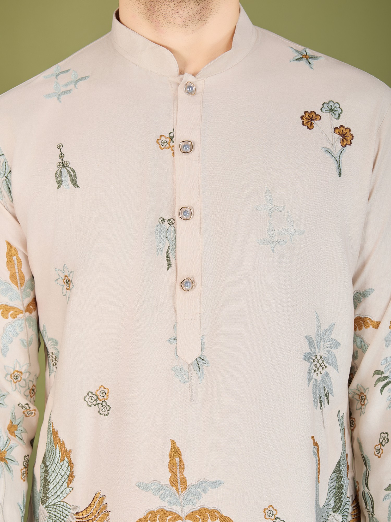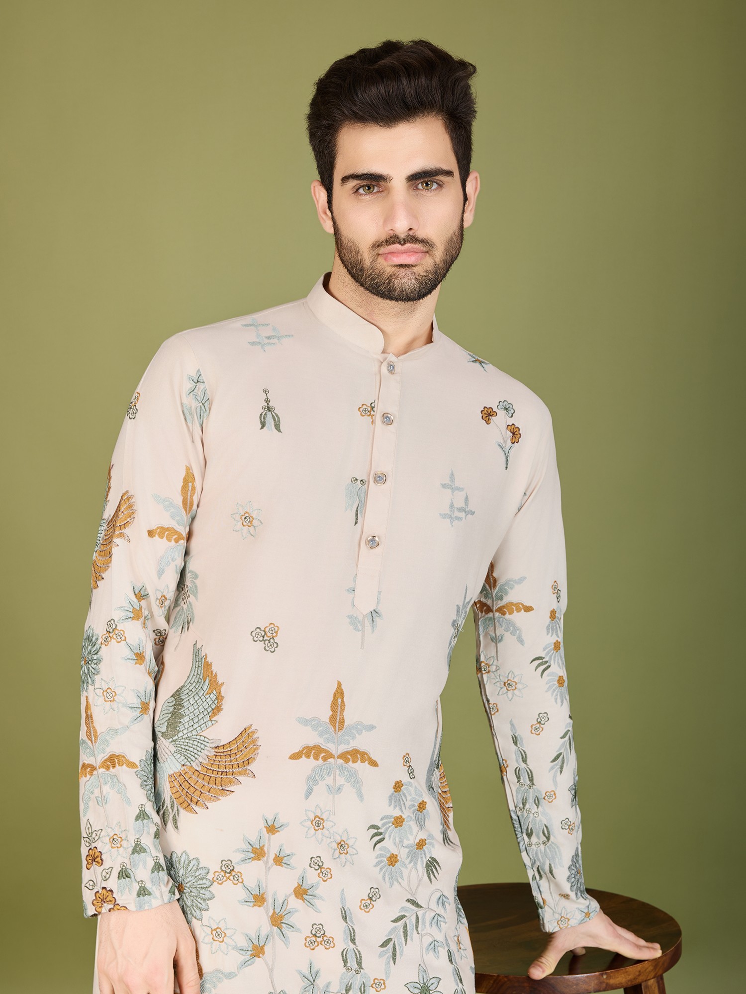 Star-White Kurta Pajama with Lukhnavi Chikan Embroidery by Hand