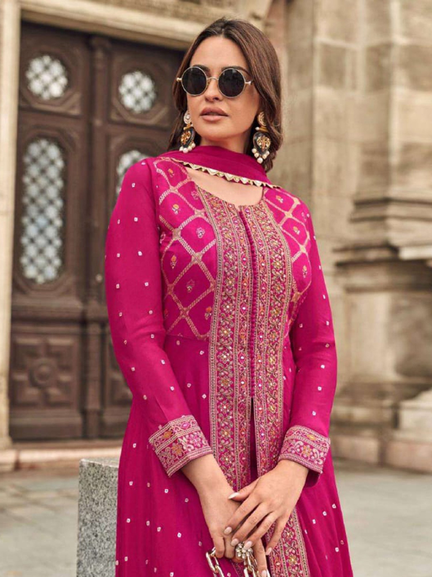 You'll appreciate the meticulous attention to detail that defines this creation. Fashioned from exquisite viscose silk, its rich texture speaks of unparalleled quality and comfort. The accompanying Chinon bottom and dupatta are seamlessly integrated, showcasing a commitment to harmonious design and a luxurious feel against the skin.