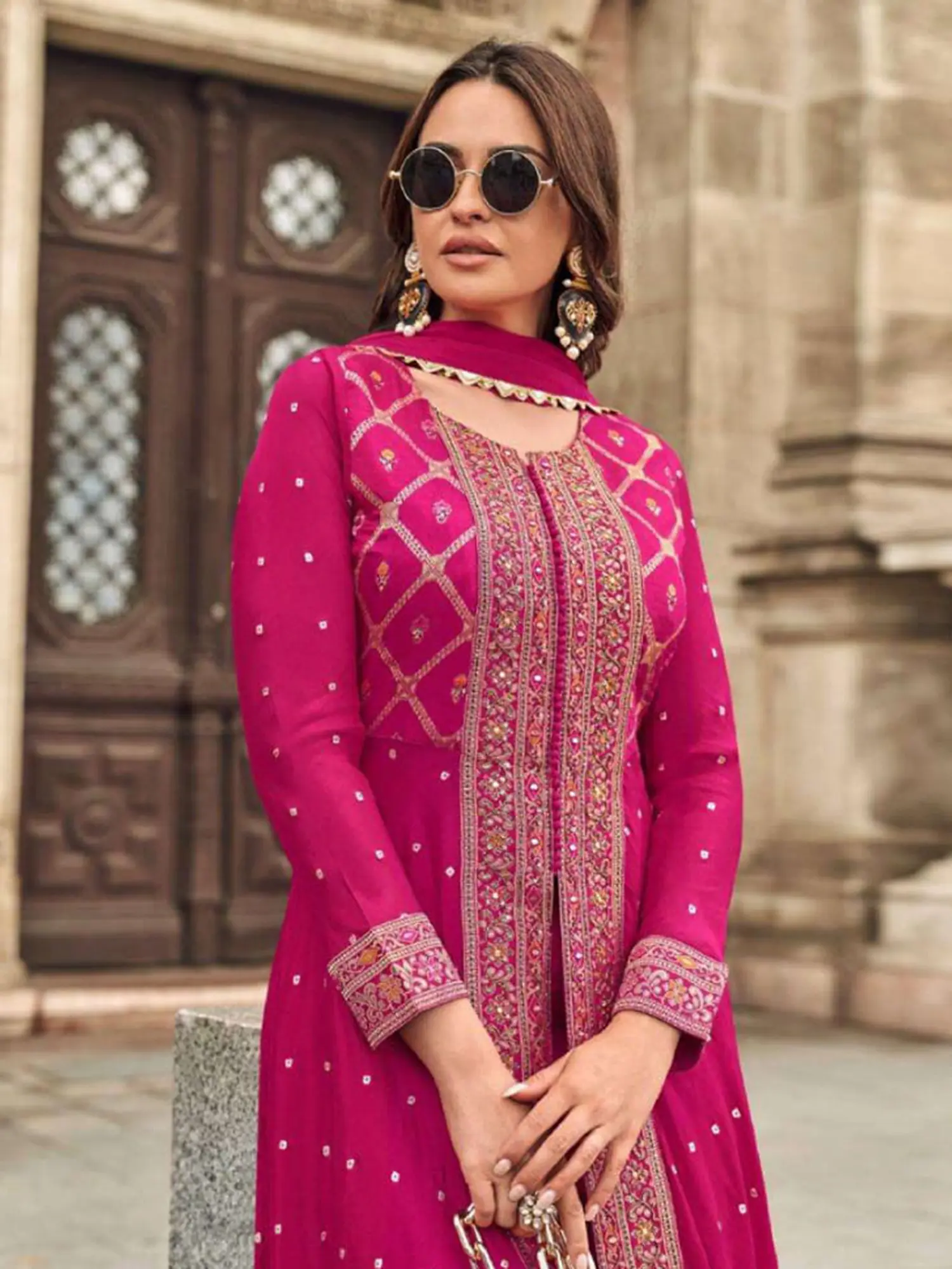 Elegant Viscose Silk Palazzo Suit Set With Chinon Dupatta And Bottom Featuring Fine Thread Weaving Embroidery Party Wear