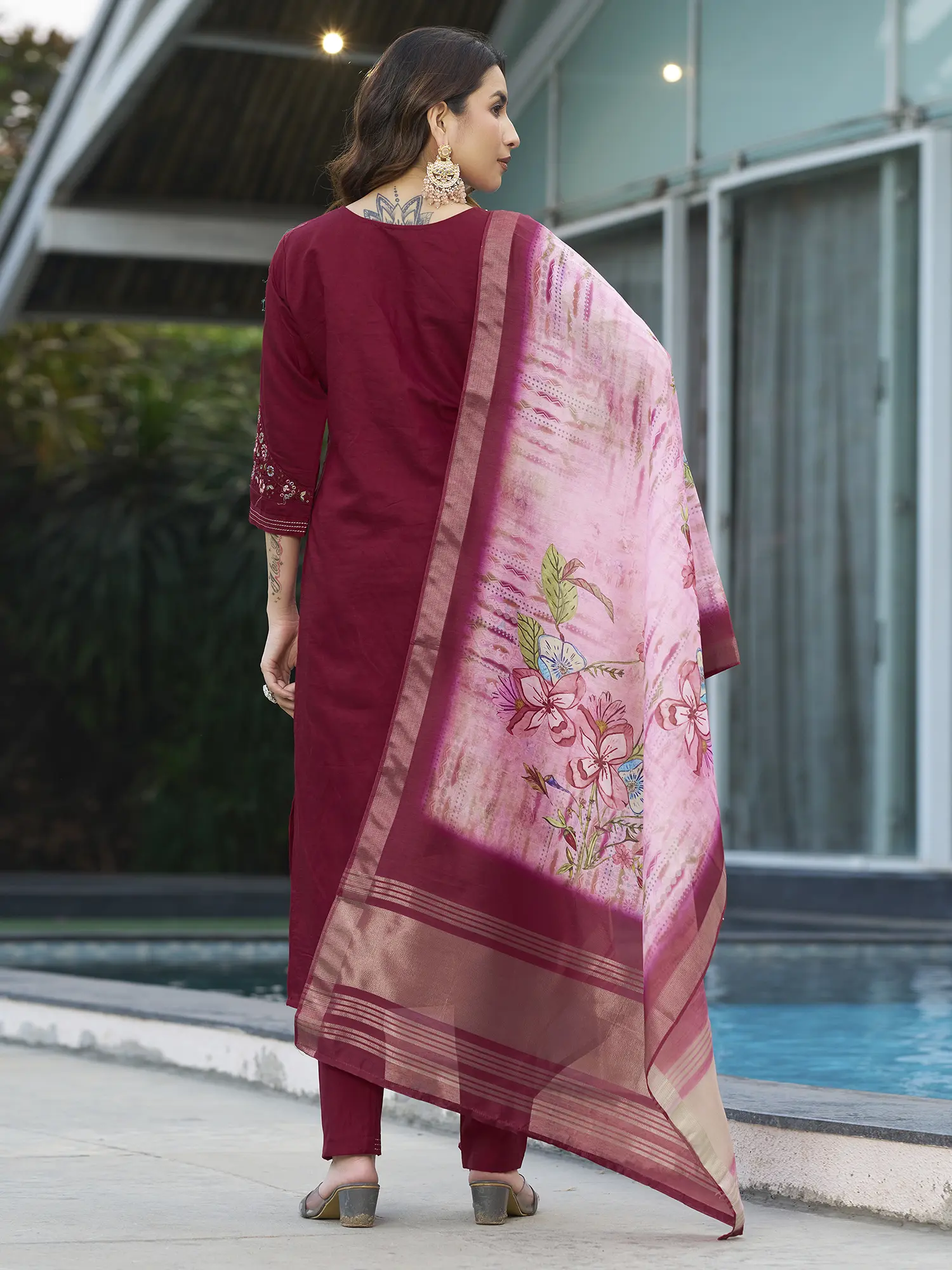 Adorning the neckline is an intricate tapestry of multi-colored embroidery, featuring delicate threadwork that speaks of traditional artistry. This same painstaking detail extends to the sleeves, where floral motifs are rendered with exceptional precision. The accompanying pant, tailored for comfort and a flattering silhouette, ensures a cohesive and polished look. Completing this ensemble is a flowing maslin silk dupatta, offering a soft, ethereal touch.