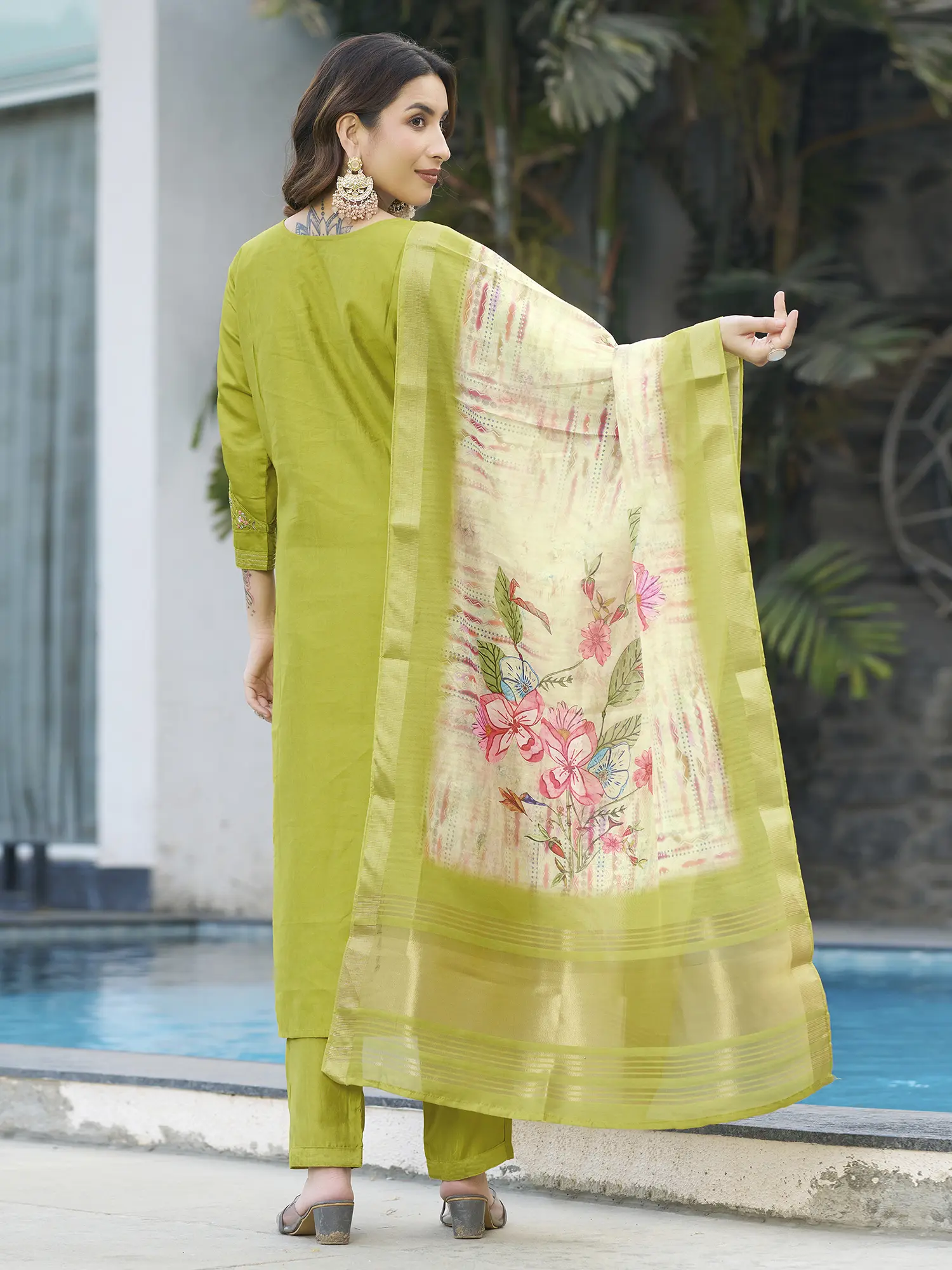 Each element of this three-piece set is a testament to meticulous craftsmanship. The kurti, crafted from a lustrous viscose silk, drapes beautifully and feels exquisitely soft against your skin. Its subtle sheen catches the light, hinting at the quality within.