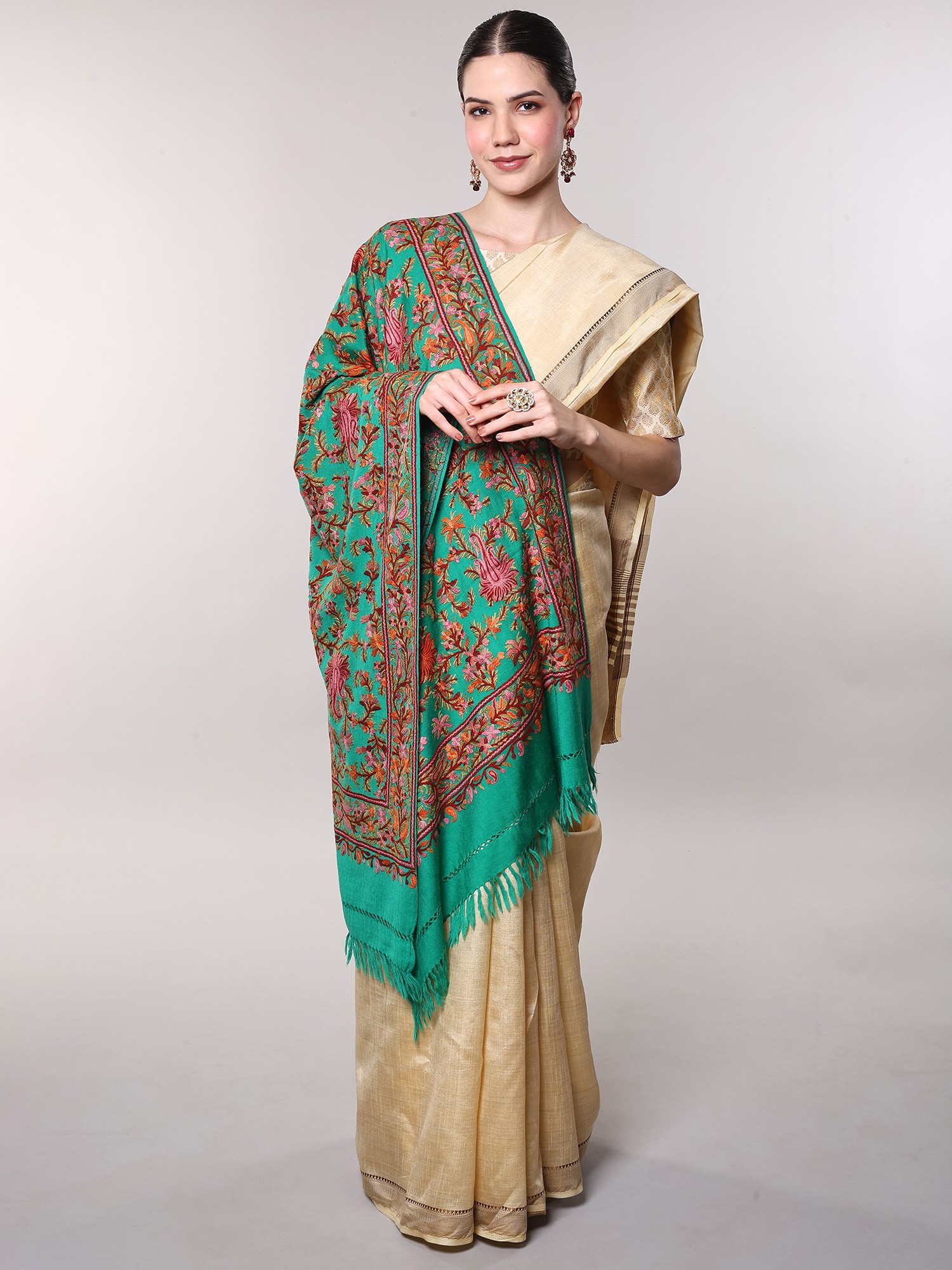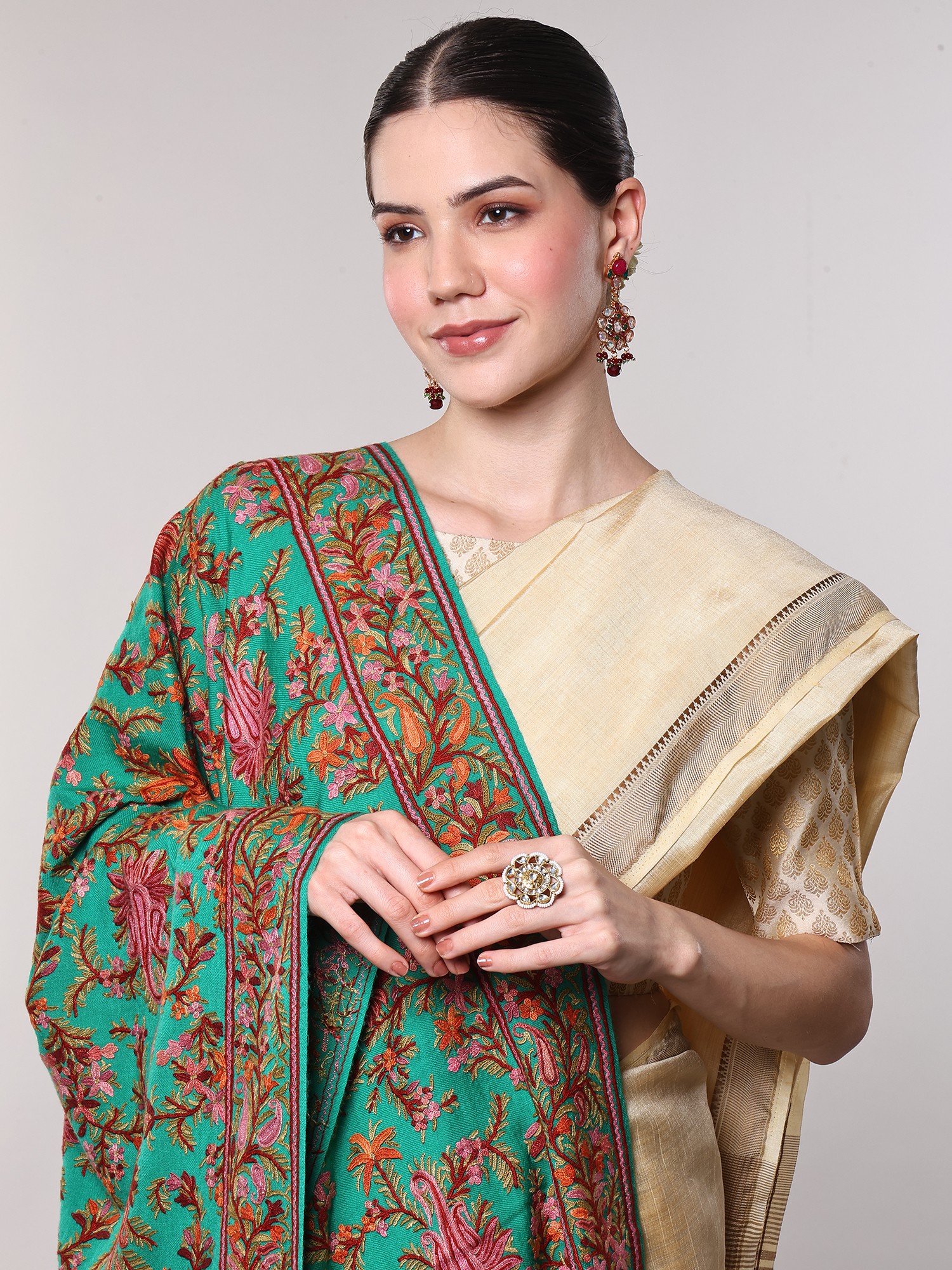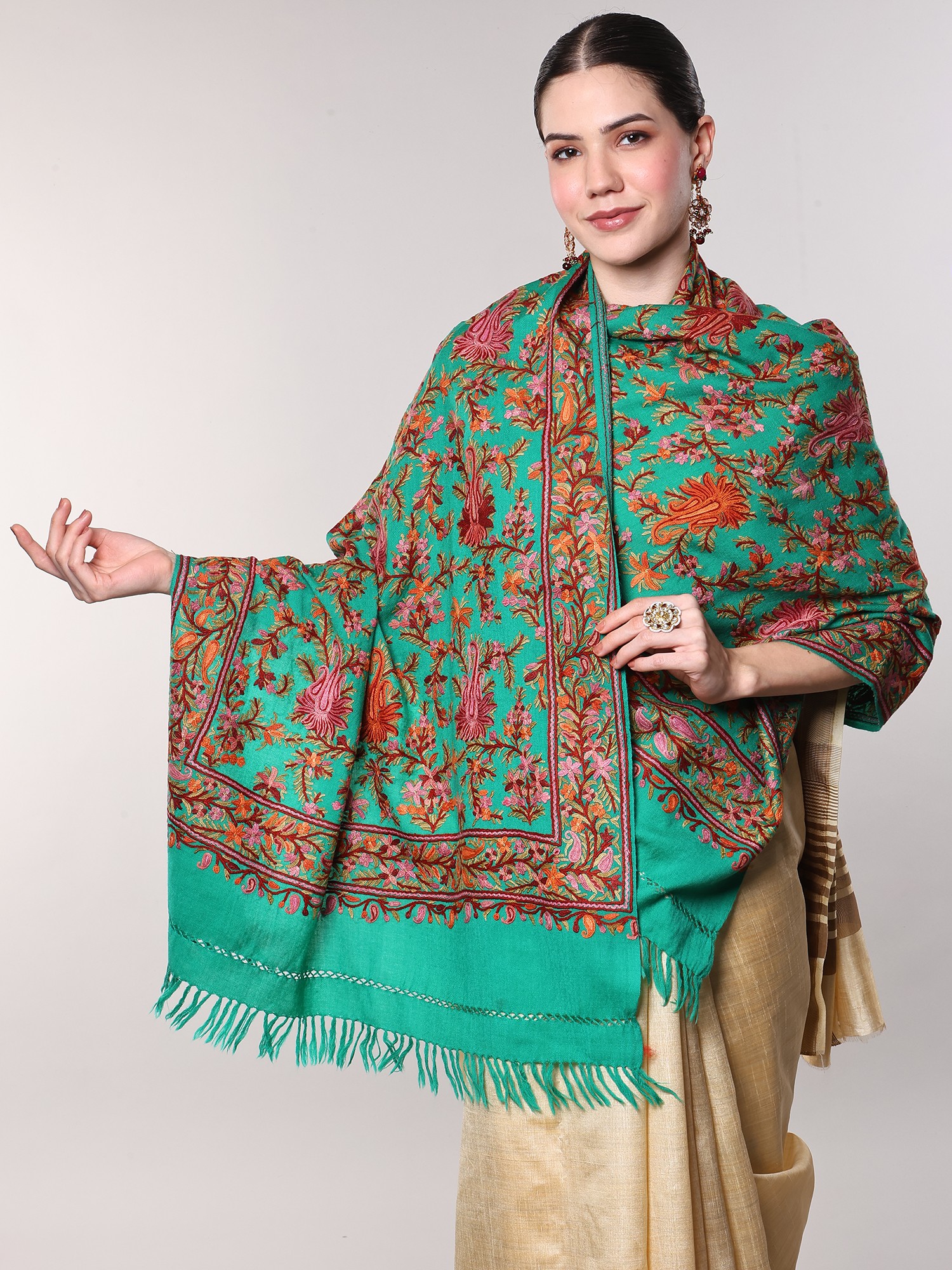 Immerse yourself in the rich heritage of Kashmiri artistry with this exquisite pure wool stole. More than just an accessory, it is a wearable masterpiece, meticulously crafted by skilled artisans whose traditions have been passed down through generations. The vibrant emerald green base serves as a canvas for a breathtaking display of intricate Aari embroidery, a technique renowned for its delicate precision and rich texture.