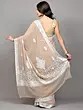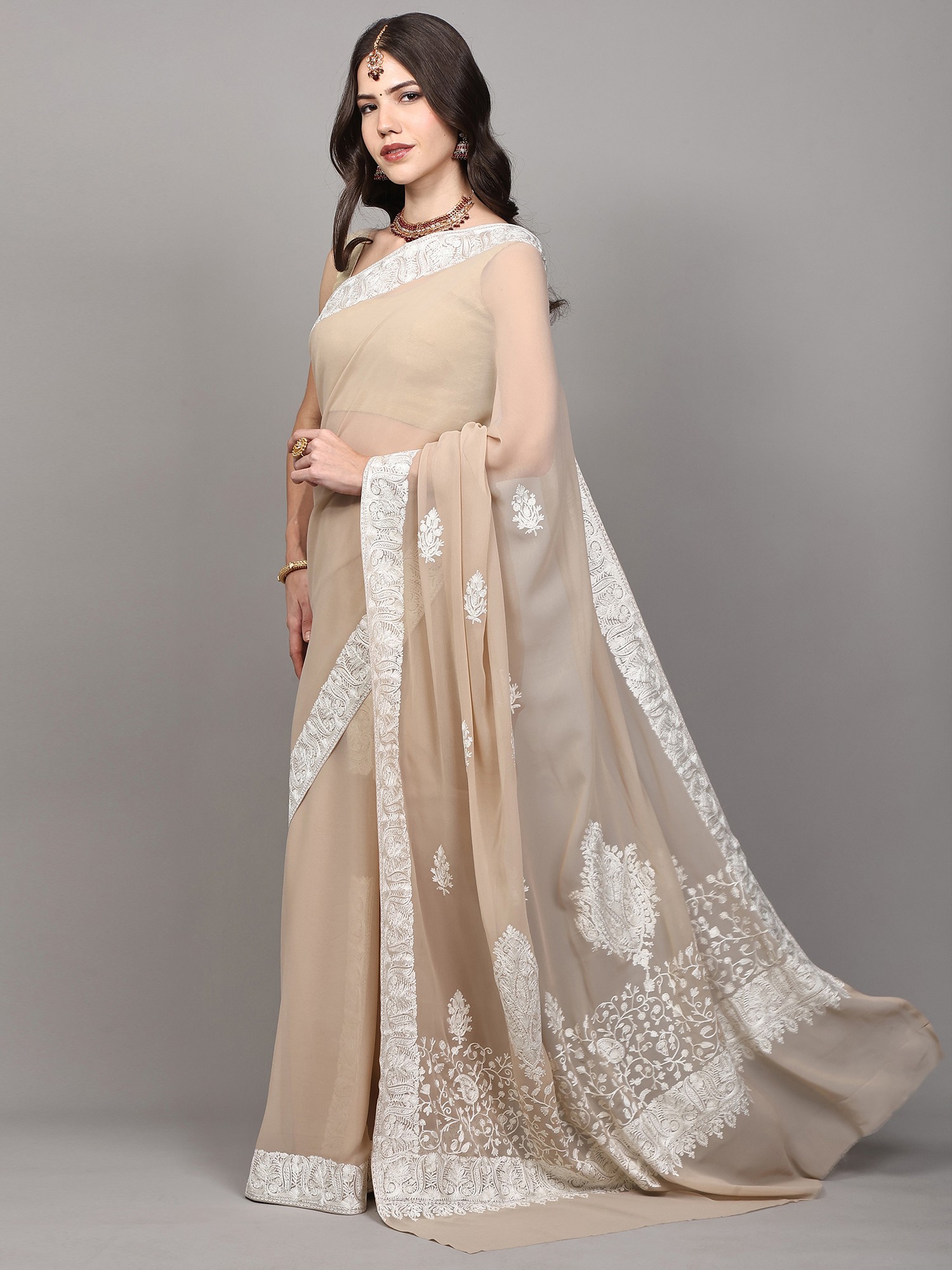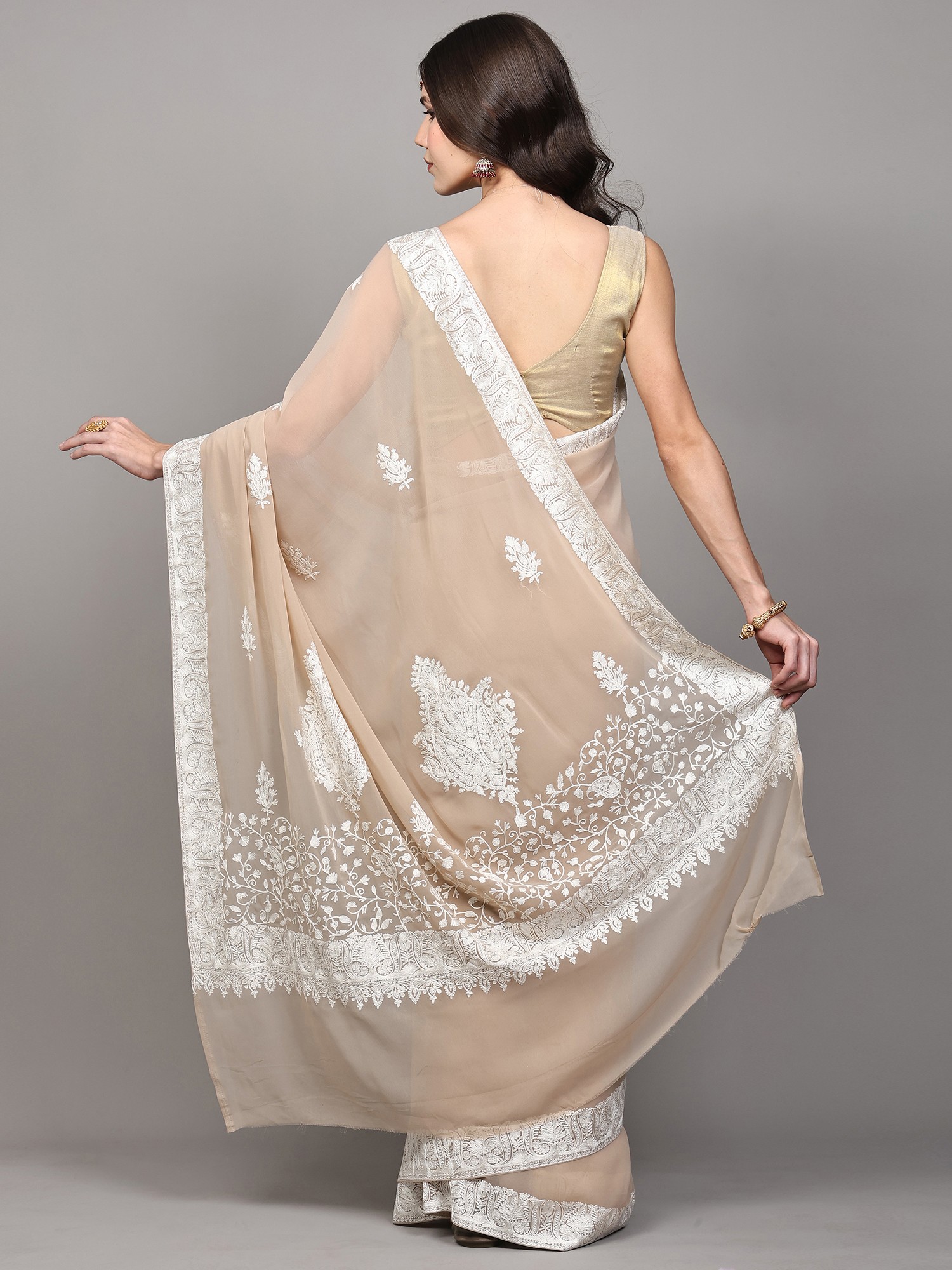 Chic-White Designer Sari with Aari-Embroidered Flowers in Multi-Color Thread and Sequins