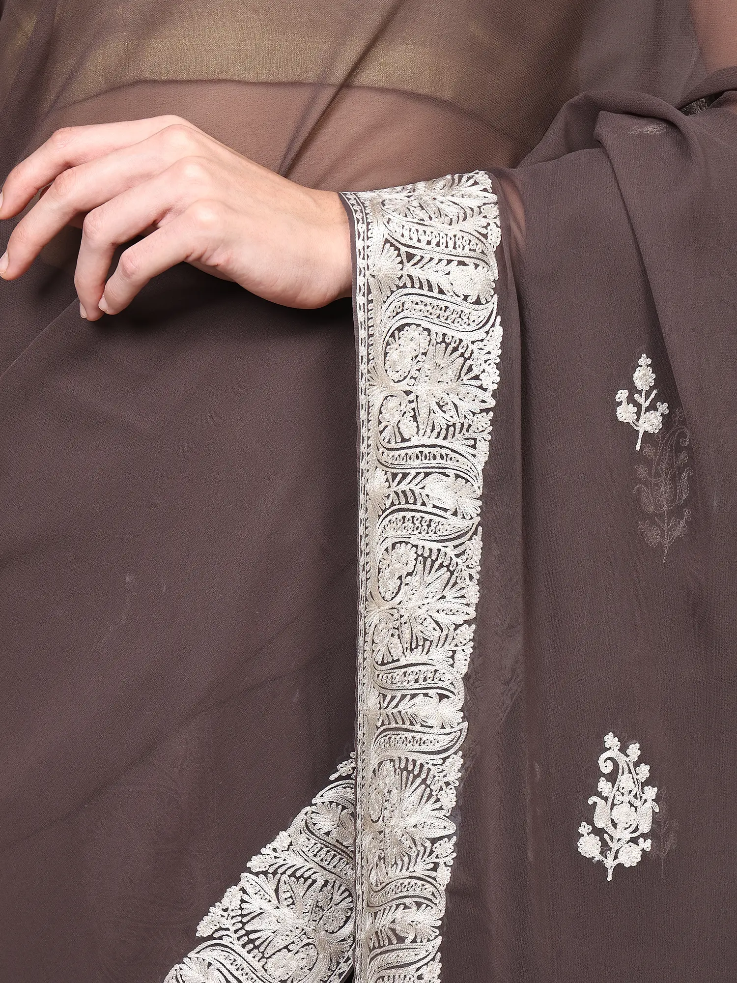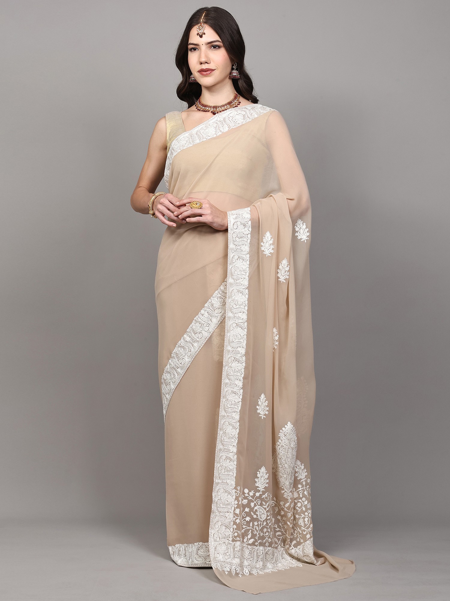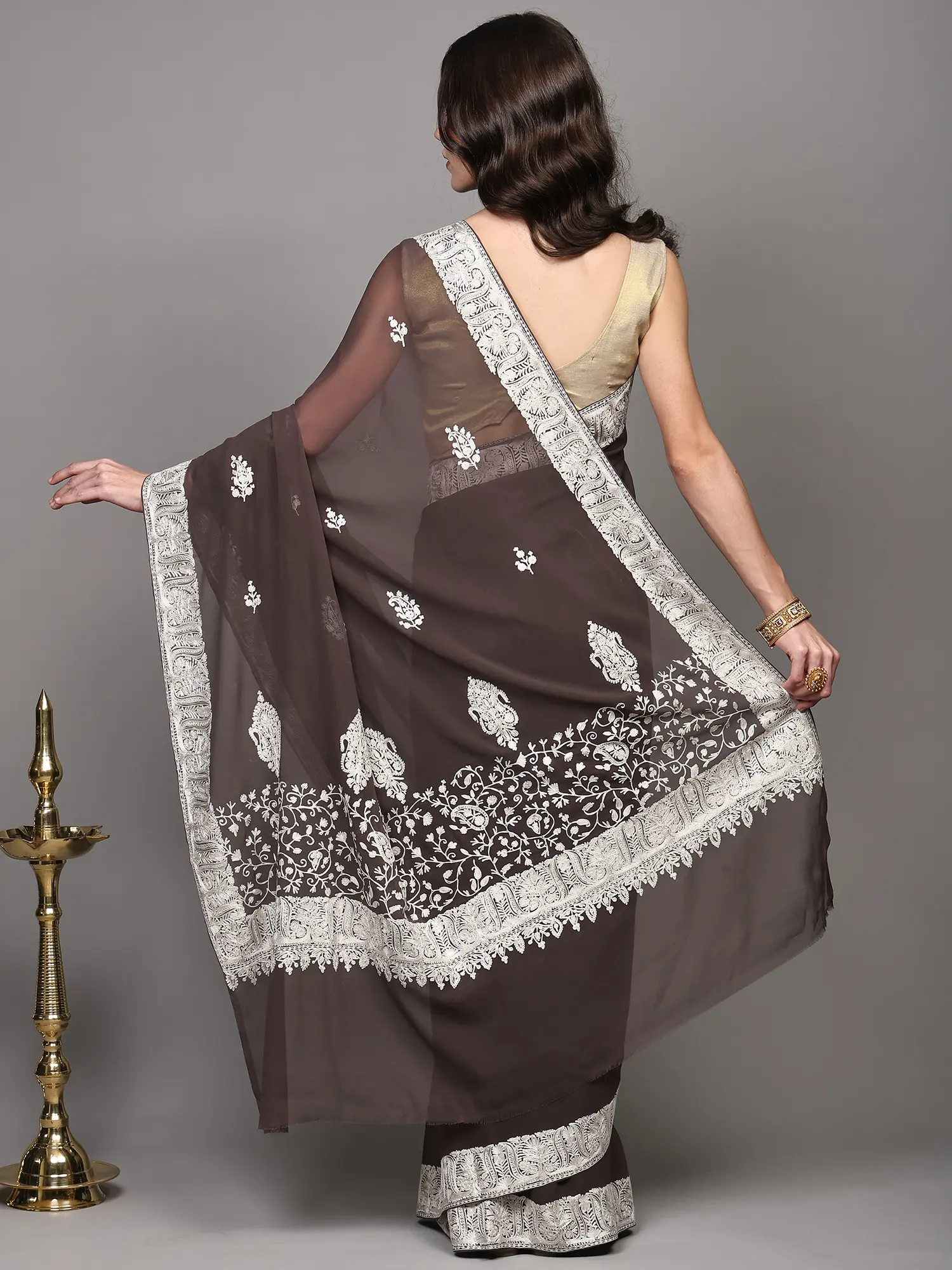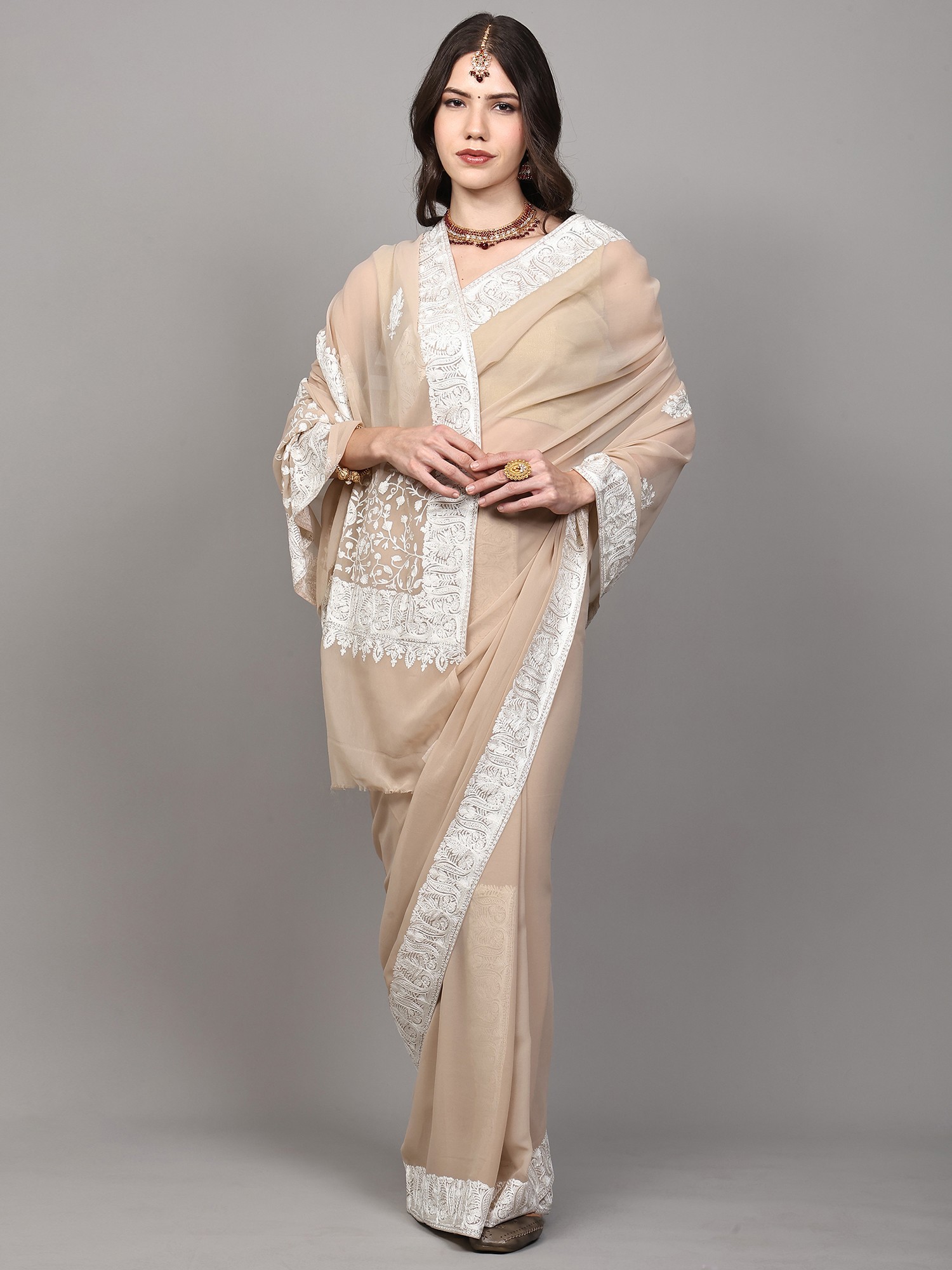 Spectra-Green Georgette Saree from Kashmir with Aari Embroidered Floral Motifs