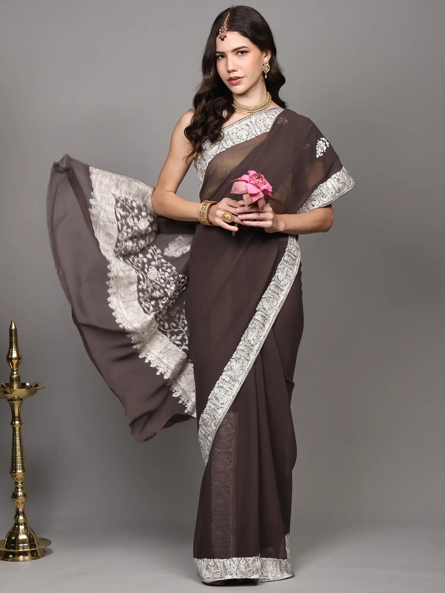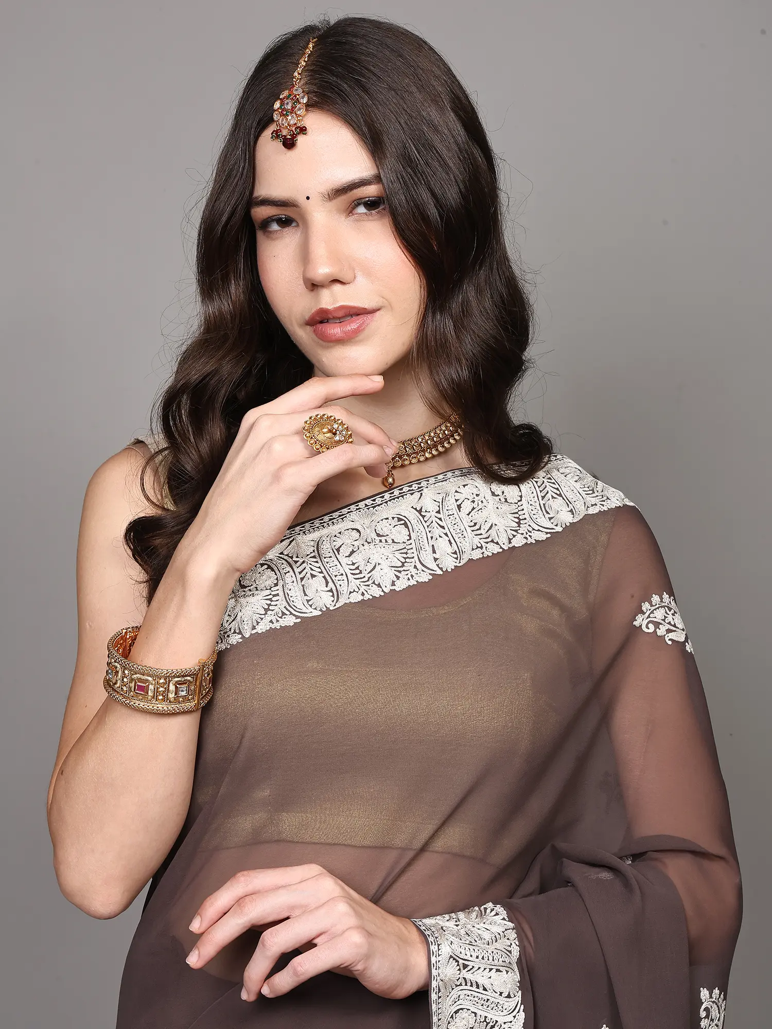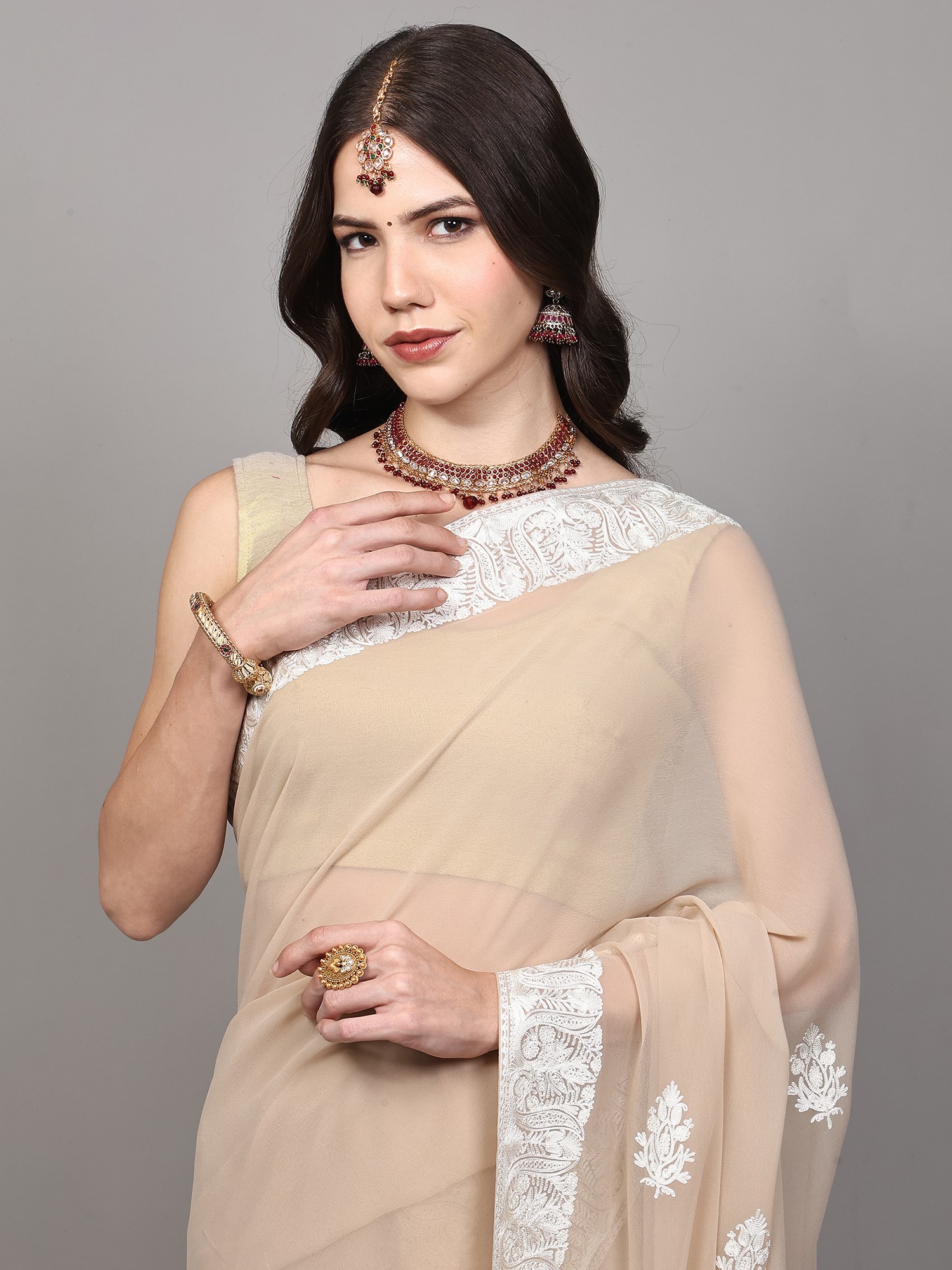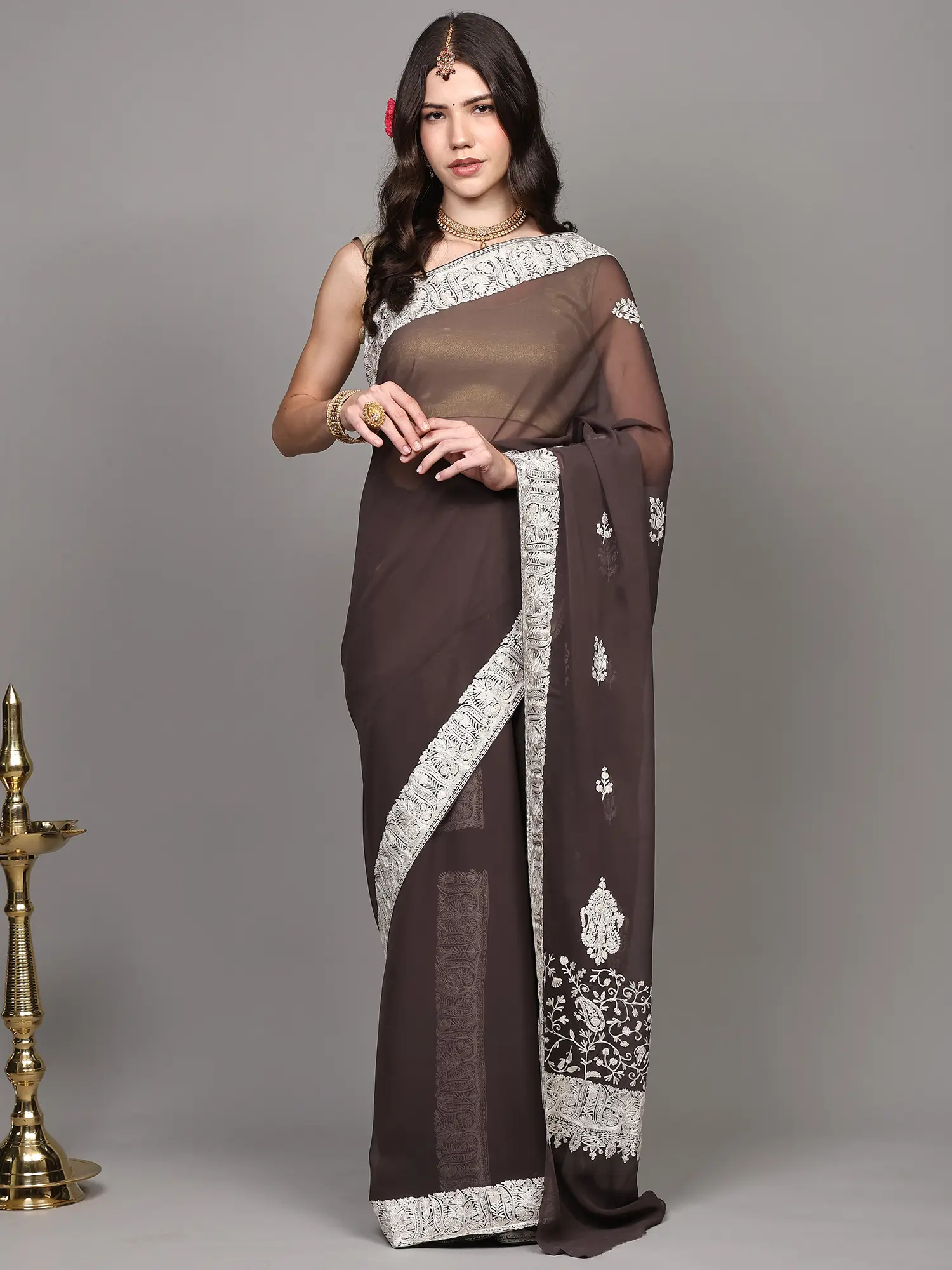 Spectra-Green Georgette Saree from Kashmir with Aari Embroidered Floral Motifs