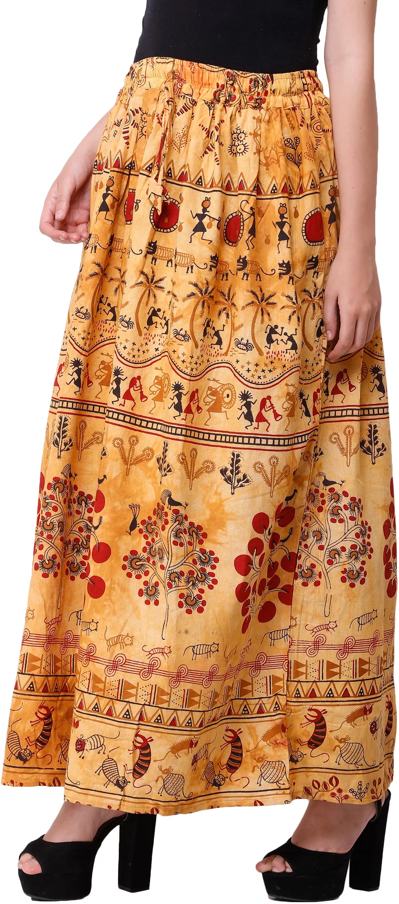 Warli art from Maharashtra is a superb folk-art form, with its roots in the most ancient cultures of not just India but the world. Its simple details that carry the stories of human cultures aesthetically have captured the imagination of artists, some of whom experiment with material and canvases to display the ethereal charm of Warli. In this case, the chosen canvas is a pure cotton long skirt, covered all over in Warli-inspired motifs. Flora, fauna, human figures, and abstract geometrical patterns form the rich treasure of patterns on the skirt, giving it an unforgettable touch of traditional Indian appeal.