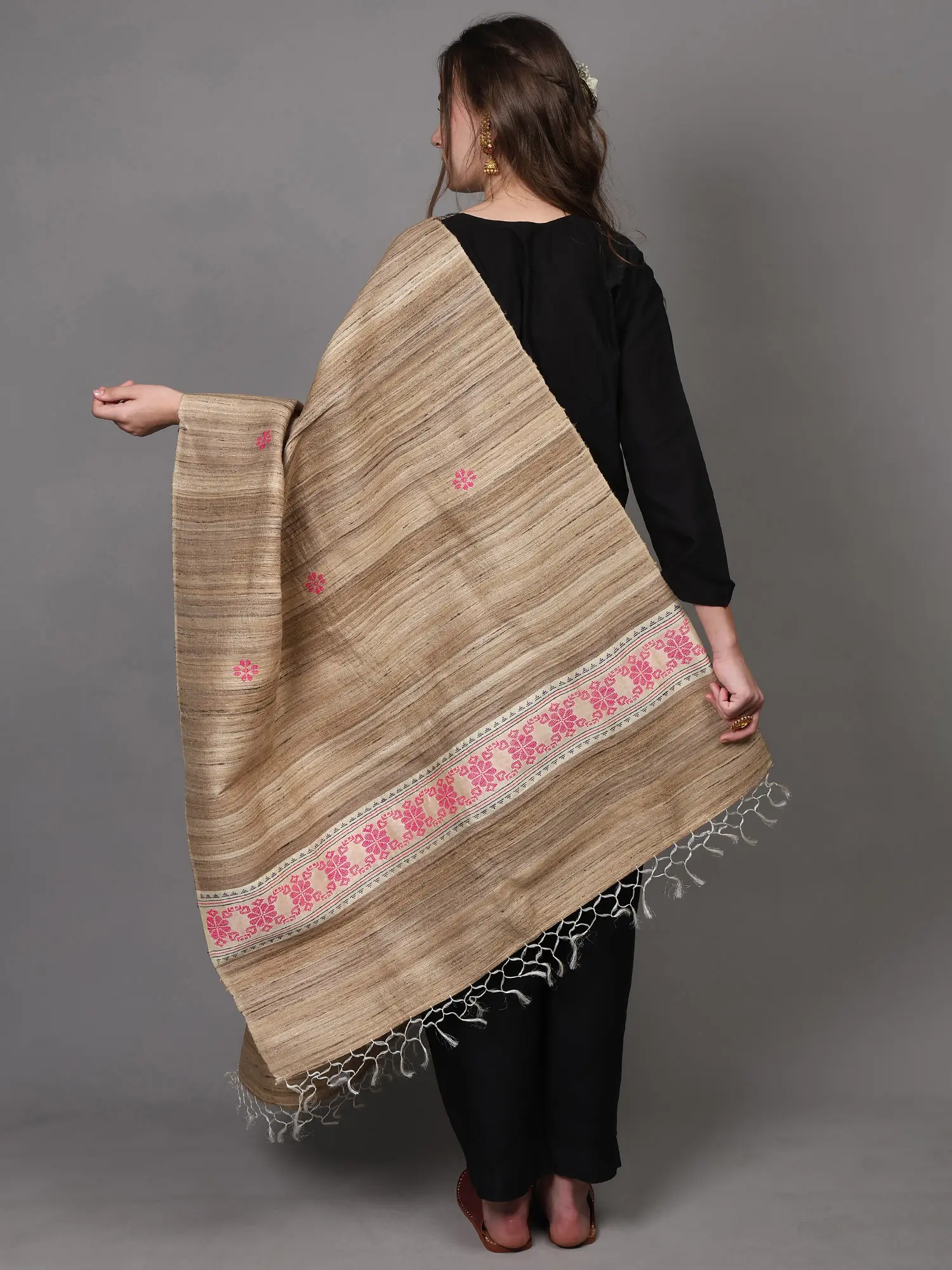 The subtle, warm sand color of this dupatta exudes understated sophistication. It serves as a versatile backdrop for the delicate thread-woven bootis that adorn the fabric. These intricate floral motifs are carefully placed across the dupatta, adding a touch of femininity and elegance. The border features a more elaborate design, providing a beautiful contrast to the overall simplicity of the piece. Fine tassels line the edges, adding a playful and refined finishing touch.