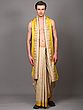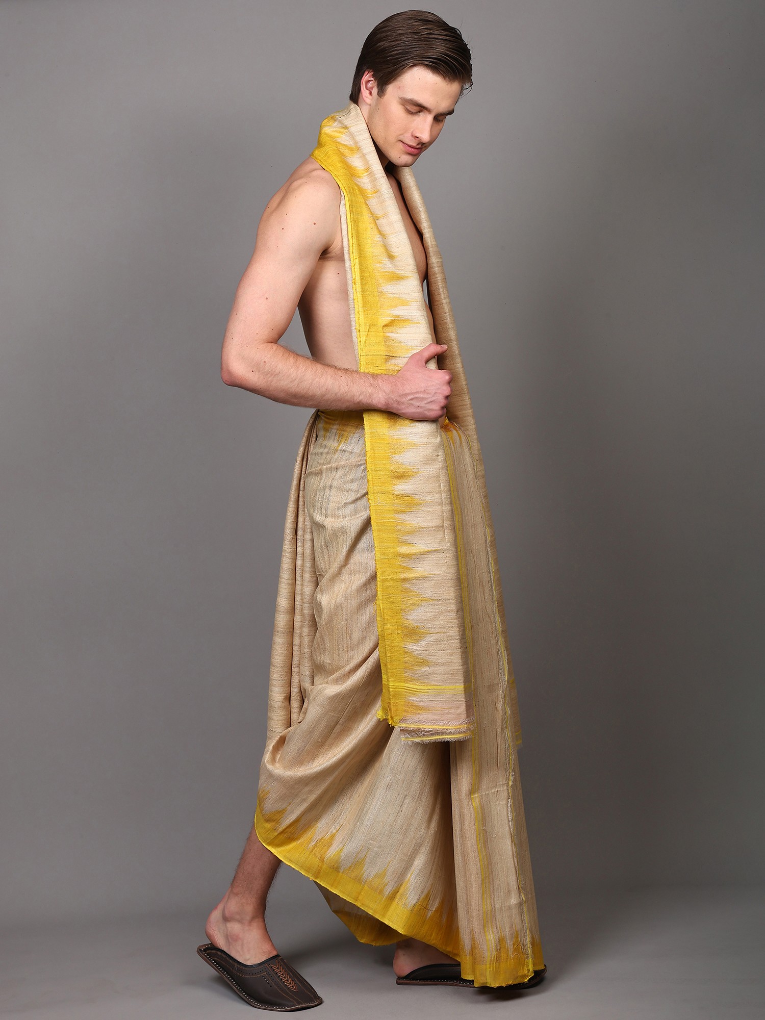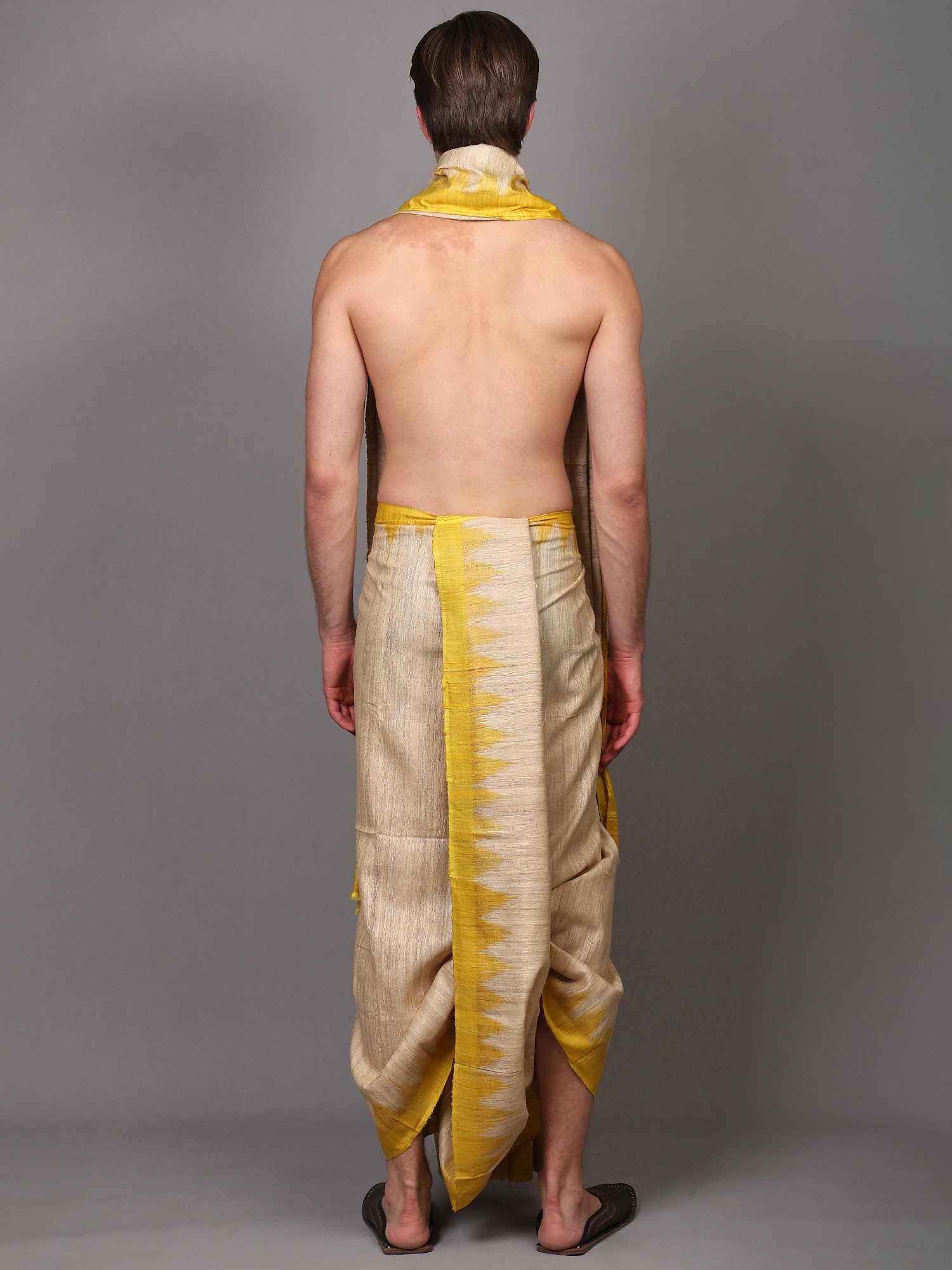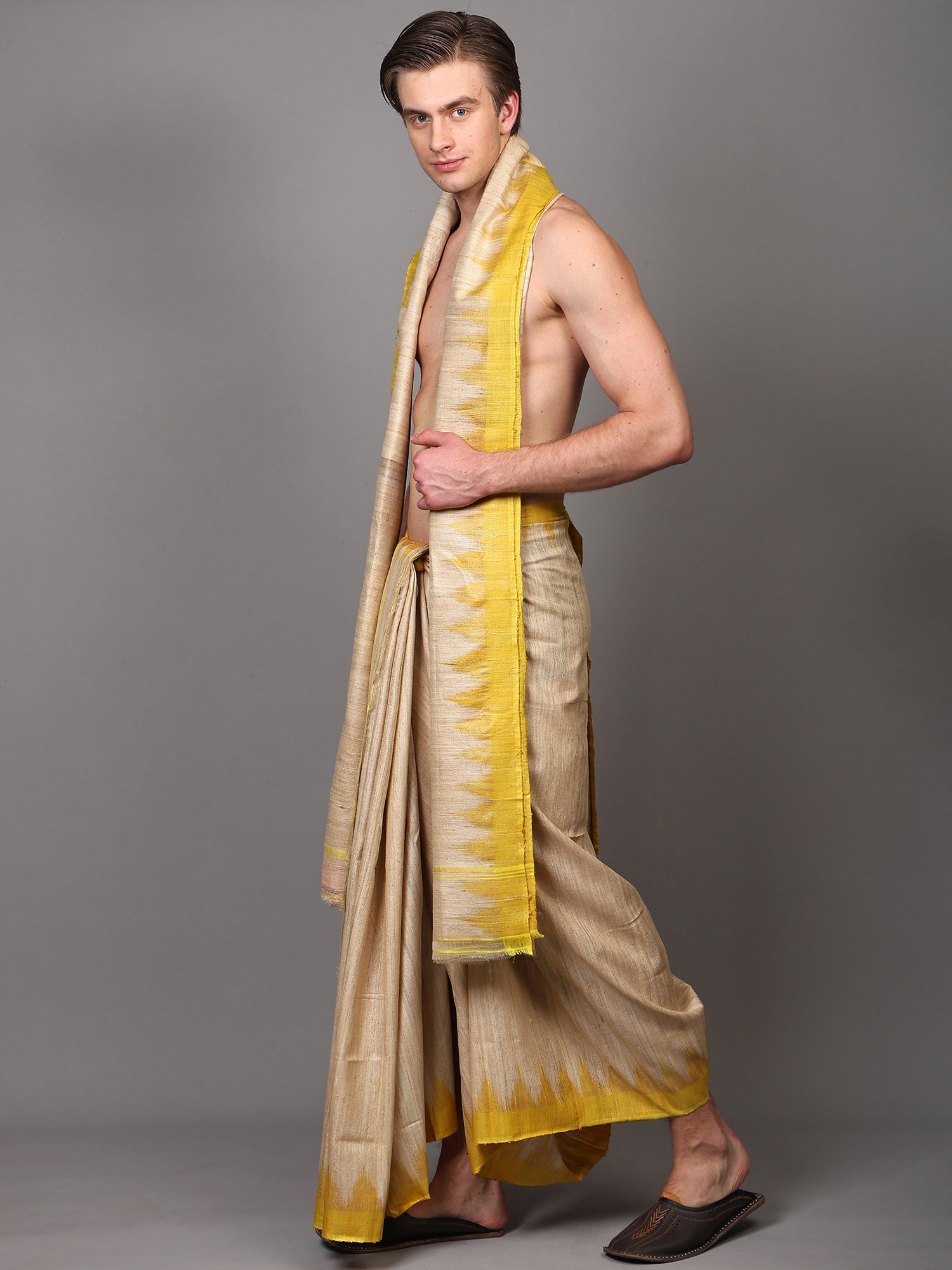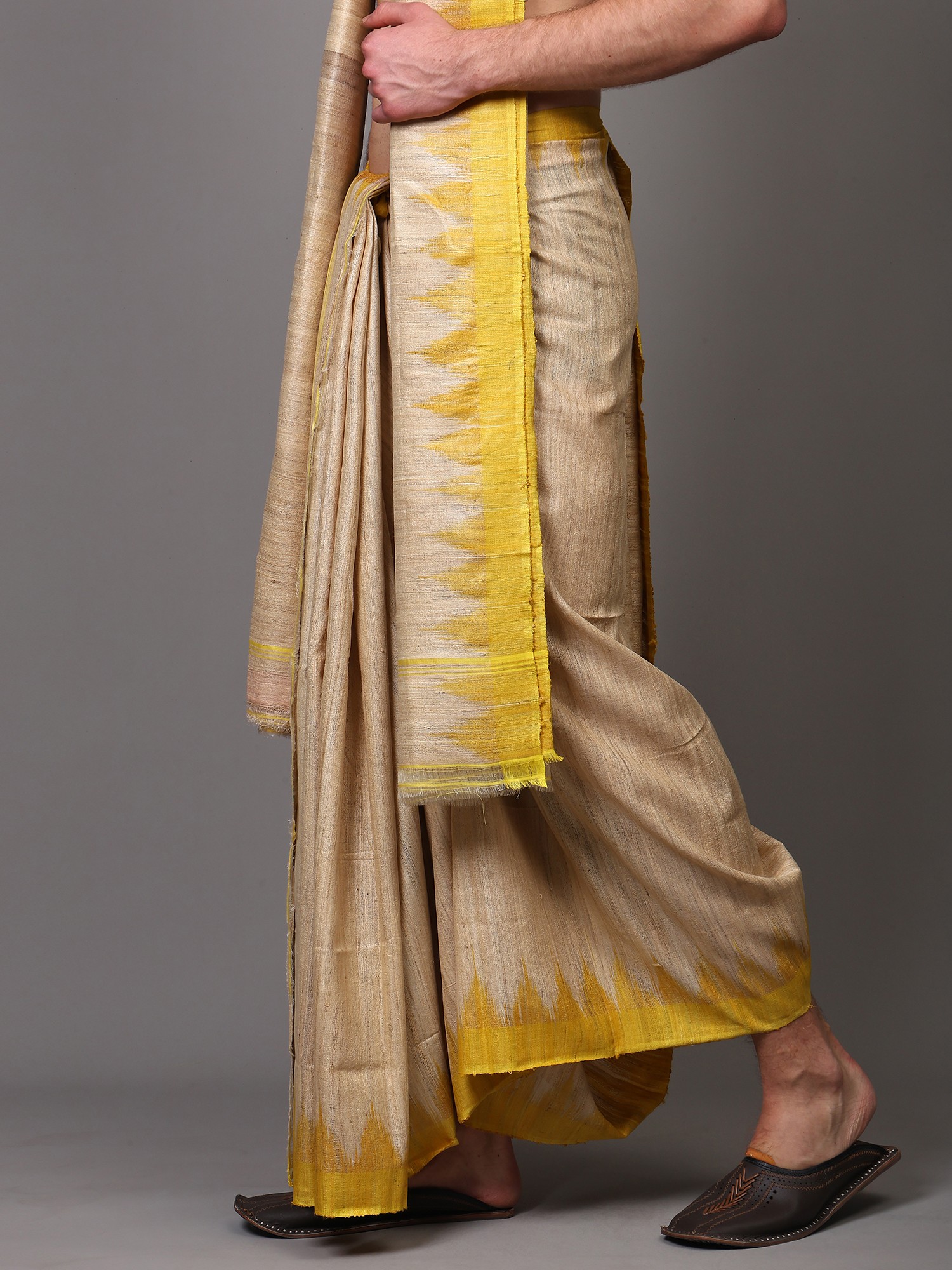 Warm-Sand Temple Border Pure Tussar Silk Dhoti with Angavastram Set from Odisha