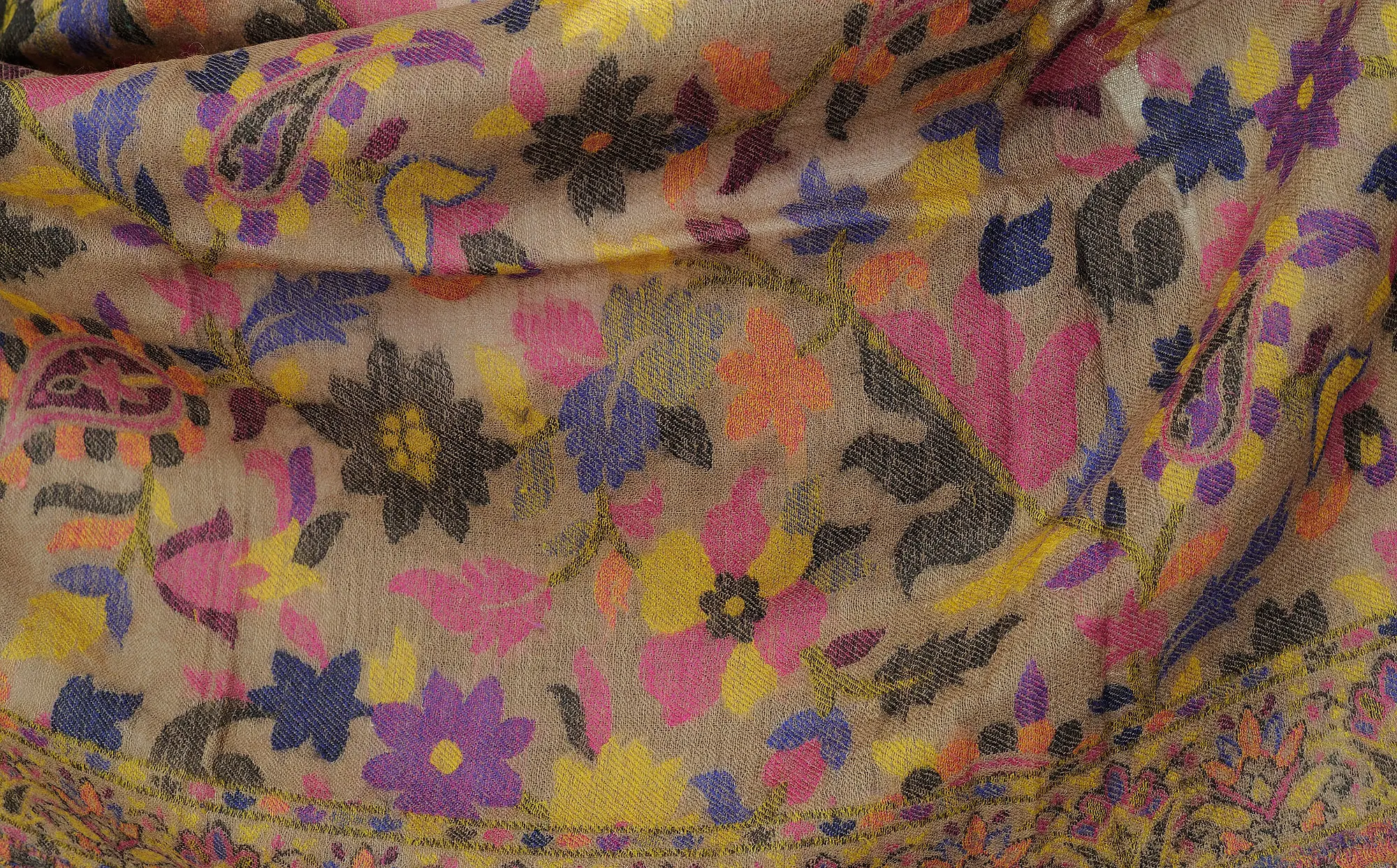 Experience the grandeur of Kashmiri craftsmanship with our Warm-Taupe Kani Shawl. This masterpiece boasts exquisite flowers woven in a medley of multi-colored threads. The intricate Kani weaving, a tradition passed down through generations, makes every shawl a work of art. This warm taupe shade reflects the serene landscapes of Kashmir. The luxurious softness of the fabric adds to the overall sensory experience. A combination of ancient artistry and contemporary style, this shawl is a timeless accessory, reflecting the elegance and legacy of Kashmiri culture.