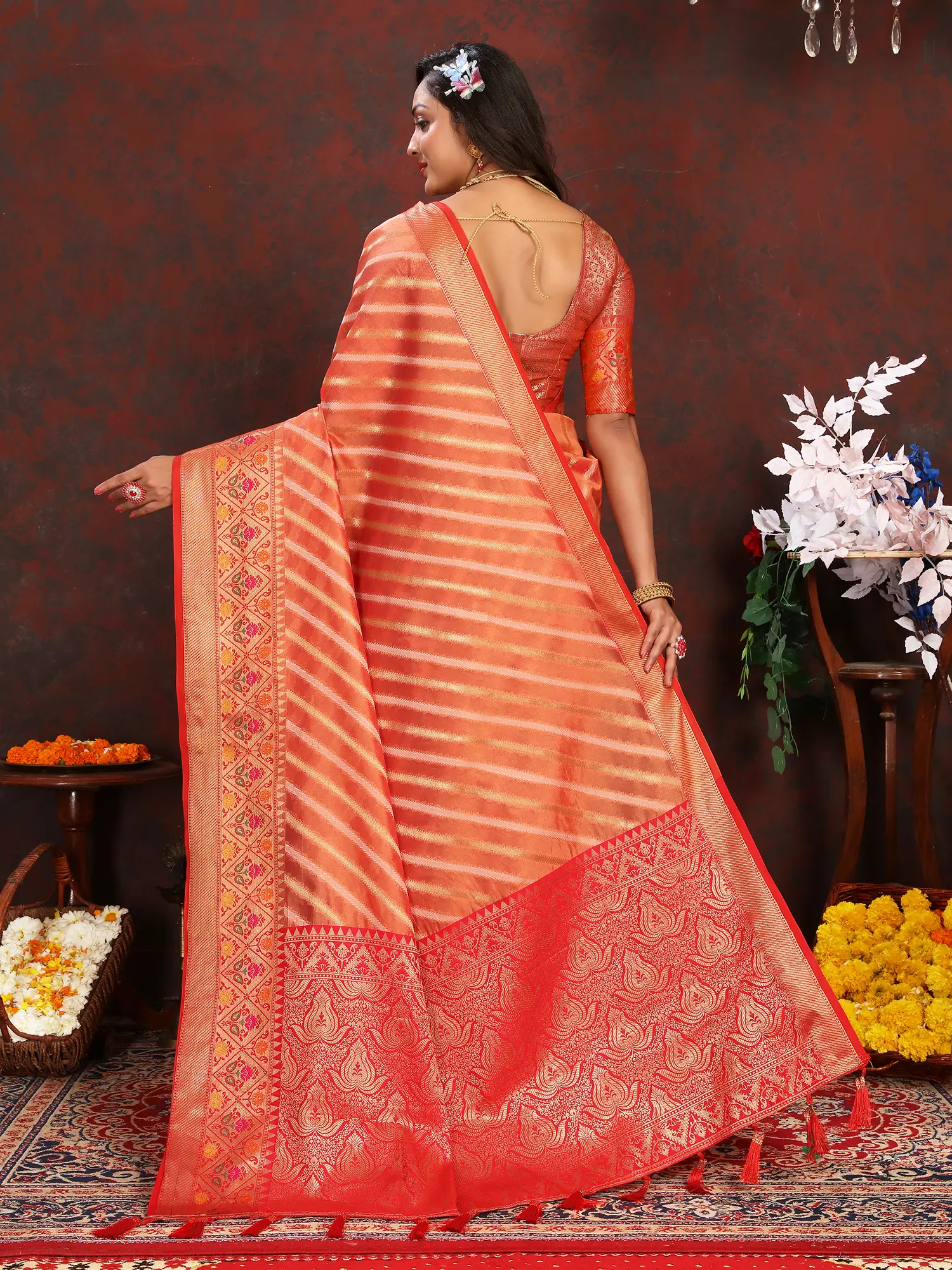 Peach-Pink Pure Silk Handloom Saree from Bangalore with Zari Weave