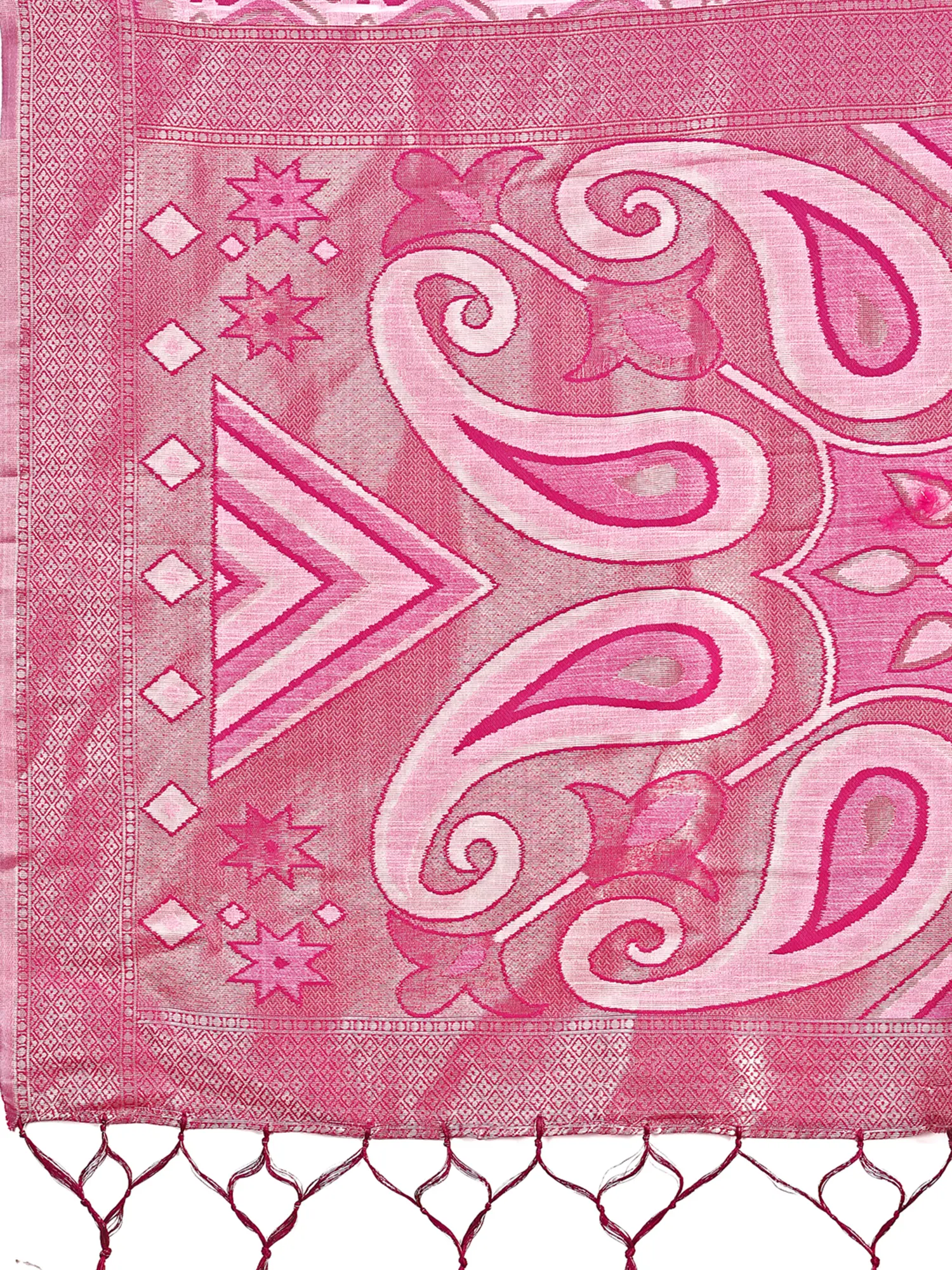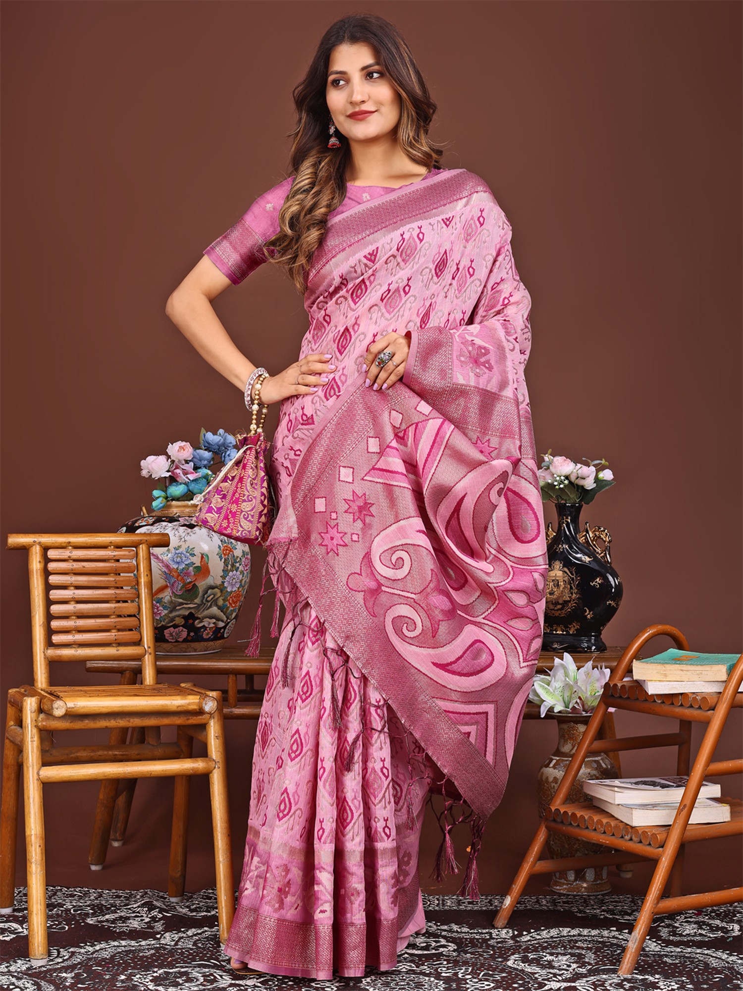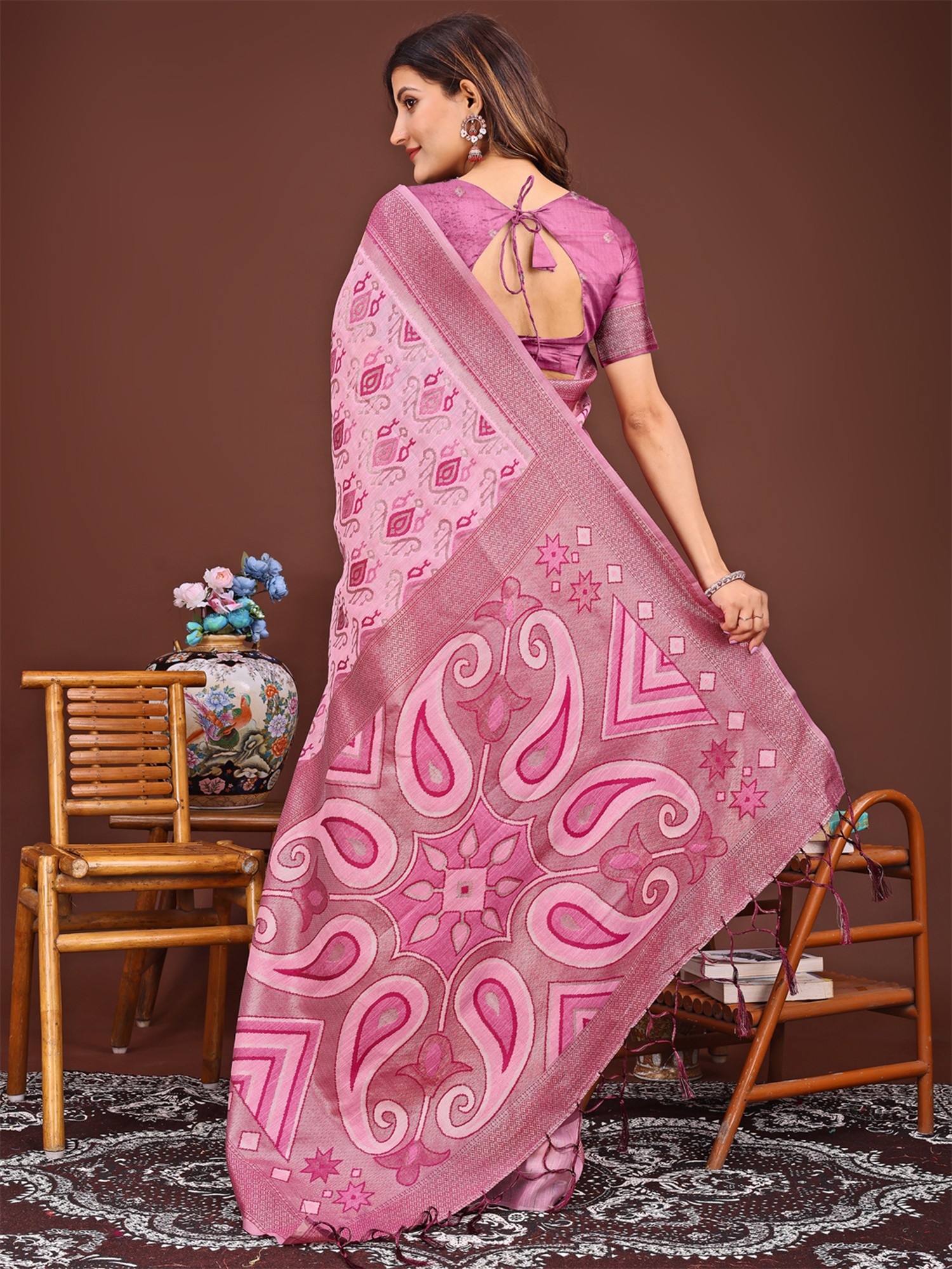 The beauty of this saree lies in its meticulous weaving. Every thread tells a story of dedication and skill. The subtle texture of the linen cotton adds depth and richness to the overall design. The body of the saree features a captivating pattern that lends an air of mystique. The captivating pallu with paisley motifs is what truly sets this saree apart. These classic designs are rendered with precision and artistry, creating a visual masterpiece that drapes beautifully. The pallu adds a touch of regal charm.