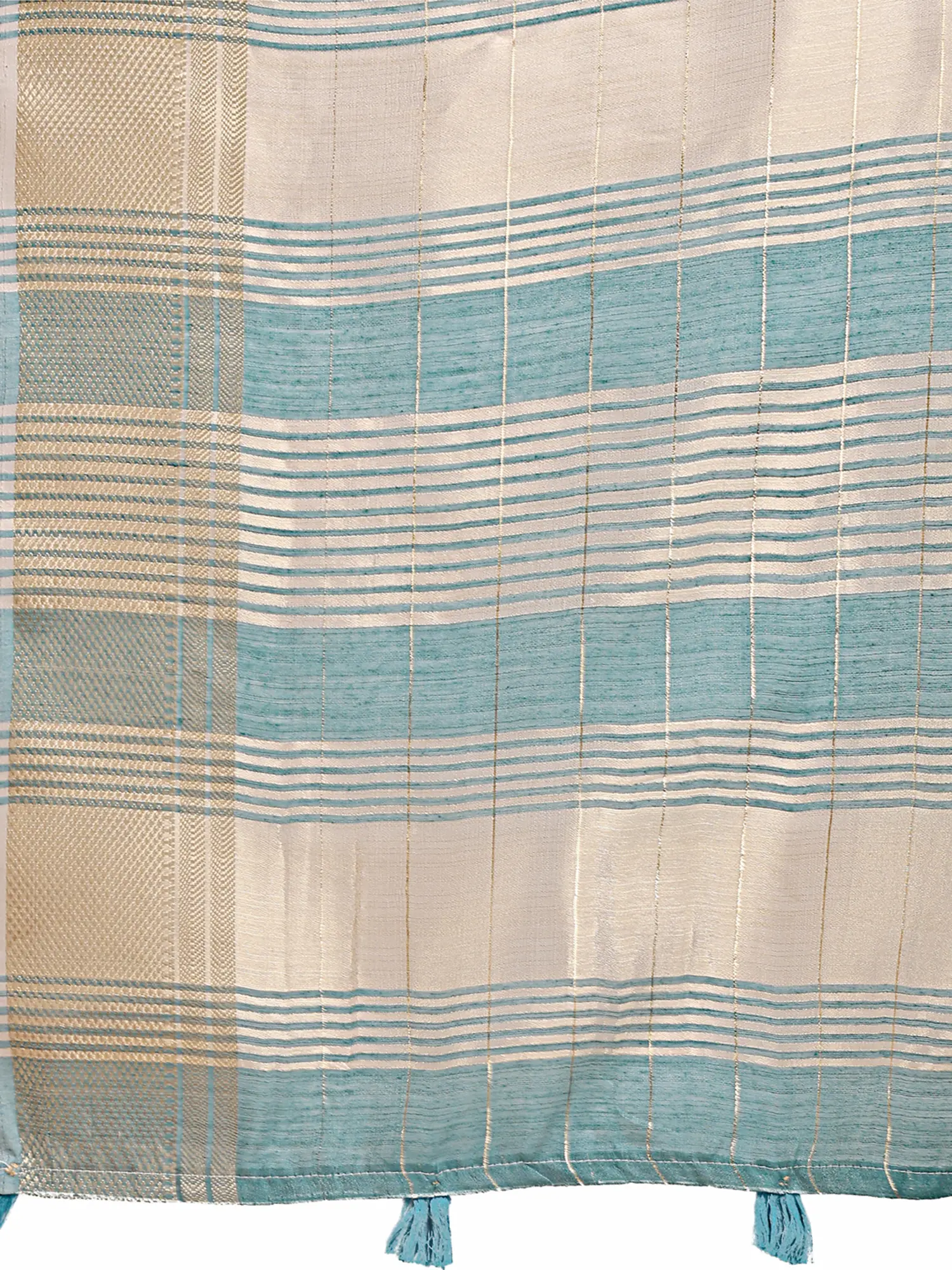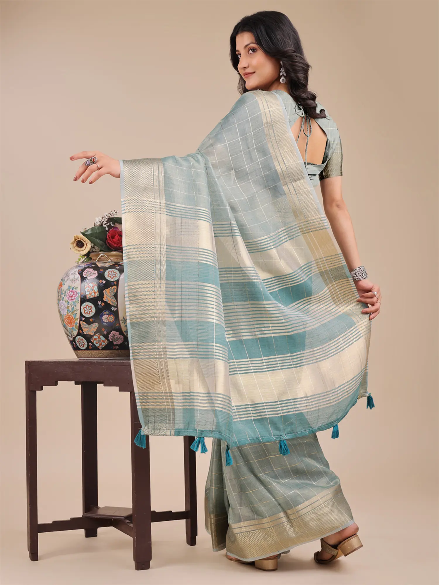 Stripes Pattern All Over Stunning Organza Saree With Contrast Tassels Pallu