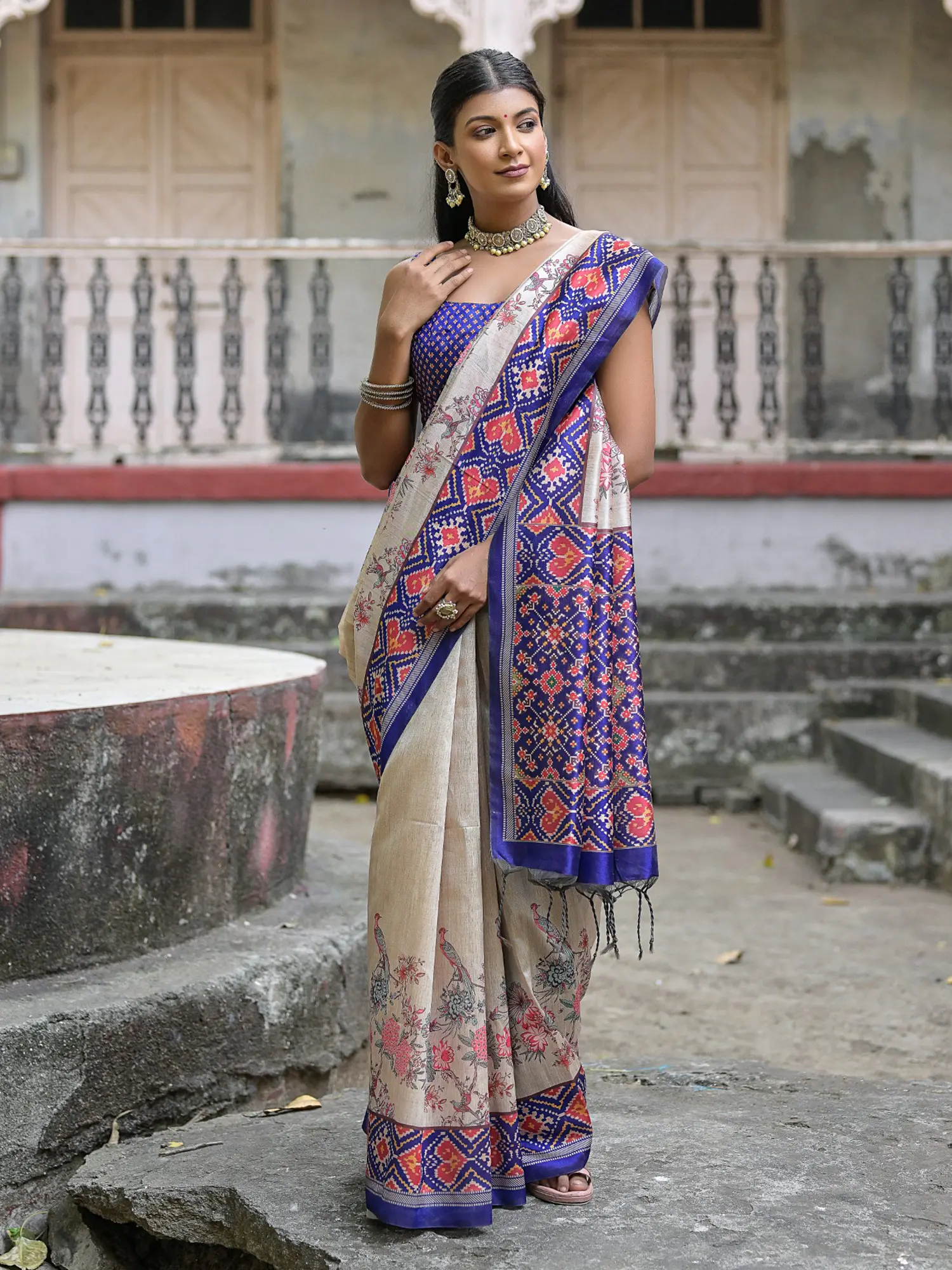 With a traditional Patola print on the pallu, the Tussar silk saree is paired with a matching blouse, a perfect ensemble for festive and formal days.