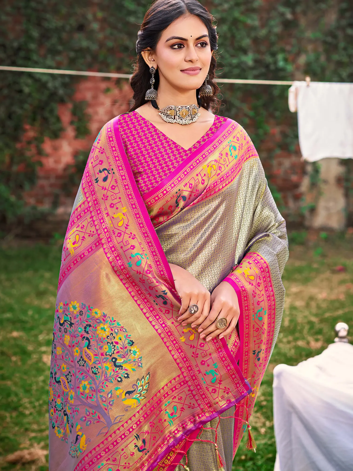 Purple-Magic Paithani Silk Sari with Hand-Woven Peacocks on Aanchal