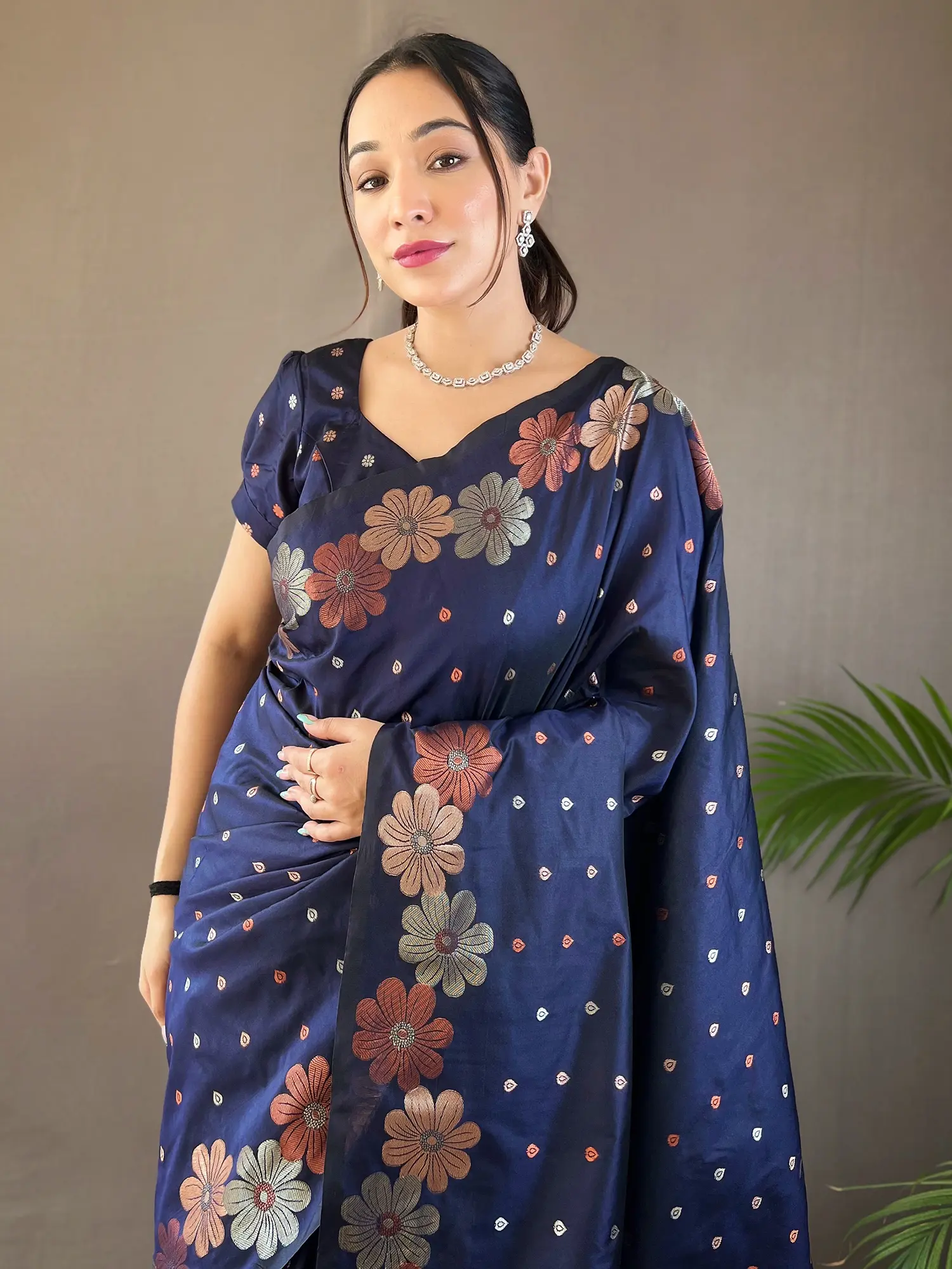 The pallu of this saree is a particular highlight, featuring a more concentrated and dramatic display of the captivating floral design. This striking border draws the eye and provides a stunning focal point, framing your posture with artistic flair. The interplay of the deep indigo base with the vibrant and varied floral palette creates a dynamic contrast that is both bold and harmonious. The lustrous sheen of the silk catches the light, enhancing the richness of the colors and the intricate details of the weaving. This is more than just a garment; it's a wearable piece of art that embodies tradition with a contemporary spirit, making it an ideal choice for those who appreciate the finer things in life and wish to express their personal style with confidence and grace. ––––––––––––––––––––