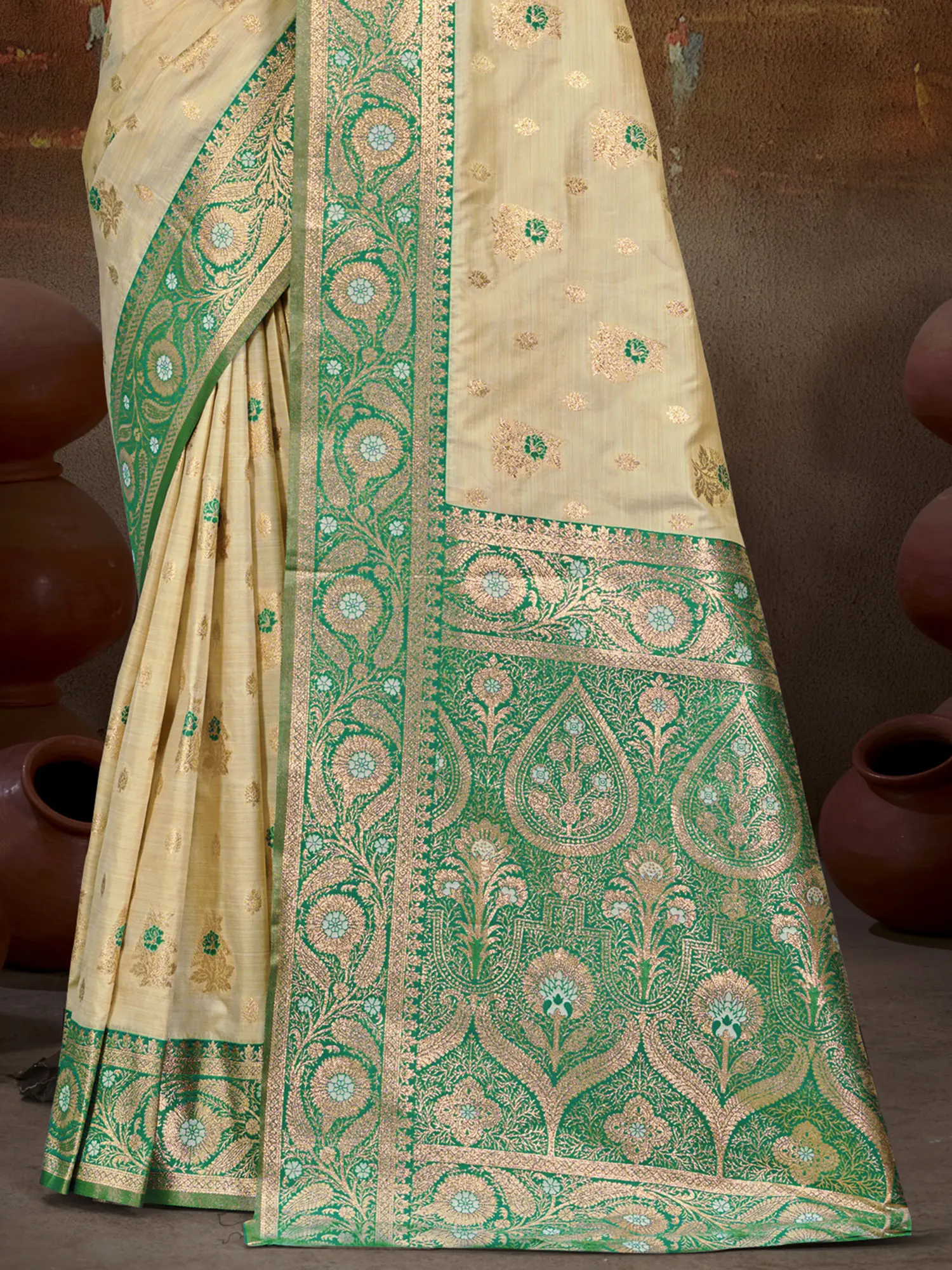 The true artistry of this saree is revealed in its borders and pallu. A striking contrast is introduced by a rich, deep green border that frames the cream expanse of the saree. This border is a masterpiece of traditional weaving, featuring elaborate floral and paisley patterns rendered in a mesmerizing combination of gold and subtle, shimmering accents. The design is dense and detailed, showcasing the skill of the artisans who have brought this fabric to life. The pallu, the decorative end of the saree, is where this artistry reaches its zenith. It is a grand tapestry of intricate weaving, featuring larger, more pronounced floral motifs and traditional paisley designs in the same opulent gold and green palette. The sheer density and intricacy of the pallu's design make it a statement piece, designed to be draped and admired.