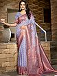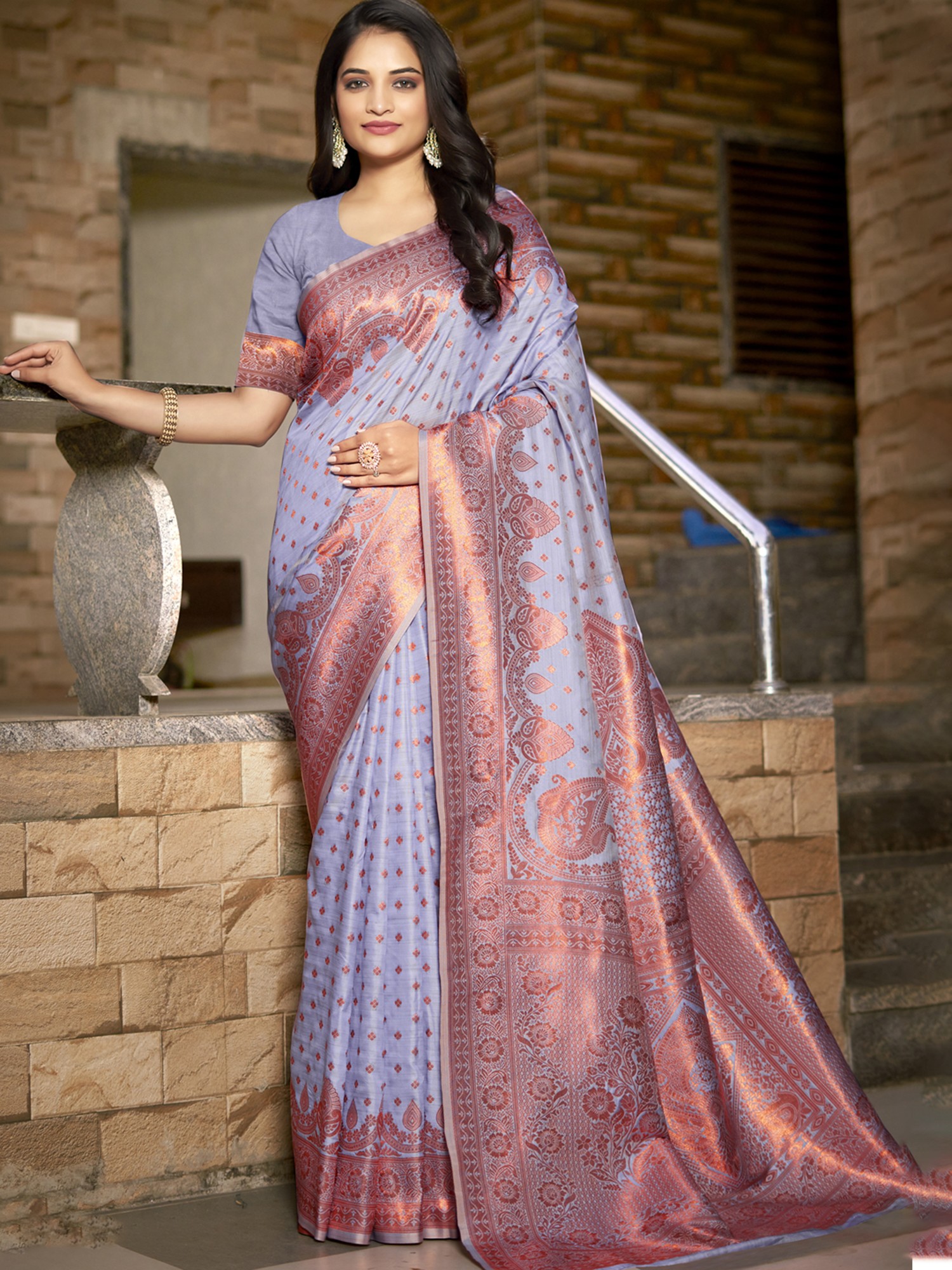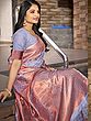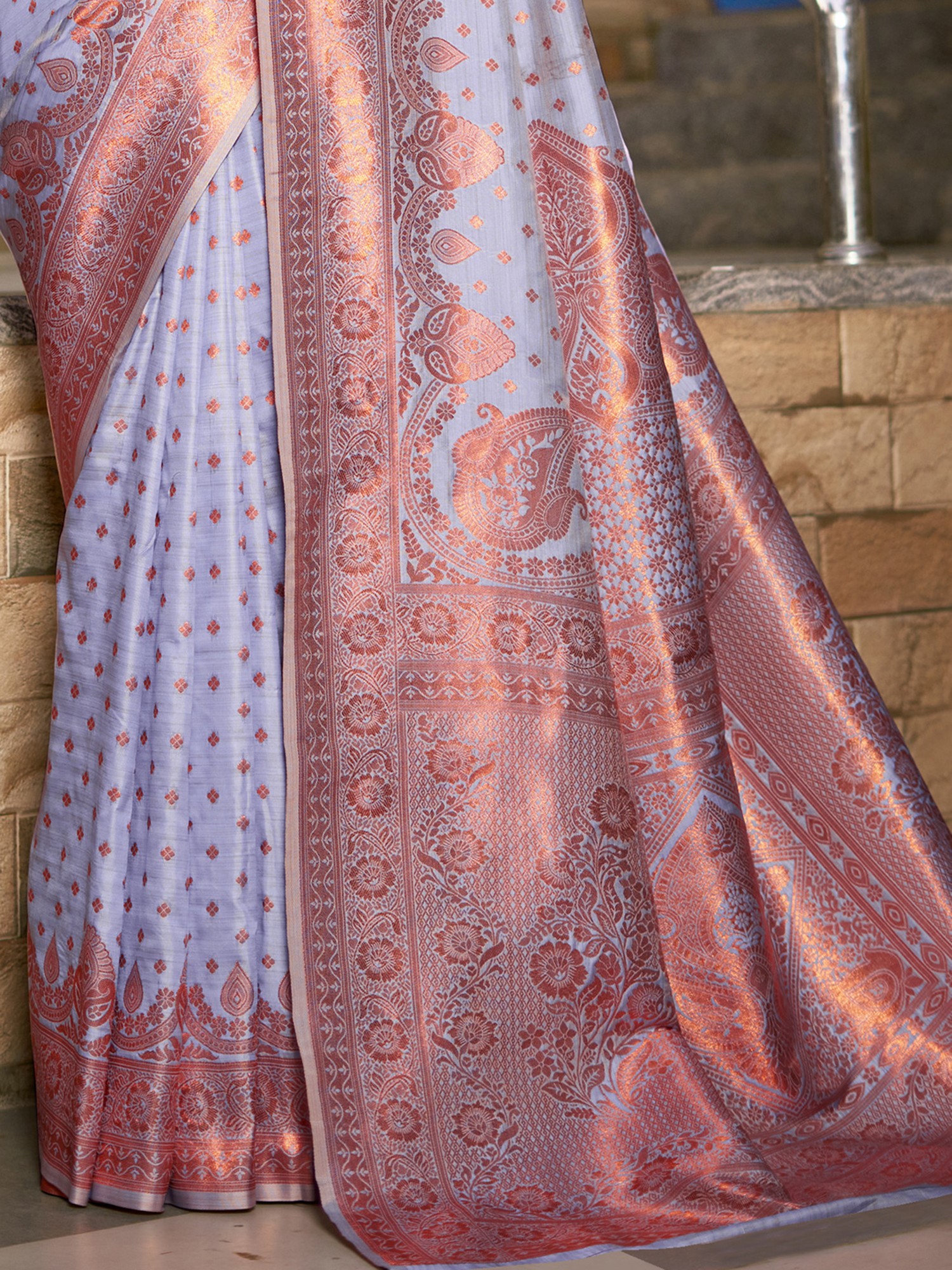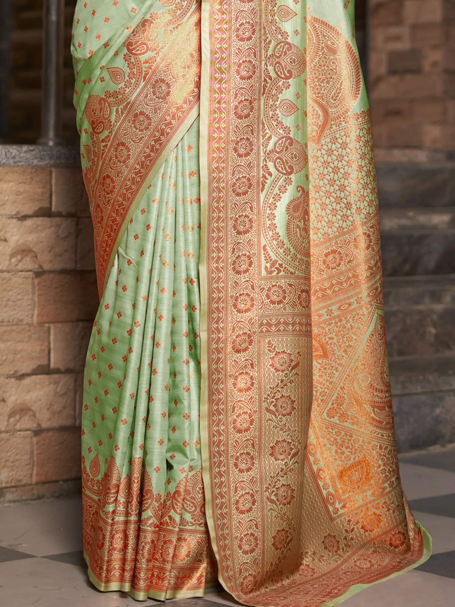 The delicate interplay of color and texture creates a captivating visual experience. The saree's body features intricate woven motifs that dance across the fabric, catching the light with every movement. The wide border is a statement of pure elegance, its rich detailing drawing the eye and framing the saree with graceful precision. The luxurious fabric drapes beautifully, enhancing your natural curves and lending an air of effortless sophistication.