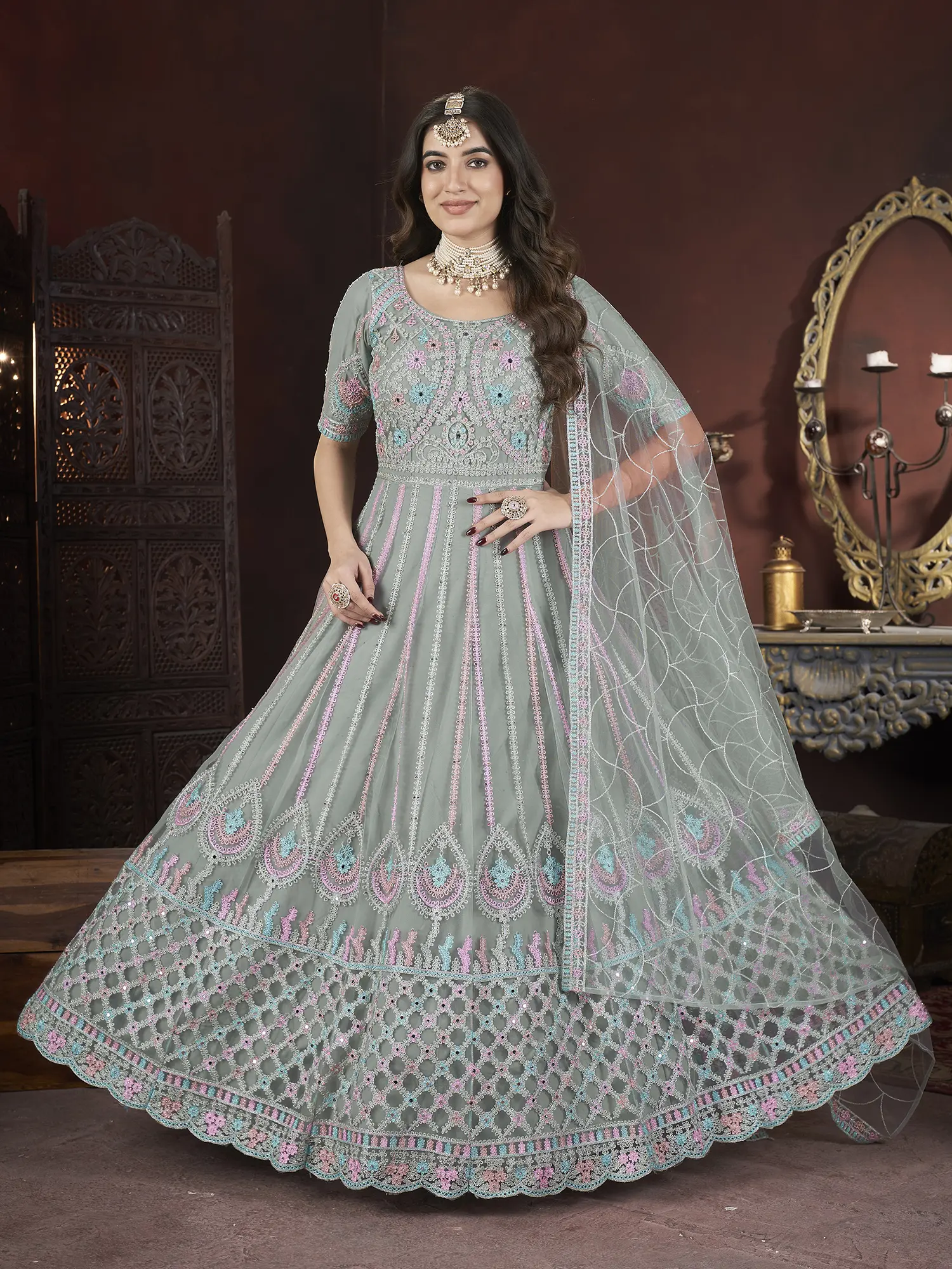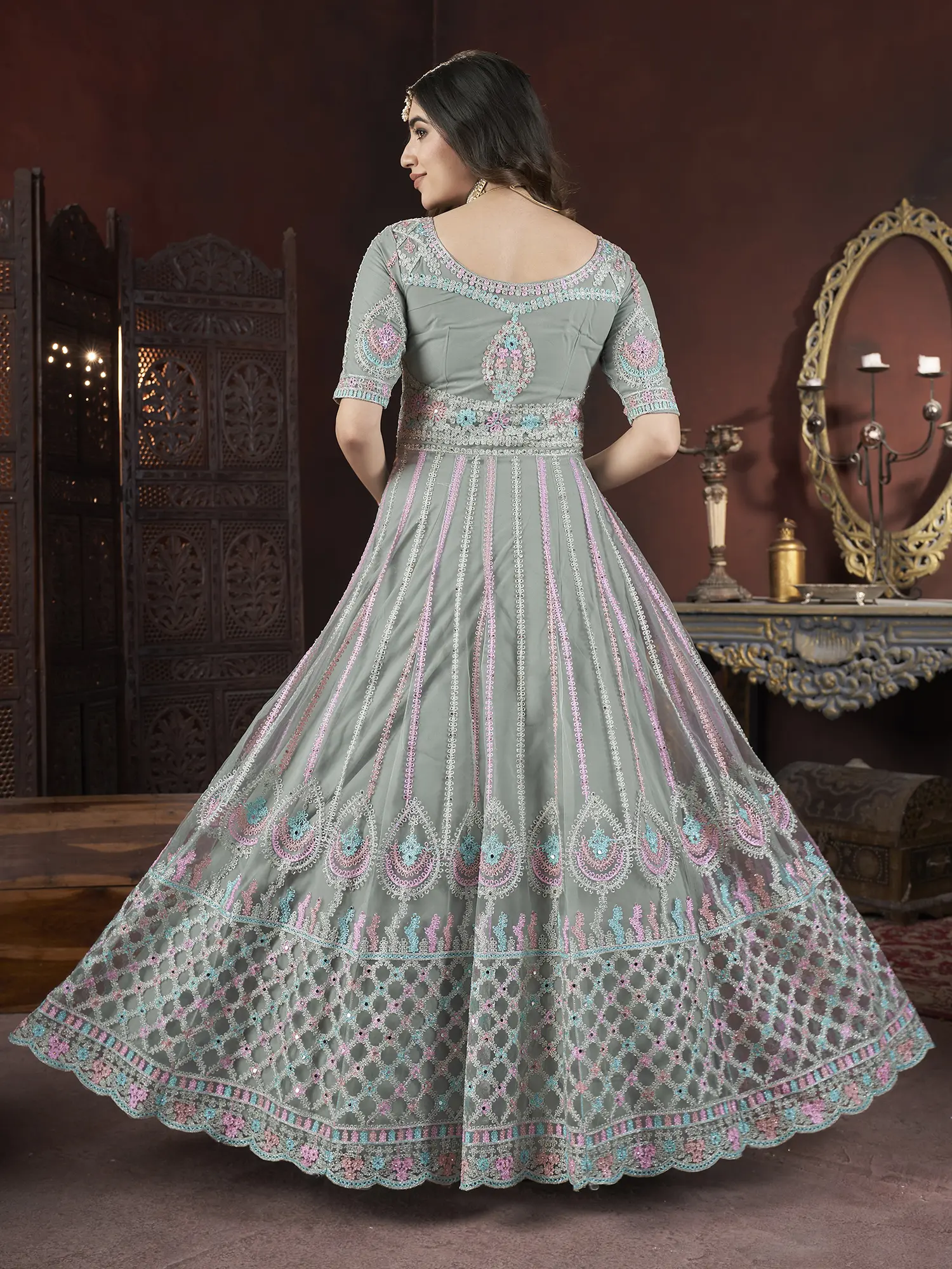 Faded-Pink Party Wear Net Thread Embroidery And Zarkan Designer Gown With Dupatta