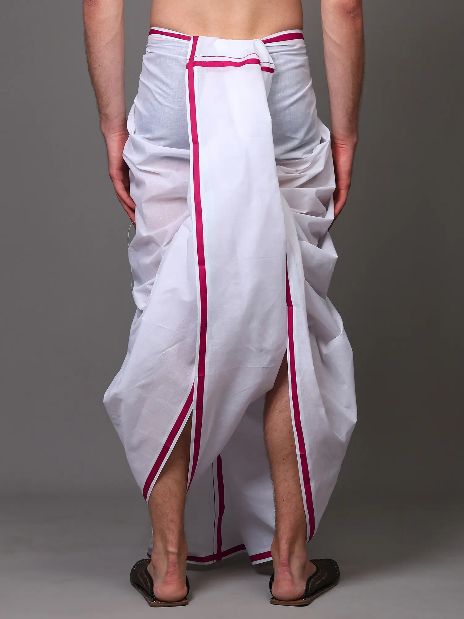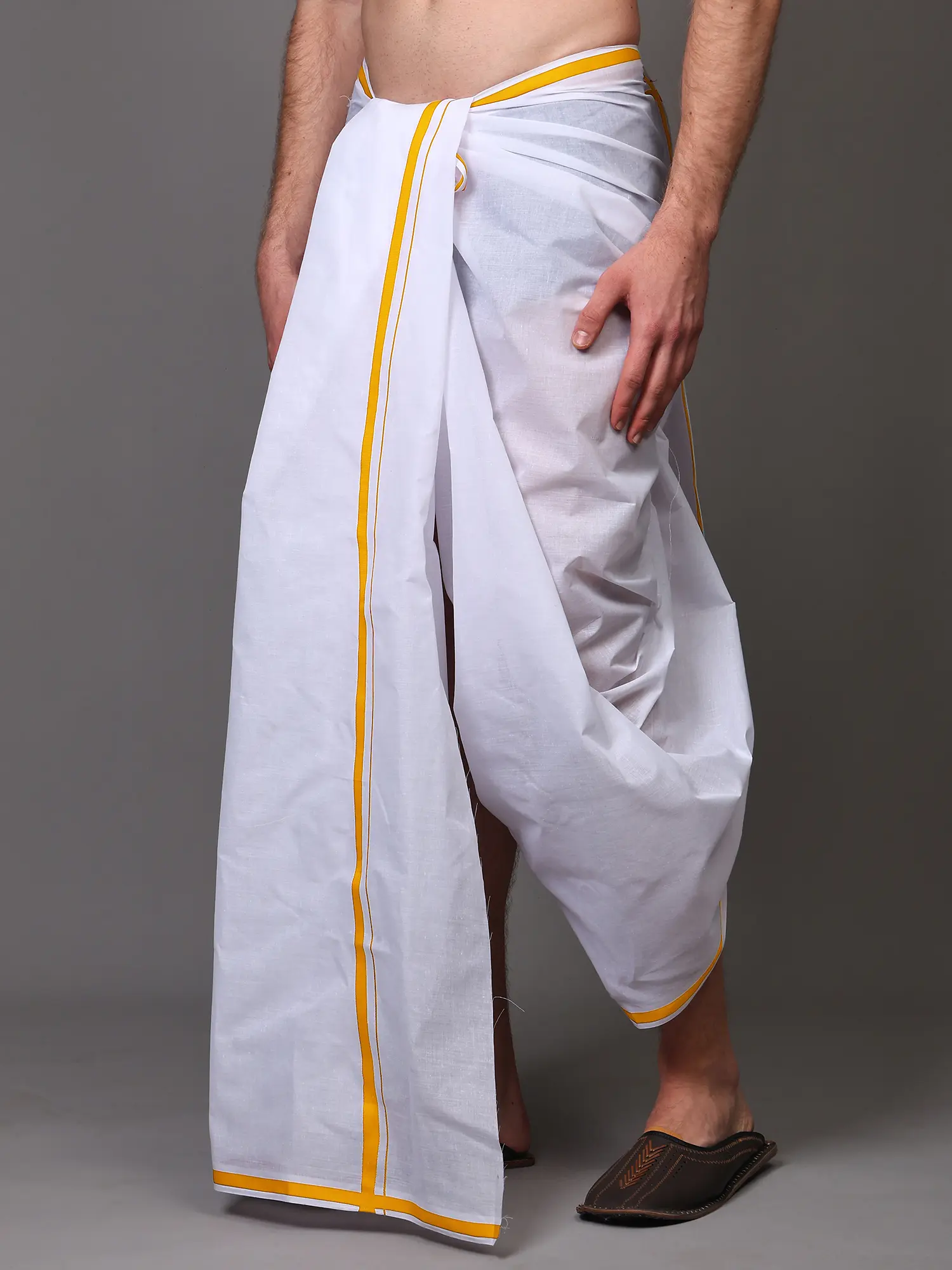 The striking woven border, featuring a subtle yet elegant design, elevates this dhoti beyond a simple garment. This intricate detail provides a focal point and a touch of regal charm, ensuring you stand out with grace. The classic draping style allows for freedom of movement and a comfortable, relaxed fit, embodying a sense of effortless style. Whether you are attending a traditional ceremony, a festive gathering, or simply seeking comfortable everyday wear, this dhoti is a versatile choice that exudes cultural heritage and refined taste.