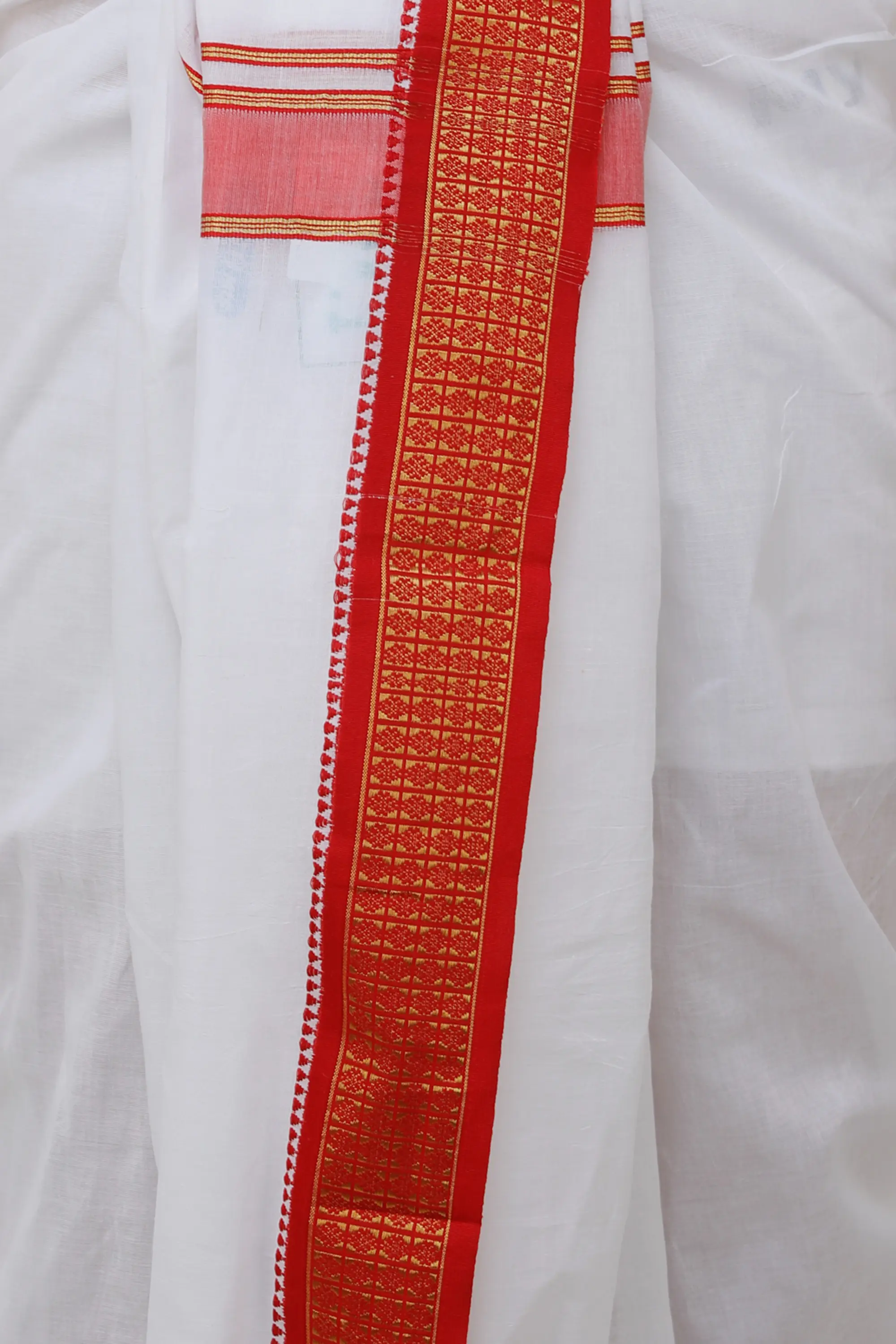 The Bomkai weave, originating from Odisha, is renowned for its elaborate patterns and meticulous craftsmanship. This particular border features a rich, ornate design in striking red and gold hues. The geometric motifs, meticulously woven into the fabric, add a touch of luxury and cultural depth. This border isn't just an embellishment; it's a statement of heritage and skilled artistry, making this dhoti a truly special piece.