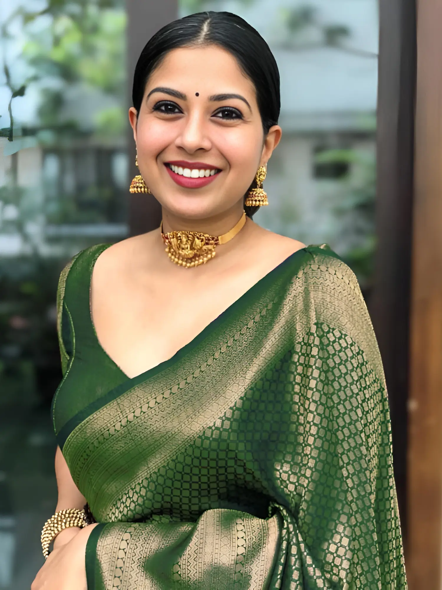 This saree is a beautiful standalone piece, but you can enhance its beauty with carefully chosen accessories. Consider pairing it with gold jewelry, such as a delicate necklace and earrings, to complement the golden-bronze border. A simple clutch and elegant heels will complete the ensemble, creating a sophisticated and unforgettable look for any festive occasion. Let this saree be the centerpiece of your celebration!