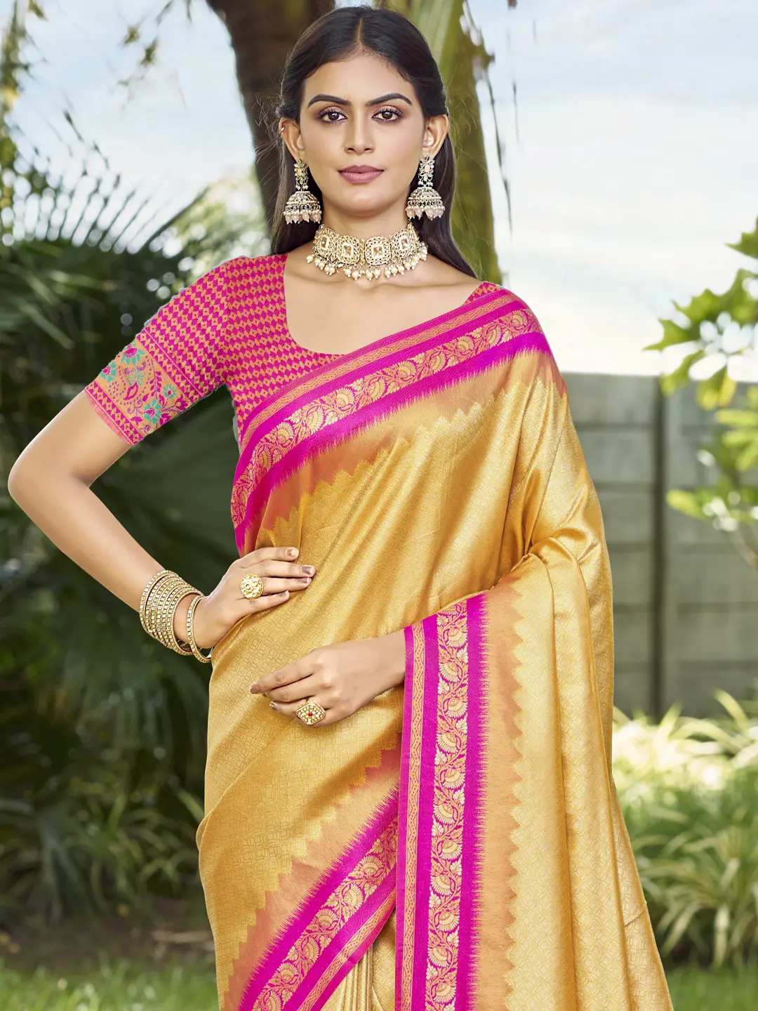 Step into a world of timeless elegance with this exquisite silk saree, a masterpiece designed to capture the essence of celebratory occasions. Crafted from luxurious silk, this saree drapes beautifully, exuding a radiant sheen that speaks of opulence and refinement. The rich, warm tone of the silk is enhanced by intricate weaving patterns that catch the light, creating a mesmerizing effect with every movement.