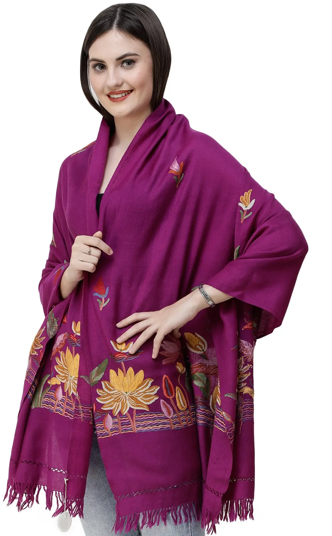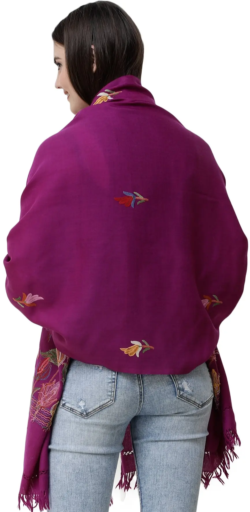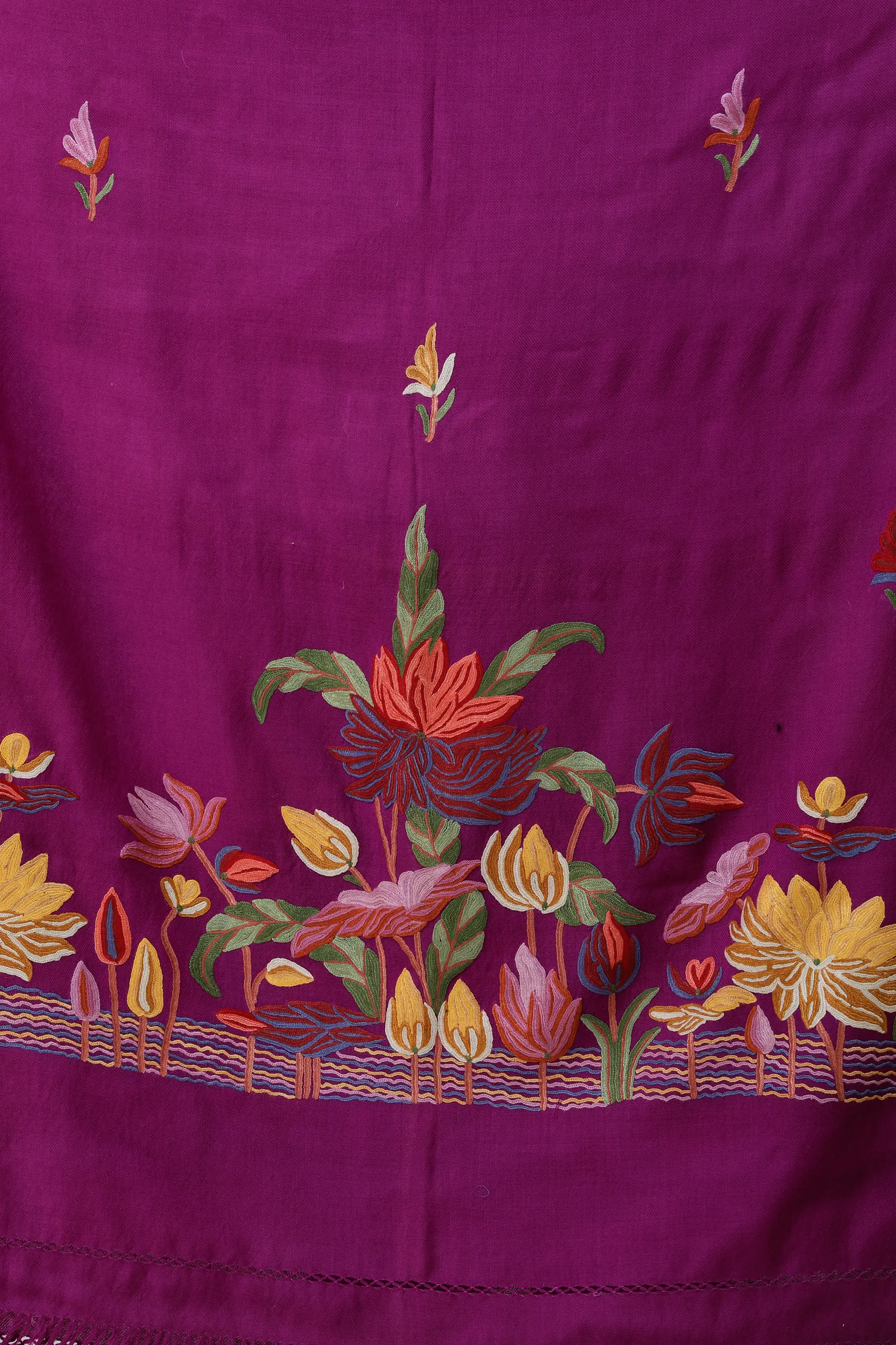Kashmir is enriched with the professional artisans for producing wool textiles; their accuracy, choice of colors and designs and the intricacy of their work quality allows it to be the finest producer of pure wool textiles all over the world. The one shown on this page, exhibits its quality of smartness and elegance by the deep and vibrating purple hue just like that of a wild aster, being used on a pure wool as the base. This particular shade when worn over any contrasting color like black, yellow, white etc will reflect the boldness, confidence and solidarity of the wearer. Its thin cut border and fringes on both the sides mark as an add on beauty to the stole.