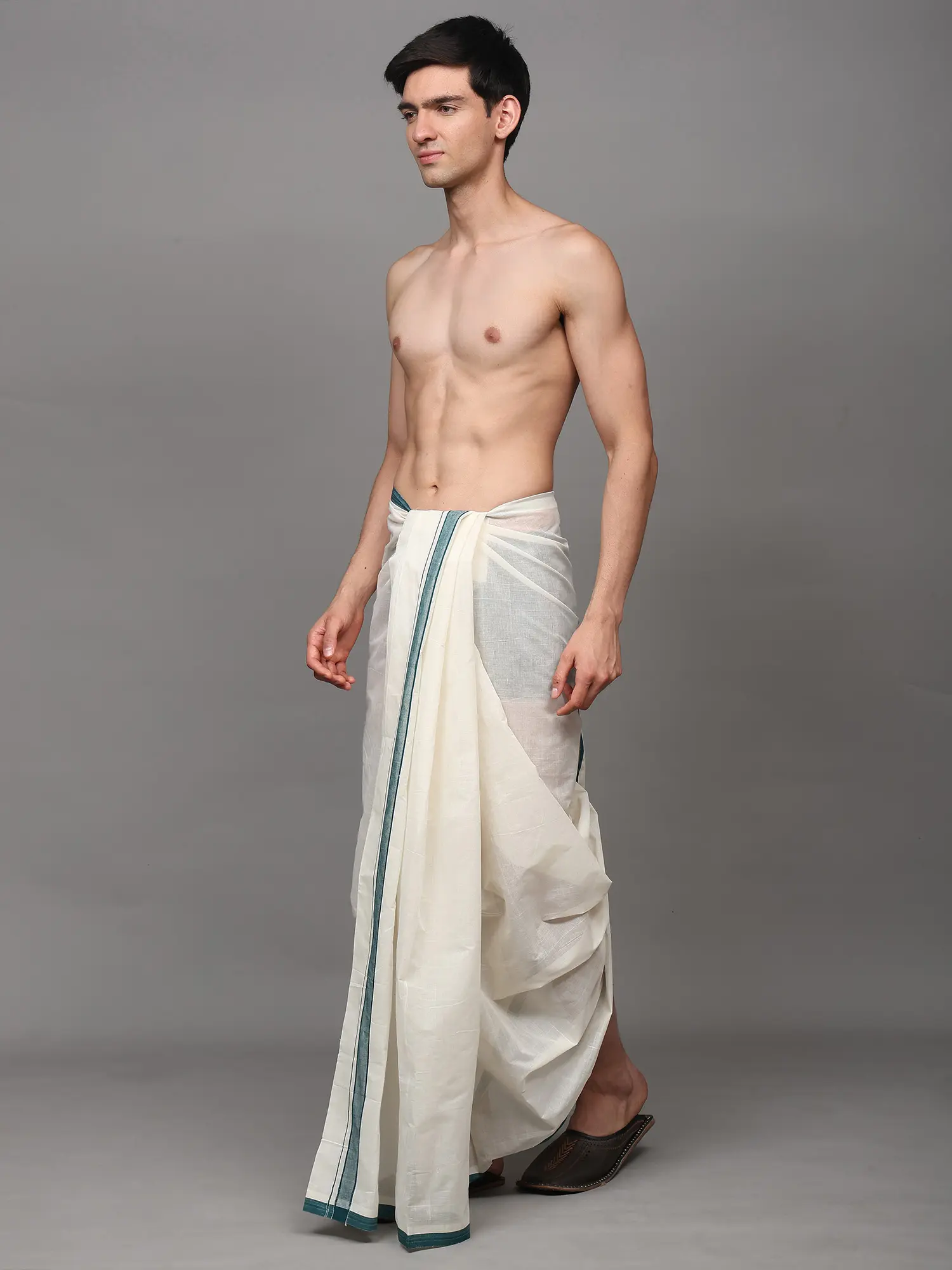 Antique-White Cotton Dhoti with Woven Stripes Border