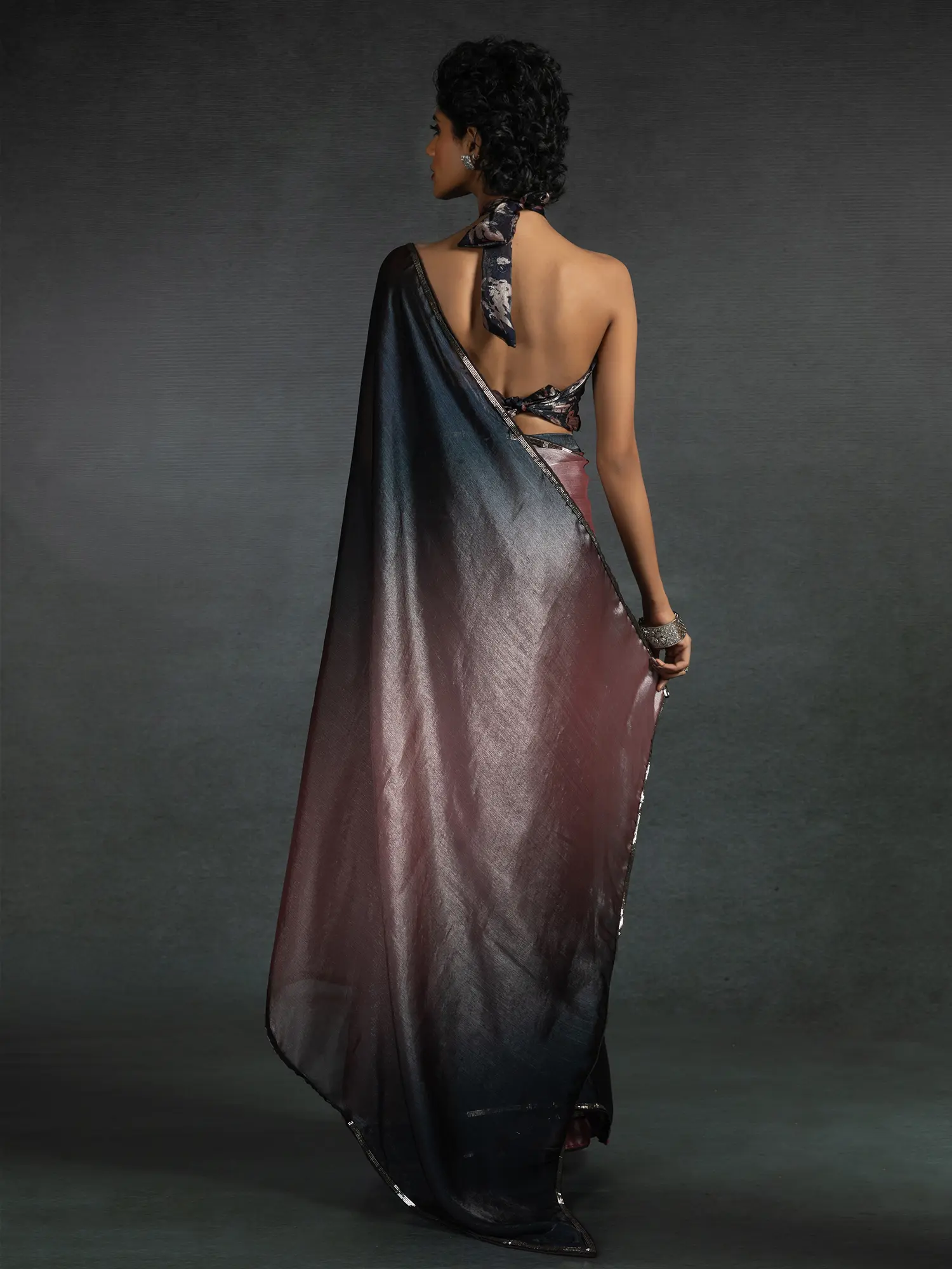 Experience the mesmerizing shift from a luminous silver-grey to a deep, enigmatic charcoal. This gradient effect, coupled with the lustrous satin silk, creates a dynamic visual appeal that is both modern and timeless. The accompanying blouse and underskirt are tailor-made for a flawless, bespoke fit, ensuring comfort and a perfect silhouette.