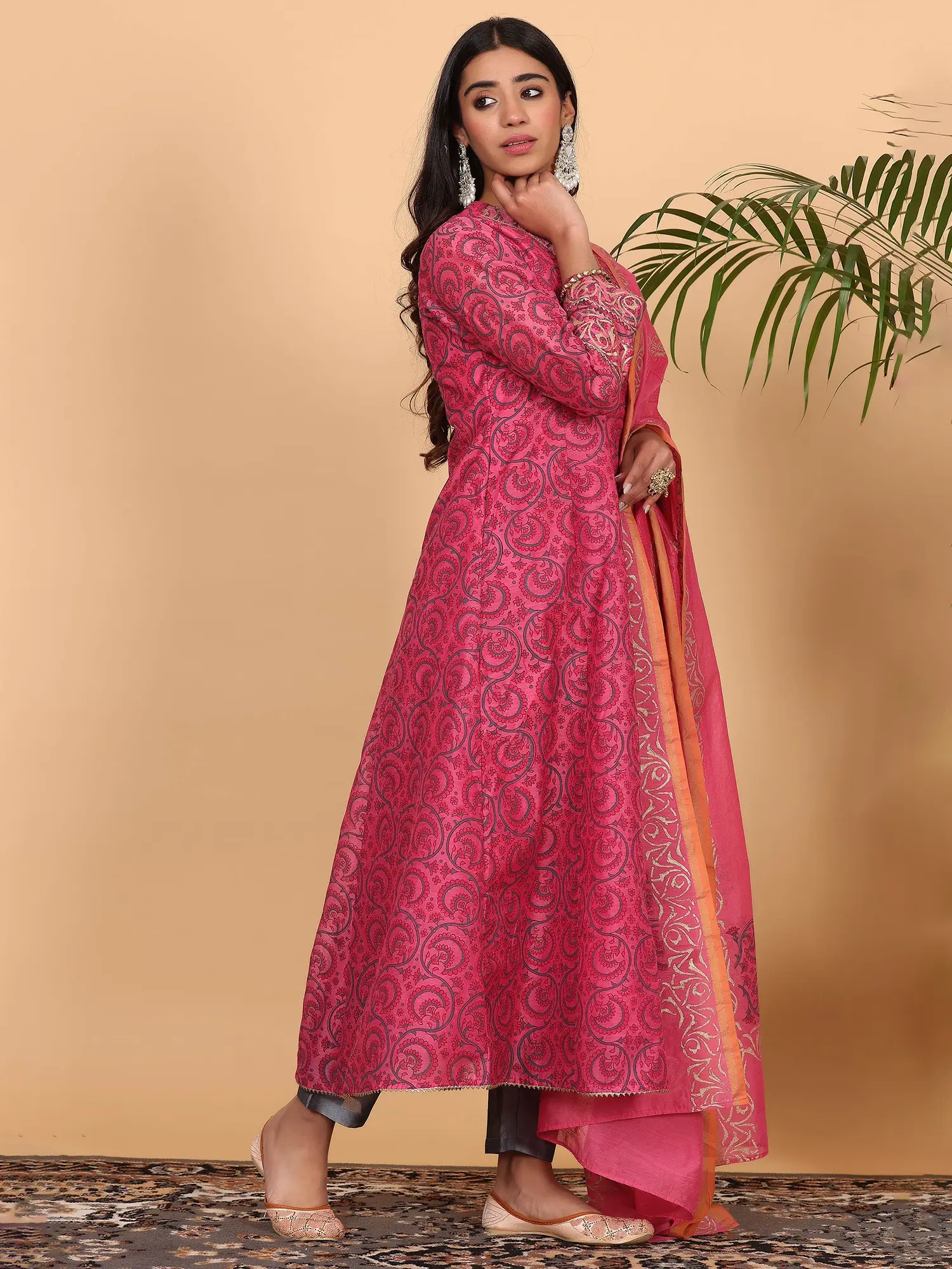 Chanderi Kurta Set With Floral Block Print And Silk Pants For Party Wear And Festive Occasion