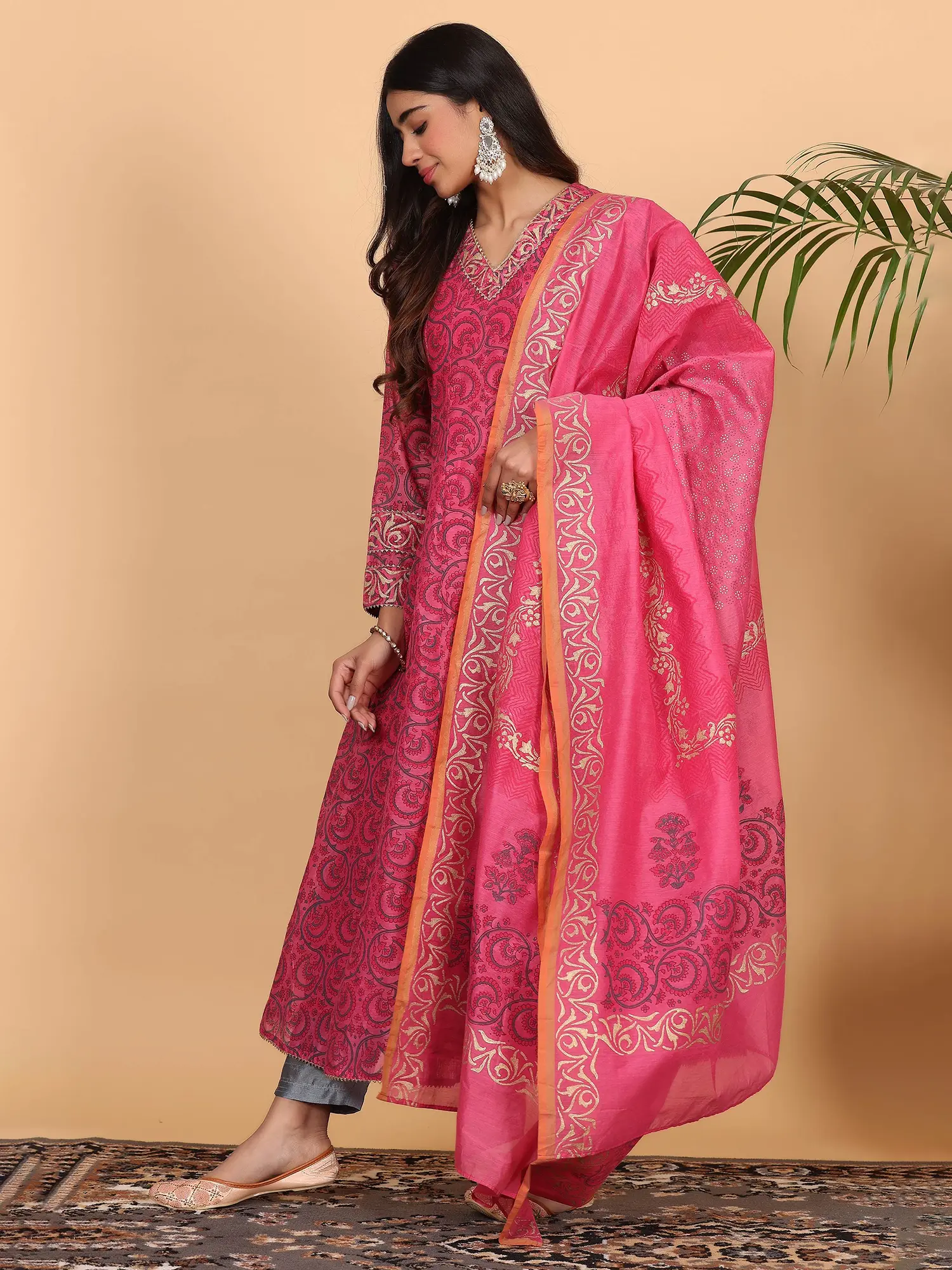 Women's Thread Embroidery A-Line Viscose Chanderi Kurta Set With Matching Dupatta