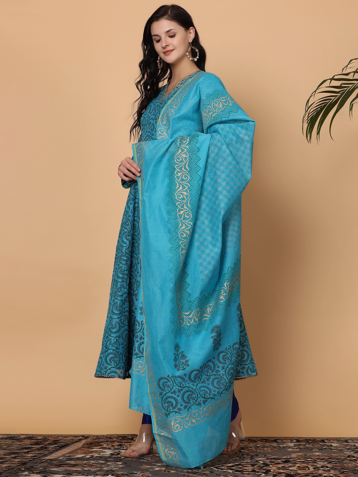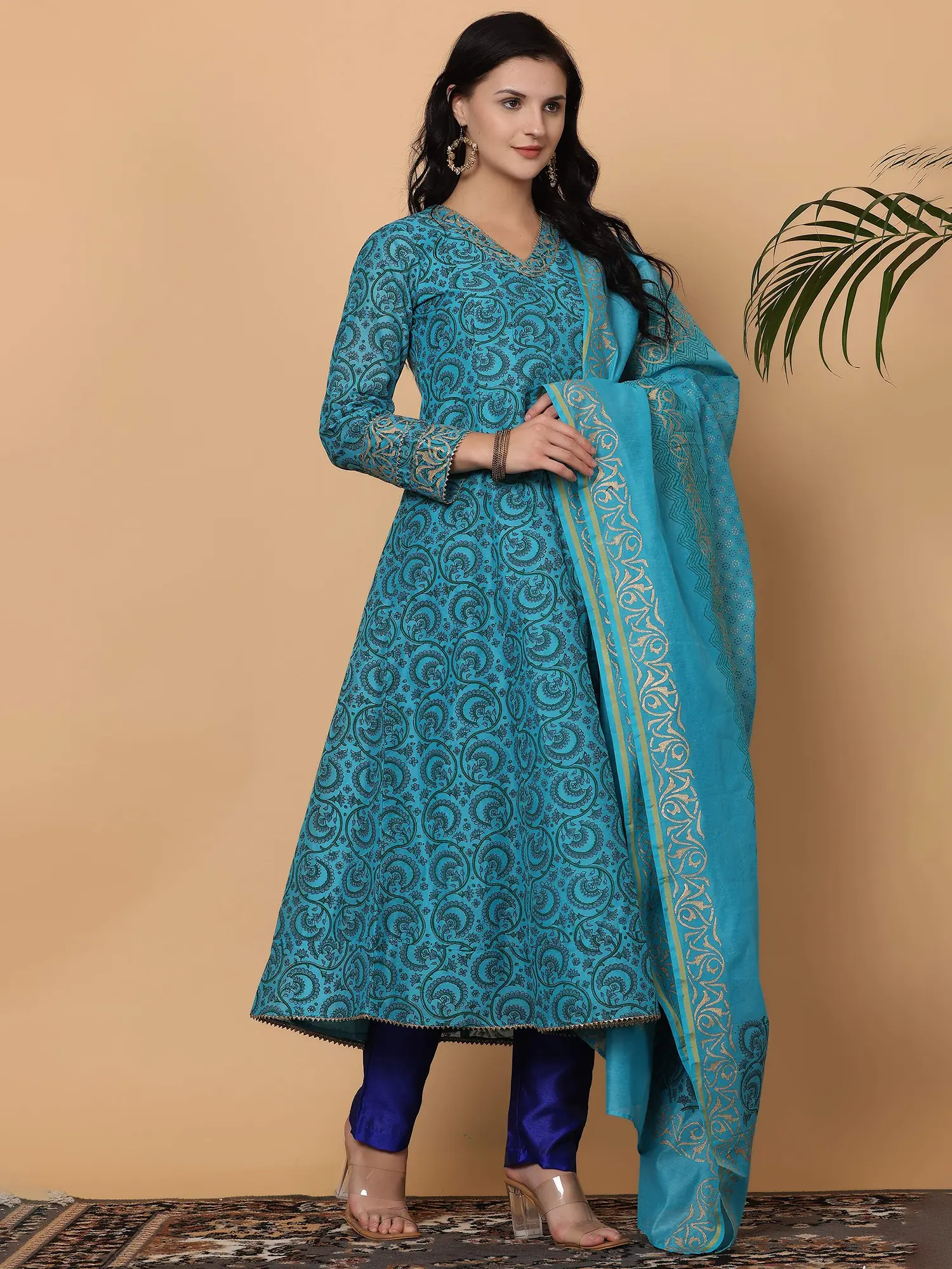 Royal Blue Block Print Silk Anarkali Suit Set With Chanderi Dupatta Ethnic Party Wear for Women