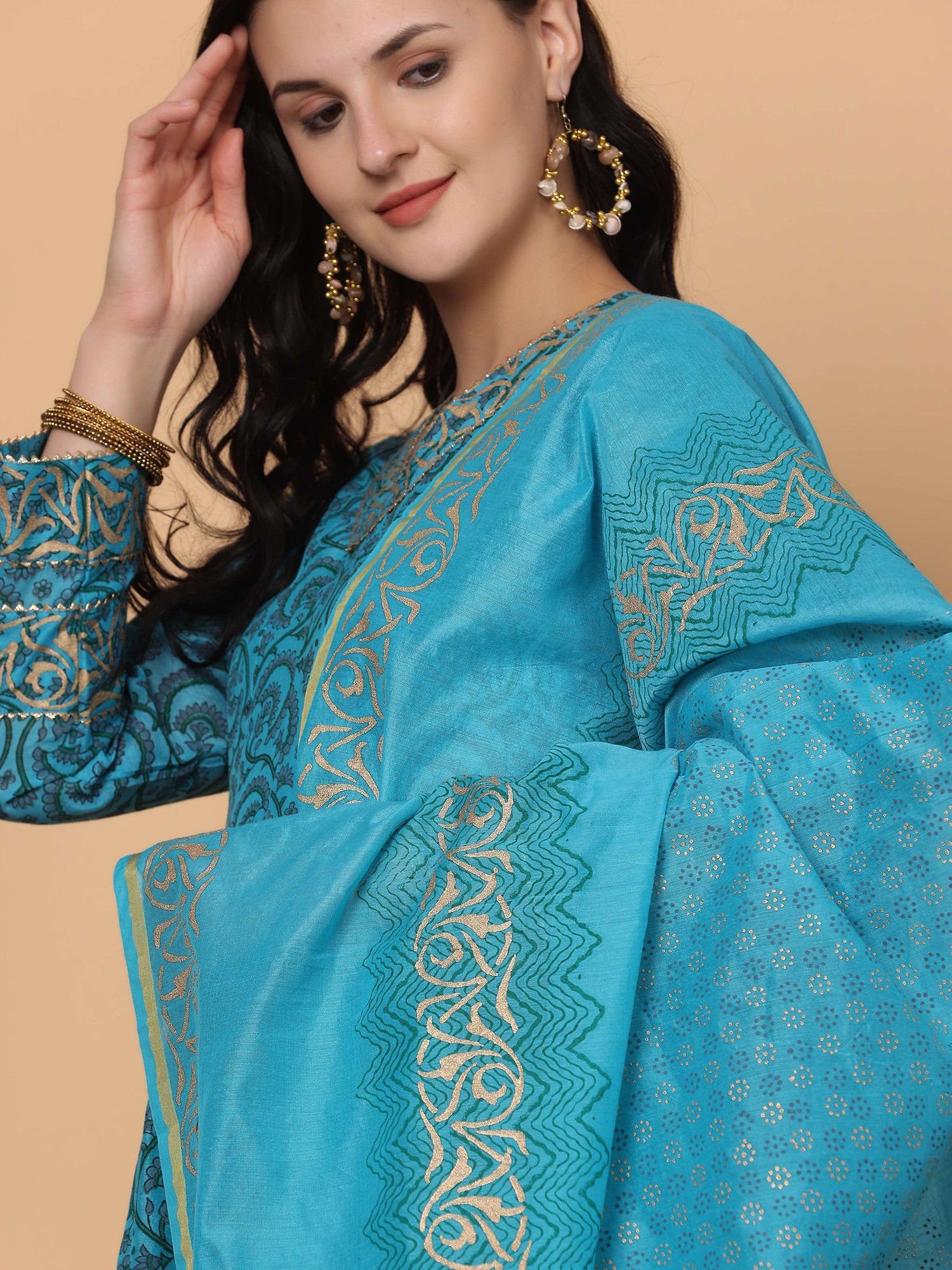Turquoise Chanderi Block Print Kurta Set Paired With Silk Bottoms And Printed Chanderi Dupatta
