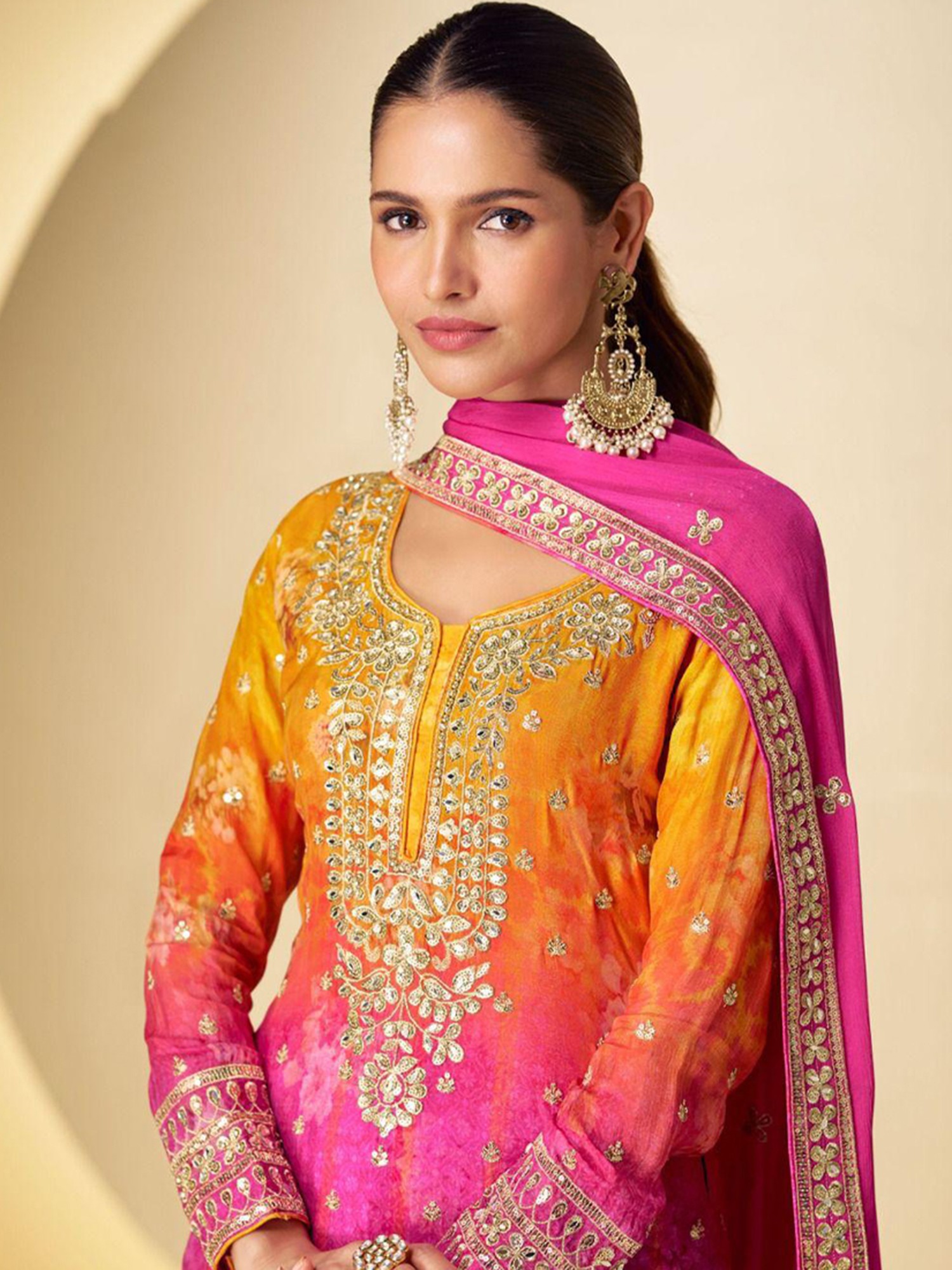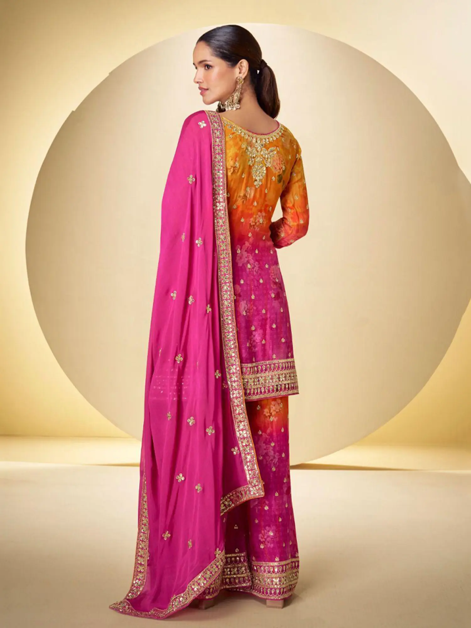 The vibrant gradient, transitioning from a warm marigold to a rich fuchsia, creates a captivating visual effect. Delicate floral patterns bloom across the fabric, interspersed with subtle shimmer that catches the light with every movement. The accompanying dupatta is generously sized, edged with the same exquisite embroidery found on the main garment, providing a complete and harmonious aesthetic. This set, in a size Medium (38), is tailored for a flattering and comfortable fit.