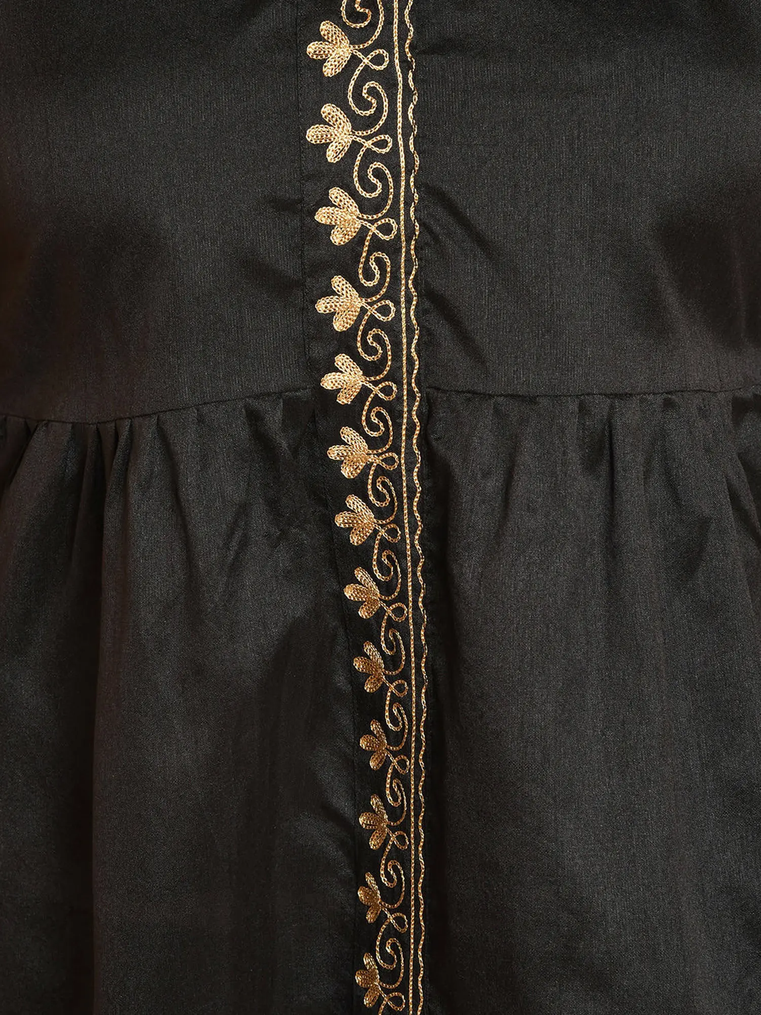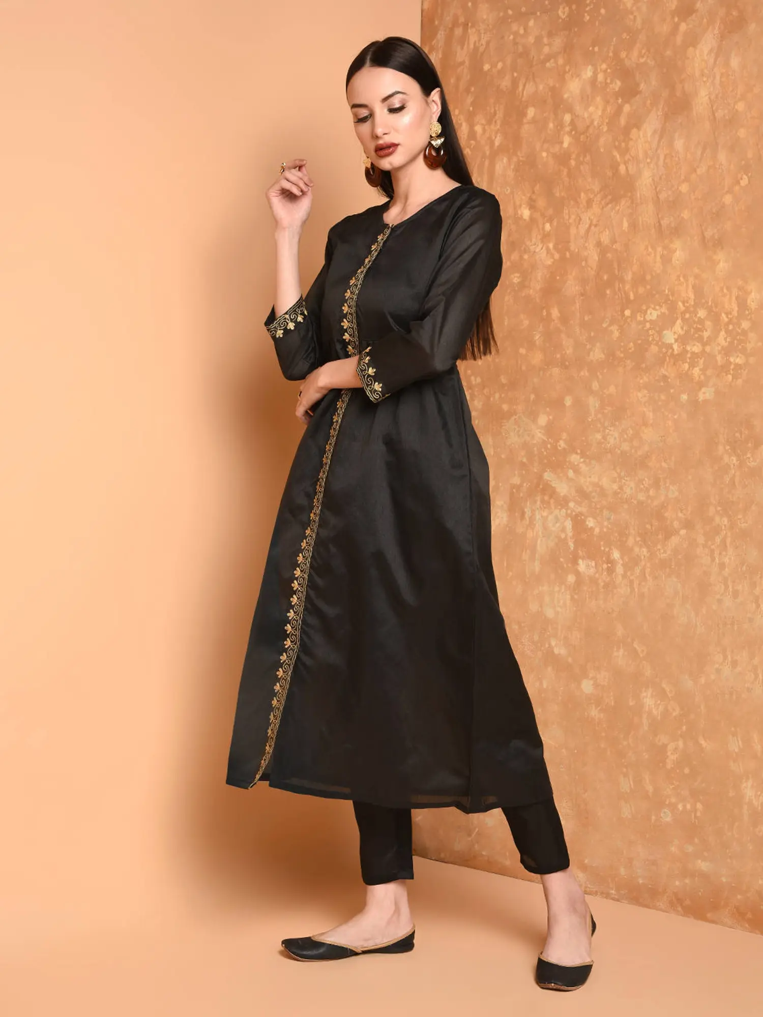 This black embroidered silk kurta set is a testament to enduring style. It's an ideal selection for weddings, festive gatherings, formal dinners, or any event where you wish to make a sophisticated statement. Pair it with your favorite statement earrings, a chic clutch, and elegant footwear to complete the look. The timeless appeal of black and gold ensures that this set will remain a cherished part of your wardrobe for seasons to come, offering endless styling possibilities for a variety of celebratory moments. Embrace the allure of tradition with a touch of modern refinement.